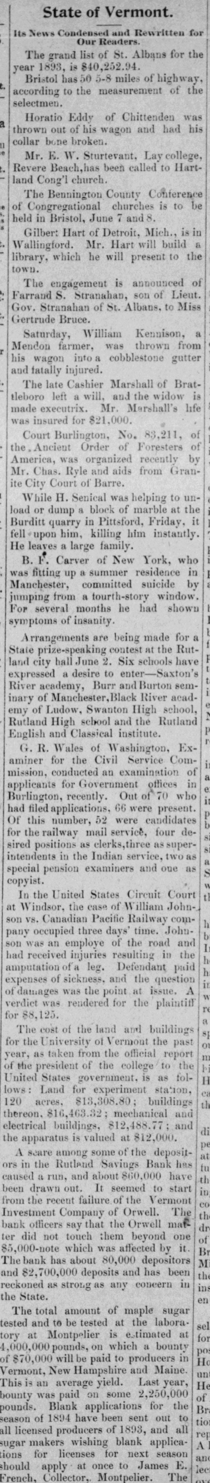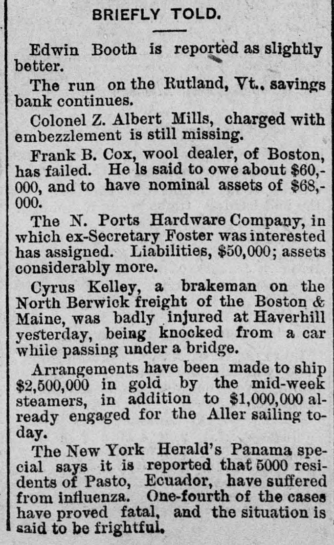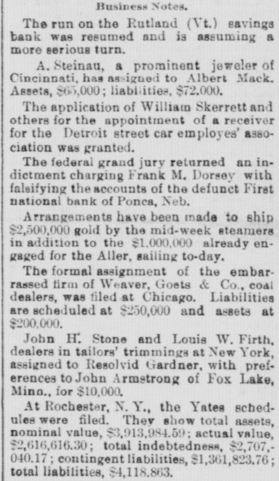 NEWS NUGGETS. Brought by the Wires From the North East South and West. run on the Rutland, Vt. Savings bank The was resumed Monday morning official report on the trial trip of at the 21 cruiser The New York places her speed knots. B. Cox, wool dealer. 568 said Atlan- to Frank Boston. has failed. He 18 nominal owe tic ave., about $60,000 and to have assets of $68,000. New Jenkins, the health officer at from Dr. Monday received a cablegram cholera York Dr. Nash at Hamburg, stating the has broken out there Smith says Edwin Booth passed morn- a Dr and was better Monday Saturday good night The reports of his relapse, ing. were greatly exagerated. been officially declared at to Ham have It has clerk who was supposed Sunday been burg suffering that a from diarrhar died night of Asiatic cholera. N. Ports Hardware Co., Fostoria, was The which ex-Secretary Foster 850,000; Ohio, has assigned. Liabilities terested assets in considerably more. his wife William Grabam and the Central Rev. walking to their home on were while track near Milner. Ga. Sunday I overtaken R. R. by a train and crushed to death Arrangements have been made steamers to ship gold by the mid-week 81,000. $2,500,000 York in addition to the sailing 000 from already New engaged for the Aller Tuesday Lackawanna Steel Company's 8125 north The at Seranton, Pa. was damaged works will I 000 mill by fire to Monday. shut down The for entire several months out of work. be Twelve obliged hundred hands will be thrown charges against Bishop Boacum Neb., Formal Catholic diocese of Lincoln, Satoll of the been forwarded to Mgr. incon have is charged with tyranny of the t petence, The bishop disobedience and violation Baltimore degree. f body of Charles S. Rogers. works presi it dent The of the Northwestern suicide cordage on the I St. Paul, has who been committed found in the Mississipp the n 19th inst., two and one-half miles below death. " river, bridge from which he leaped to his t of afternoon A. A. Zimmerman two Sunday New York Athletic Club, won the bicycle race# at Paris. He de at 500 the feated amateur Vogt, the Scotch champion, race defeat and in the 1000 metres of Ireland n metres, Ducross, the champion of t and ed both Dervel, the amateur champion France. schedules of G. A. Yates. N.Y. whole who The coal merchant, Rochester, The sole failed were filed Monday value recently total assets of the nominal total of e show actual value. 82.616.616; contingent $3,913,984, 82,757,040 $4,118. bilities, indebtedness, $1,361,823; total liabilities e f 863. There are at least ten thousand homeles Moor people in East Carroll, . and hungry West Carroll and Madison privations parish. to house, and the suffering and With Louisiana, undergoing are appalling. elevations. the In they exception are of a few small of the d whole the of the northeastern portion state is under water. f o The heaviest rainfall in many Mississippi years oc a throughout Tennessee. Saturday night a is t The whole country is to 1 curred Arkansas Sunday. and Louisiana done flooded the incalculable damage has been are out e All of the small streams rise in the h planters. banks and another big Francis and II Mississippi, of their Arkansas, St. y White rivers is expected. r, Guzman, the Nicaraguan minister that Dr. no official information States D has received desire the United country n. the Nicaraguans protectorate over that however, S. 8: to establish Guzman a is of the opinion. under Dr. will be the ultimate issue there of that such condition of affairs existing he saye the Nicaragua canal project, and te The connects the two countries, if the its y interests closely will be greatly enhanced e United States is given supremacy rs to night. at Roanoke, Ind., wife, Chris Saturday Haberkus murdered his 75 years then topher himself. Haberkus was a e killed his wife 70. She was a Catholic calling upon but to old. to Catholic women did call be be objected Two of the church women words d. her. after they had left some angry At mil and between the aged couple. Haberkum je passed while his wife was asleep. severed her night. her room and nearly to the bad and entered her body. He set fire his ay ee head then from killed himself by cutting his rs throat. the police court at Newbury port Albert Mills In Monday. Col. J. of the its Mass., with the embezzlement appear be charged Mills. did not put in an counsel he of A charges the ance Victoria capais was nor was issued he represented for Milla's embezzlement by arrent. A of he ve the warrant doubtful if any attempt will only 825, him outside the y, to it arrest is searched state to be made of Col. Mills was trac The residence as a matter of form. obtained. but no of Monday his whereabouts could be the great sire of trotting home race Dictator, died at Ashland. Ky. the & Son. of horses, Henry Clay MeDowell II. ful his owners. Lexington, of old age, Friday. bring by near foaled 30 years ago, and, Clars. by was Hambletonian. dam to Dax Rysdyk's Star. was a full brother 00 horap to beat Flora V ter, the Dictator was a #60 ol. American As s sire first wonderful Temple 48 a time. of race horses, having Juy progenitor in the list, including ly and daughters 2.10 trotting and 2.06 1.4 pacing Nancy ow Eye-See, He was also the sire of the dam of Hanks, 2.04. as he