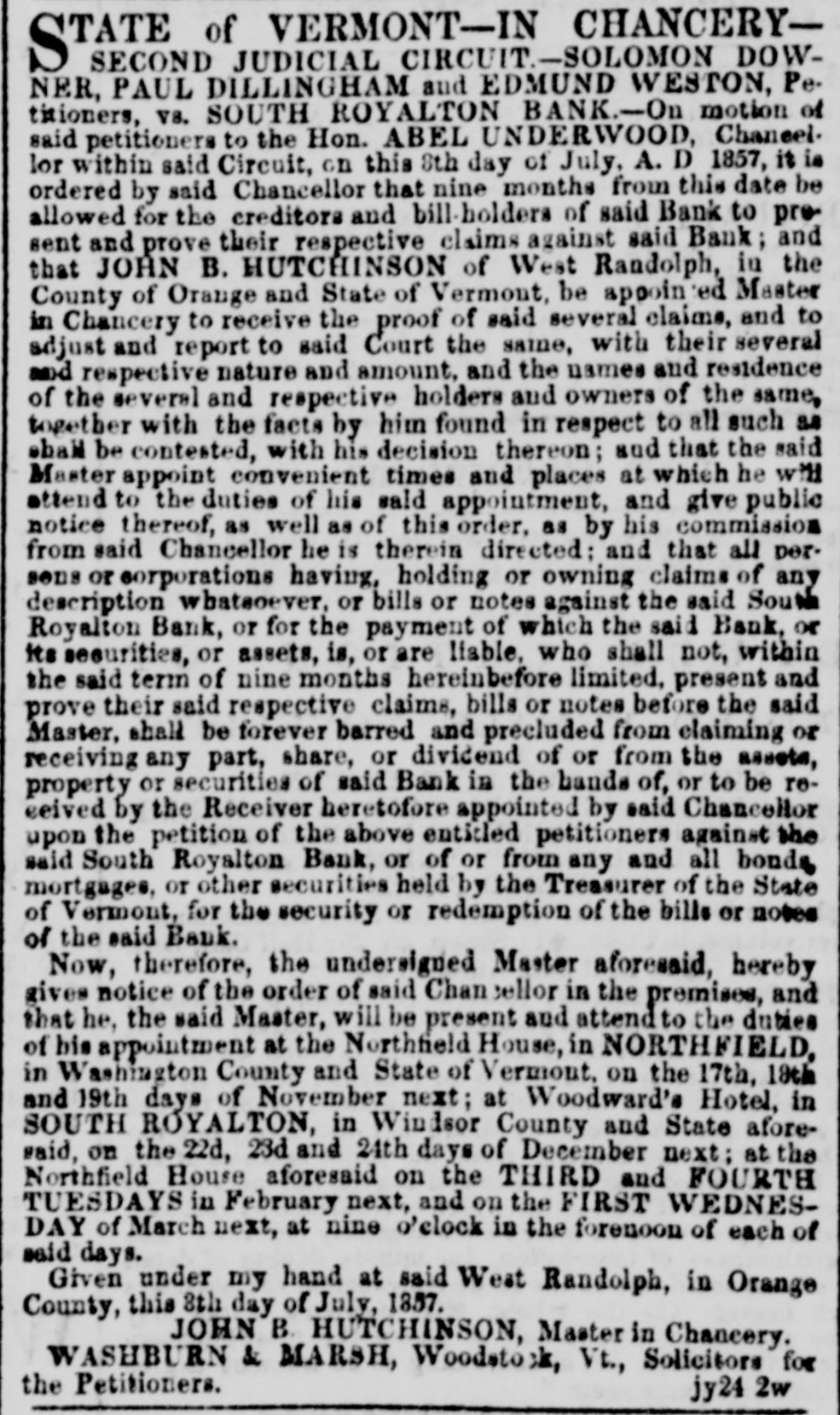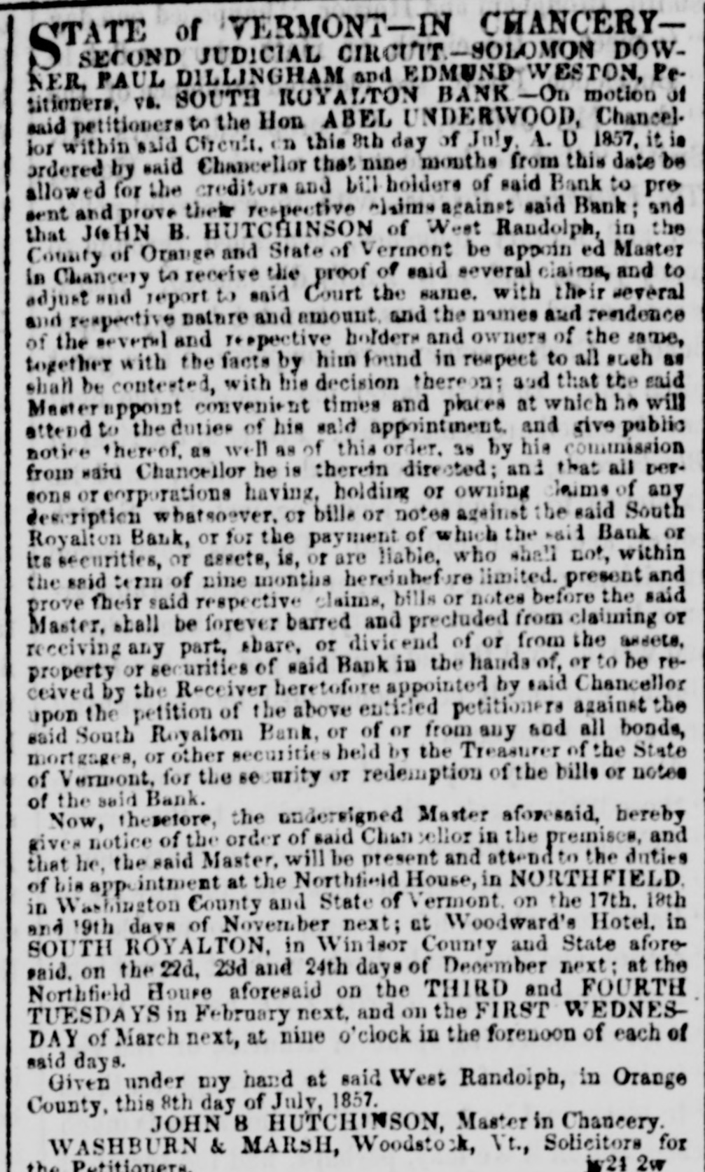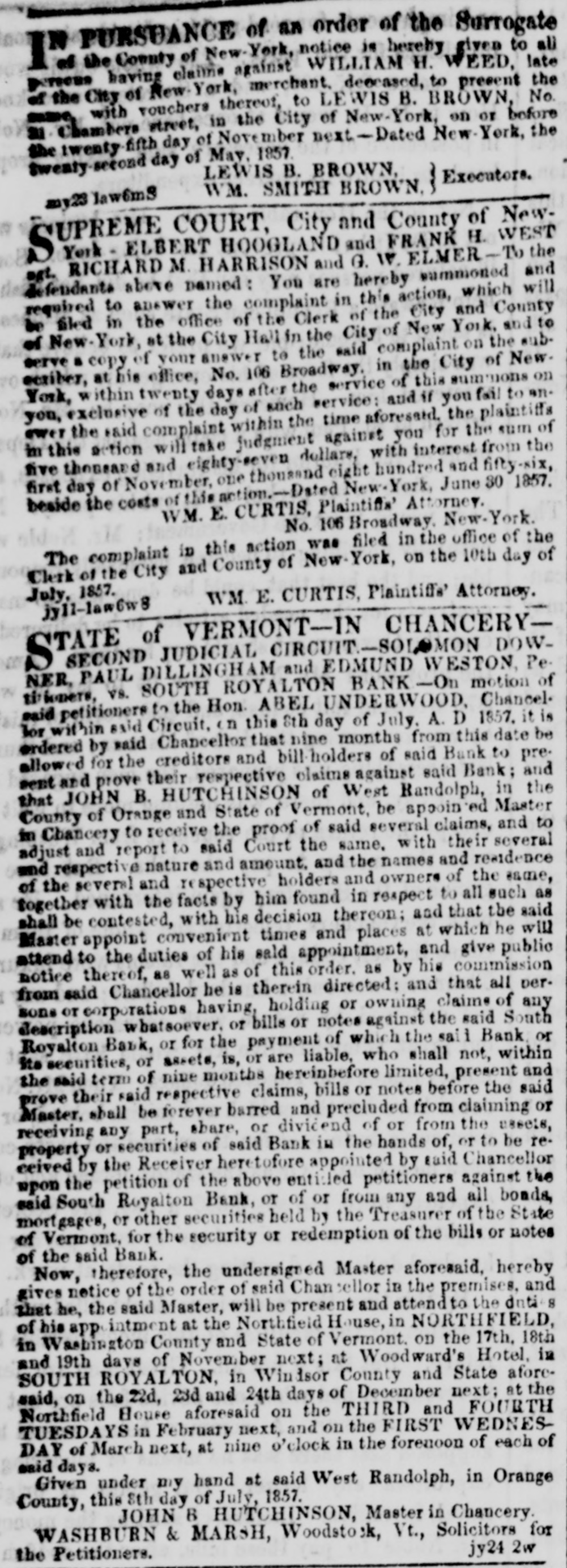 PURSUANCE of an order of the Surrogate the County of New-York, notice in hereby given to all P. having claims against WILLIAM H. WEED, late the persons of the City of New York, merchant. deceased, to present No. vouchers thereof, to LEWIS B. BROWN, Chambers with street, in the City of New-York, on or before the the twenty day of November next-Dated New-York, twenty day of May, 1857. LEWIS B. BROWN, Executors. WM. SMITH BROWN, my23 law6mS CUPREME COURT, City and County of WEST NewELBERT HOOGLAND and FRANK H. the York RICHARD M. HARRISON and G. 1V, ELMER-To and mgt. defendants above named: You are hereby summoned will to answer the complaint in this action, and which County required filed in the office of the Clerk of the City and to be New-York, st the City Hall in the City of New York, the subof a of answer to the said complaint on of New. ecriber, serve copy at his office, your No. 106 Broadway, in the City summons on within twenty days after the service of this fail to anYork, exclusive of the day of such service: and if you the plaintiffs you, said complaint within the time aforesatd. for the sum of swer the you from the in <<<<<<<<<<<<<<<<<<<<<<<<< with interest and fifty-six, five <<<<<<<<<<<<<<<<<<<<<<<<< <<<<<<<<<<<<<<<<<<<<<<<<< <<<<<<<<<<<<<<<<<<<<<<<<< <<<<<<<<<<<<<<<<<<<<<<<<< <<<<<<<<<<<<<<<<<<<<<<<<< June 30 1857. first beside the costs of this Attorney. WM. E. CURTIS, Plaintiffs' No. 106 Broadway. New-York. complaint in this action was filed in the the office 10th of the of Clerk The of the City and County of New-York, on day WM. E. CURTIS, Plaintiffs' Attorney. July Janew8 CHANCERYPe- of thioners, vs. motion said petitioners to the Hon. ABEL UNDERWOOD, Chancel. is for within said Circuit, on this 8th day of July, A. D 1857. it ordered by said Chancellor that nine months from this date be allowed for the creditors and bill-holders of said Bank to pre. sent and prove their respective claims against said Bank; and that JOHN B. HUTCHINSON of West Randolph, in the County of Orange and State of Vermont, be spooined Master in Chancery to receive the proof of said several claims, and to adjust and report to said Court the same, with their several and respective nature and amount. and the names and residence of the several and respective holders and owners of the same, together with the facts by him found in respect to all such as shall be contested, with his decision thereon; and that the said Master appoint convenient times and places at which he will attend to the duties of his sald appointment, and give public notice thereof, as well as of this order. as by his commission from said Chancellor he is therein directed: and that all persons or corporations having, holding or owning claims of any description whatsoever. or bills or notes against the said South Royalton Bank, or for the payment of which the sail Bank. or Ste securities, or assets, is, or are liable, who shall not, within the said term of nine months hereinbefore limited, present and prove their said respective claims, bills or notes before the said Master, shall be forever barred and precluded from claiming or receiving any part, abare, or dividend of or from the ussets, property or securities of said Bank in the hands of, or to be reevived by the Receiver heretofore appointed by said Chancellor upon the petition of the above entibled petitioners against the said South Royalton Bank, or of or from any and all bonds, mortgages, or other securities held by the Treasurer of the State of Vermont, for the security or redemption of the bills or notes of the said Bank. Now, therefore, the undersigned Master aforesaid, hereby gives notice of the order of said Chan sellor in the premises, and that he, the said Master, will be present and attend to the dnties 8 of his app intment at the Northfield House, in NORTHFIELD, in Washington County and State of Vermont. on the 17th, 18th and 19th days of November next; at Woodward's Hotel, in SOUTH ROYALTON, in Windsor County and State aforesaid, on the 22d, 23d and 24th days of December next; at the Northfield House aforesaid on the THIRD and FOURTH TUESDAYS in February next, and on the FIRST WEDNESDAY of March next, at nine o'clock in the forenoon of each of said days. Given under my hand at said West Randolph, in Orange County, this 8th day of July, 1857. JOHN B HUTCHINSON, Master in Chancery. WASHBURN & MARSH, Woodstock, Vt., Solicitors for jy24 2w the Petitioners.