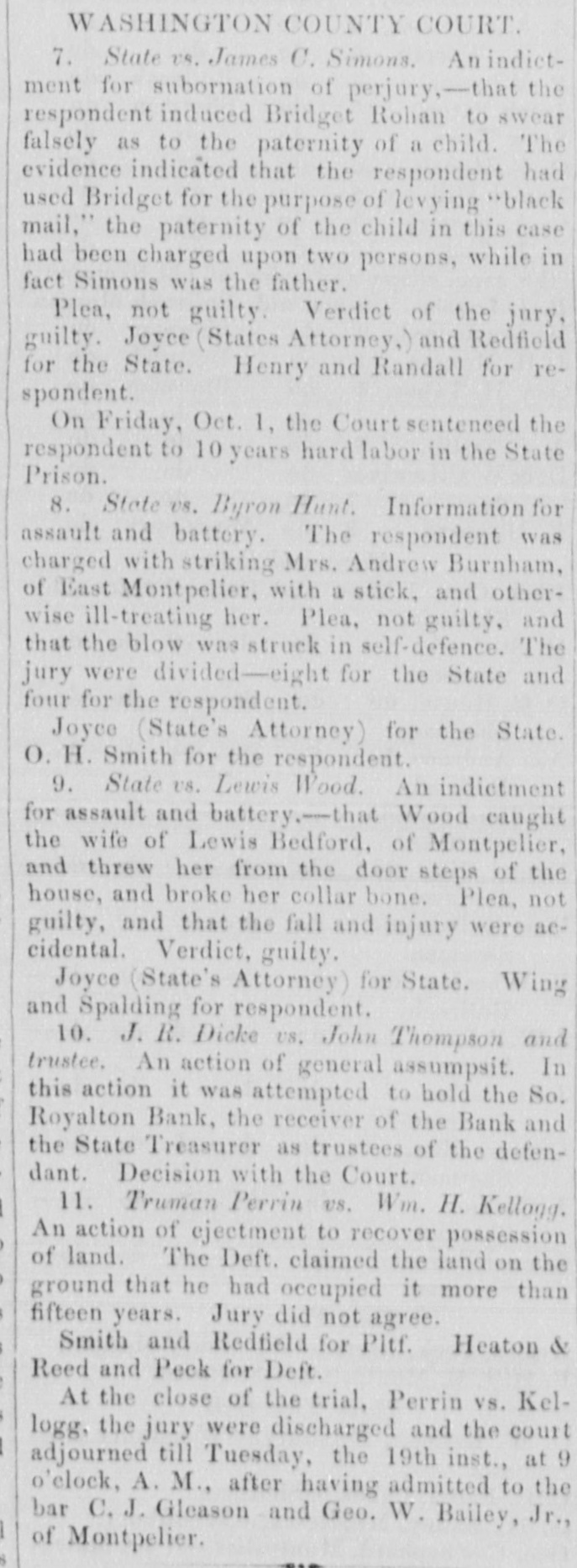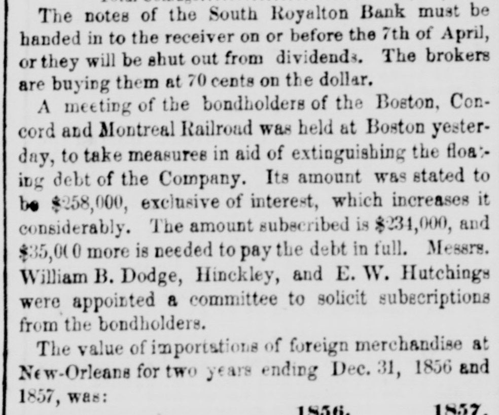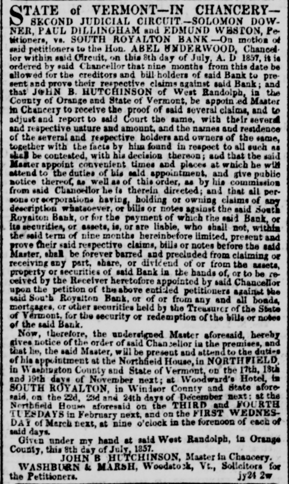 PURSUANCE of an order of the Surrogate the County of New-York, notice in hereby given to all P. having claims against WILLIAM H. WEED, late the persons of the City of New York, merchant. deceased, to present No. vouchers thereof, to LEWIS B. BROWN, Chambers with street, in the City of New-York, on or before the the twenty day of November next-Dated New-York, twenty day of May, 1857. LEWIS B. BROWN, Executors. WM. SMITH BROWN, my23 law6mS CUPREME COURT, City and County of WEST NewELBERT HOOGLAND and FRANK H. the York RICHARD M. HARRISON and G. 1V, ELMER-To and mgt. defendants above named: You are hereby summoned will to answer the complaint in this action, and which County required filed in the office of the Clerk of the City and to be New-York, st the City Hall in the City of New York, the subof a of answer to the said complaint on of New. ecriber, serve copy at his office, your No. 106 Broadway, in the City summons on within twenty days after the service of this fail to anYork, exclusive of the day of such service: and if you the plaintiffs you, said complaint within the time aforesatd. for the sum of swer the you from the in <<<<<<<<<<<<<<<<<<<<<<<<< with interest and fifty-six, five <<<<<<<<<<<<<<<<<<<<<<<<< <<<<<<<<<<<<<<<<<<<<<<<<< <<<<<<<<<<<<<<<<<<<<<<<<< <<<<<<<<<<<<<<<<<<<<<<<<< <<<<<<<<<<<<<<<<<<<<<<<<< June 30 1857. first beside the costs of this Attorney. WM. E. CURTIS, Plaintiffs' No. 106 Broadway. New-York. complaint in this action was filed in the the office 10th of the of Clerk The of the City and County of New-York, on day WM. E. CURTIS, Plaintiffs' Attorney. July Janew8 CHANCERYPe- of thioners, vs. motion said petitioners to the Hon. ABEL UNDERWOOD, Chancel. is for within said Circuit, on this 8th day of July, A. D 1857. it ordered by said Chancellor that nine months from this date be allowed for the creditors and bill-holders of said Bank to pre. sent and prove their respective claims against said Bank; and that JOHN B. HUTCHINSON of West Randolph, in the County of Orange and State of Vermont, be spooined Master in Chancery to receive the proof of said several claims, and to adjust and report to said Court the same, with their several and respective nature and amount. and the names and residence of the several and respective holders and owners of the same, together with the facts by him found in respect to all such as shall be contested, with his decision thereon; and that the said Master appoint convenient times and places at which he will attend to the duties of his sald appointment, and give public notice thereof, as well as of this order. as by his commission from said Chancellor he is therein directed: and that all persons or corporations having, holding or owning claims of any description whatsoever. or bills or notes against the said South Royalton Bank, or for the payment of which the sail Bank. or Ste securities, or assets, is, or are liable, who shall not, within the said term of nine months hereinbefore limited, present and prove their said respective claims, bills or notes before the said Master, shall be forever barred and precluded from claiming or receiving any part, abare, or dividend of or from the ussets, property or securities of said Bank in the hands of, or to be reevived by the Receiver heretofore appointed by said Chancellor upon the petition of the above entibled petitioners against the said South Royalton Bank, or of or from any and all bonds, mortgages, or other securities held by the Treasurer of the State of Vermont, for the security or redemption of the bills or notes of the said Bank. Now, therefore, the undersigned Master aforesaid, hereby gives notice of the order of said Chan sellor in the premises, and that he, the said Master, will be present and attend to the dnties 8 of his app intment at the Northfield House, in NORTHFIELD, in Washington County and State of Vermont. on the 17th, 18th and 19th days of November next; at Woodward's Hotel, in SOUTH ROYALTON, in Windsor County and State aforesaid, on the 22d, 23d and 24th days of December next; at the Northfield House aforesaid on the THIRD and FOURTH TUESDAYS in February next, and on the FIRST WEDNESDAY of March next, at nine o'clock in the forenoon of each of said days. Given under my hand at said West Randolph, in Orange County, this 8th day of July, 1857. JOHN B HUTCHINSON, Master in Chancery. WASHBURN & MARSH, Woodstock, Vt., Solicitors for jy24 2w the Petitioners.