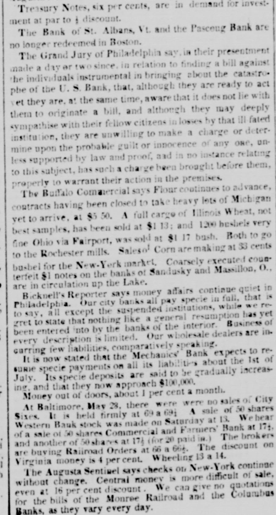 Treasury Notes, six per cents, are in demand for investment at par to I discount. The Bank of St. Albans, VL and the Pascoug Bank are no longer redeemed in Boston. The Grand Jury of Philadelphia say, in their presentment made a day or two since. in relation to finding a bill against the individuals instrumental in bringing about the catastro. phe of the U. S. Bank, that, although they are ready to act vet they are. at the same time, aware that it does not lie with them to originate a bill. and although they may deeply sympathise with their fellow citizens in losses by that ill fated institution, they are unwilling to make a charge or determine upon the probable guilt or innocence of any ORE, onless supported by law and proof, and in no instance relating to this subject, has such a charge been brought before them, properly to warrant their action in the premises. The Buffalo Commercial says Flour continues to advance, contracts having been closed to take heavy lets of Michigan yet to arrive. at A full carge of Illinois Wheat, not best samples, has been sold at $1 13: and 1200 heshels very fine Ohio via Fairport, was sold at $1 17 bush. Both to go to the Rochester mills. Saleso Corn are making at S3 cents busbel for the New-York market Coarsely executed counterfeit $1 notes on the banks of Sandusky and Massillon, O., are in circulation up the Lake. Bicknell's Reporter says money adfairs continue quiet in Philadelphia. Our city banks all pay specie in full, that is to say, all except the suspended institutions, while we regret to state that nothing like a general resumption has yet been entered into by the banks of the interior. Business of every description is limited. Our wholesale dealers are in. curring few liabilities, comparatively speaking. It is now stated that the Mechanics' Bank expects to resurie specie payments OM all its liabilities about the 1st of July. Its specie deposits are said to be gradually increasing, and that they now approach $100,000. Money out of doors, about I per cent a month. At Baltimore, May 28. there were were DO sales of City Sixes. It is held firmly at 69 a 691 A sale of 50 shares Western Bank stock was made on Saturday at 13. We hear of a sale of 50 shares Commercial and Farmers' Bank at 17t. and another of 50 shares at 17) (for 20 paid in. The broker are buving Raiiroad Orders at 66 a 664. The discount on Virginia money is 4 per cent. Wheeling IS a 14. The Augusta Sentiuel says checks on New-York continue without change. Central money is more difficult of sale, even at 16 per cent discount. We caa give no quotations for the bills of the Monree Railroad and the Columbus Banks, as they vary every day.