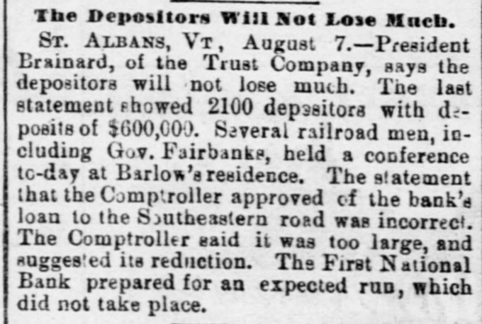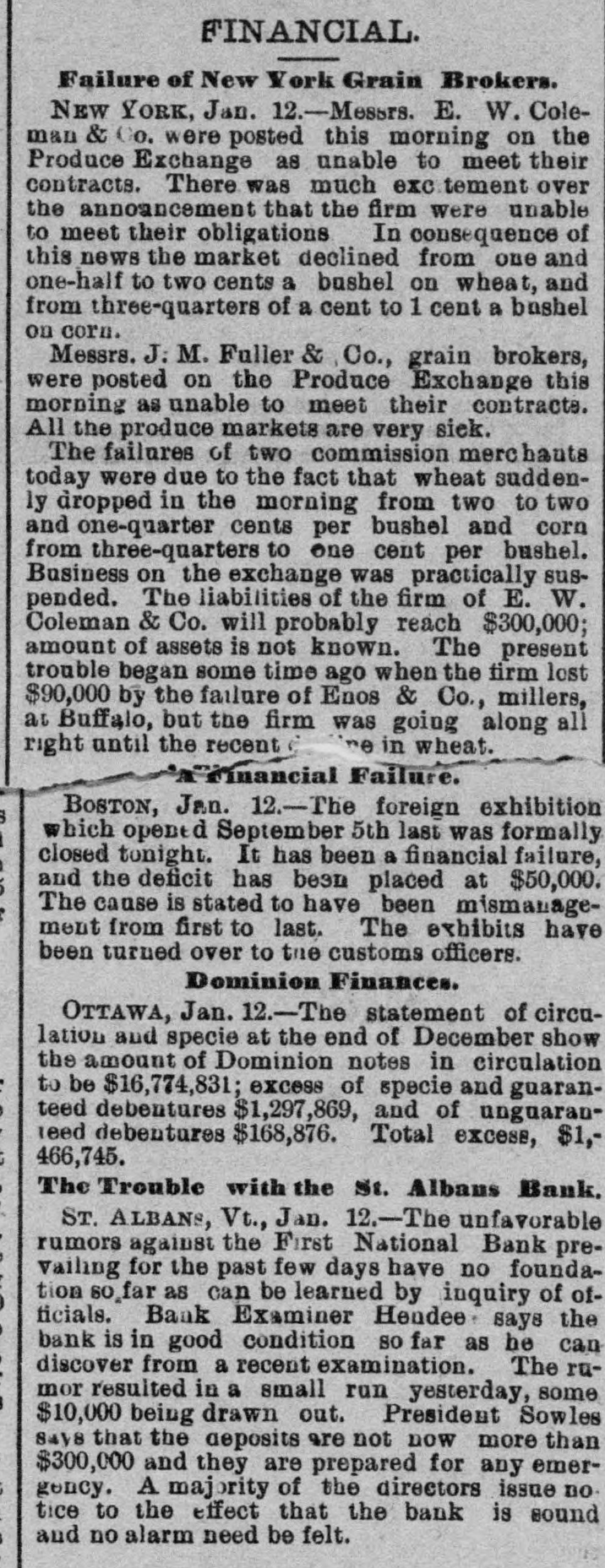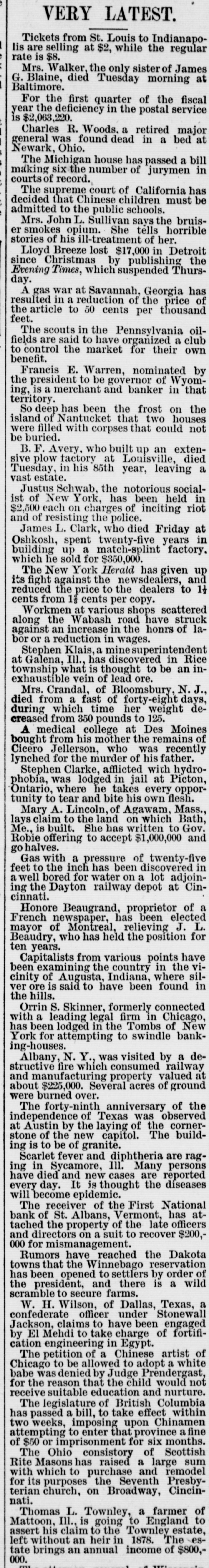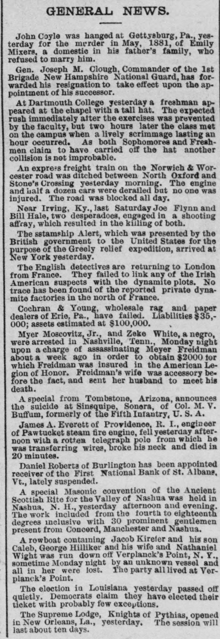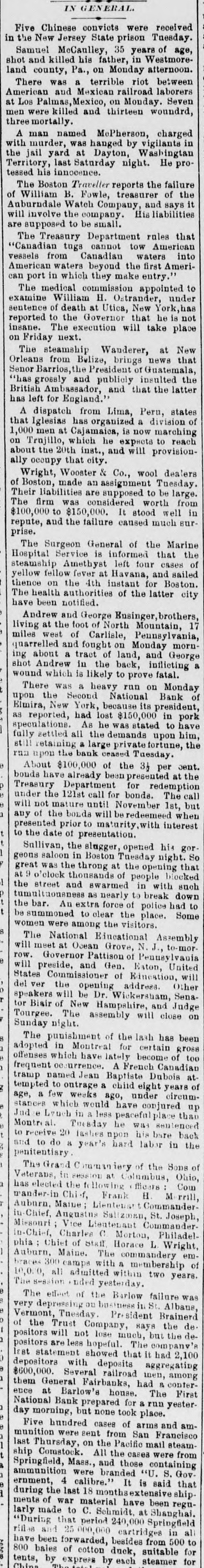 IN GENERAL Chinese conviots were Tuesday. received in Five the New Jersey State prison age, McCanlley, 35 years of Samuel and Westmorekilled his father, in atternoon. shot county, Pa., on Monday land a terrible riot between There was and Mexican railroad laborers Seven American Palmas, Mexico, on Monday. woundrd, men were at Los killed and thirteen three mortally. named MoPherson, charged in A man murder, was hanged by vigilants with yard at Dayton, Washingtan He prothe Territory, jail last Saturday night. tessed his innocence. The Boston Traveller reports the of failure the William B. Fowle, treasurer and says of Auburudale Watch Company, Hialiabilities it will l involve the company. are supposed to be small. The Treasury Department rules American that Canadian "Canadian tugs cannot tow waters into American vessels from waters beyond the first American in which they make entry." port medical commission appointed to The William H. Ostrander, under examine of death at Utica, New York,ha is not sentence to the Governor that he place reported insane. The execution will take on Friday next. The steamship Wanderer, at New that from Belize, brings Quatemala, news Orleans Barrios, the President of the Senor grossly and publicly insulted latter British "has Ambassador, and that the has left for England. A dispatch from Lima, Peru, division states Iglesias has organized a 1,000 that men at Cajamaica, is now marching reach Trujillo, which he expects to on about the 20th inst., and will provisionally occupy that city. Wright, Wooster & Co., wool dealers Boston, made an assignment Tuesday. be large. of Their liabilities are supposed to from firm was considered worth in The $100,000 to $150,000. It stood well surrepute, and the tailure caused much prise. The Surgeon General of the that Marine the Service is informed of steamship Hospital Amethyat left four cases sailed yellow fellow fever at Havana, and Boston. on the 4th instant for thence The health authorities of the latter city have been notified. Andrew and George Ensinger brothers, 17 at the toot of North Mountain, miles living west of Carliale, Pennsylvania, quarrelled and fought on Monday George mornabout a tract of land, and a ing Andrew in the back, inflicting shot wound which is likely to prove fatal. There was a heavy run on Monday of Second National Bank upon the New York, because its president, Elmira, reported, had lost $150,000 in have pork as As he was stated to him, fully speculations. settled all the demands upon the still retaining a large private tortune, run upon the bank ceased Tuesday. About $100,000 of the 31 per sent. the bouds have already been presented at Treasury Department for redemption call under the 121st call for bonds. The but will not mature until November 1st, when of the bonds will be redeemeed interest any presented prior to maturity, with to the date of presentation. Sallivan, the slugger, opened his gorgeous saloon in Boston Tuesday night. that So great was the throng at the opening blocked ) at 9 o'clock thousands of people with such street and swarmed in the tumultuousness as nearly to break down to t the bar. An extra force of police had Some be summoned to clear the place. 8 women were among the visitors. The National Eincational Assembly will meet at Ocean Grove, N. J., to-morGovernor Pattison of Pennsylvania United row. will preside, and Gen. Exton, States Commissioner of Edicetion, Other will : del ver the opening address. speakers will be Dr. Wickersham, SenaBiair of New Hampshire, and Judge Tourgee. tor The assembly will close on Sunday night. The punishment of the lash has been adopted in Montreal for certain of gross too offenses which have lately become frequent occurrence. A French Canadian atnamed Jean Baptiste Dubois of tempted tramp to outrage a child eight years circuma few weeks ago, under age, stances which would have conjured up Jnd Lvuch in a less peaceful place than Montro al. Tuesday he was sentenced receive 20 tashes upon his bare back the and to to do & year's hard labor in penitentiary The Grand iery of the Sons of Vateraus, in session Columbus, Ohio, Cow has elected the Howing fliears rander-in Chief, Frank H Marrill, Auburn, Maine Lienteuat CommanderChief, Augustns Salizman, St. Joseph, Missouri ; Vice Lieutebant Commanderin-Chief, Charle C Morton, Philadelphia Chief of Staff Horace L Wright, Auburn, Maine. The commandery embraces 300 camps with a membership of 10,020, all admitted within two years. The session nded yesterday. The effect of the Barlow failure very depressing.ou usiness in St. Albaus, Vermont, Theaday sident Brainerd de of the Trust Company, says the depositors will not lose much, but the positors are less hopeful. The company's last statement showed that it had 2,100 depositors with deposits aggregating $600,000. Several railroad men, among them General Fairbanks, had & conterat Barlow's house. The First ence National Bank prepared for a run yesterday morning, but none took place. Five hundred cases of arms and ammunition were sent from San Francisco last Thursday, on the Pacific mail steamship Comstock. All the cases were from Springfield, Mass., and those containing ammunition were branded "U. S. Government, 4 calibre.' It is said that during the last 18 months extensive shipments of war material have been regularly made to C. Schmidt, at Shanghai. "During that period 240,000 Springfield all rillas and 25 000,000 cartridges in have been forwarded, besides from 500 for to 800 bales of cotton duck, suitable tents, by express by each steamer for That China