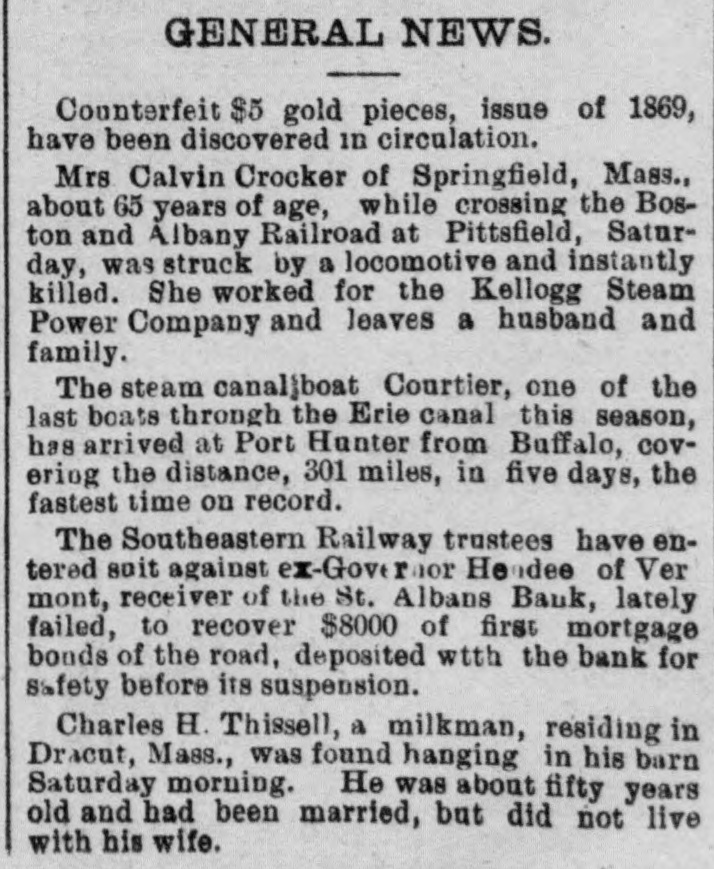 Gilman L. Grant of Stockbridge was crushed to death under a load of wood, Nov. 24.