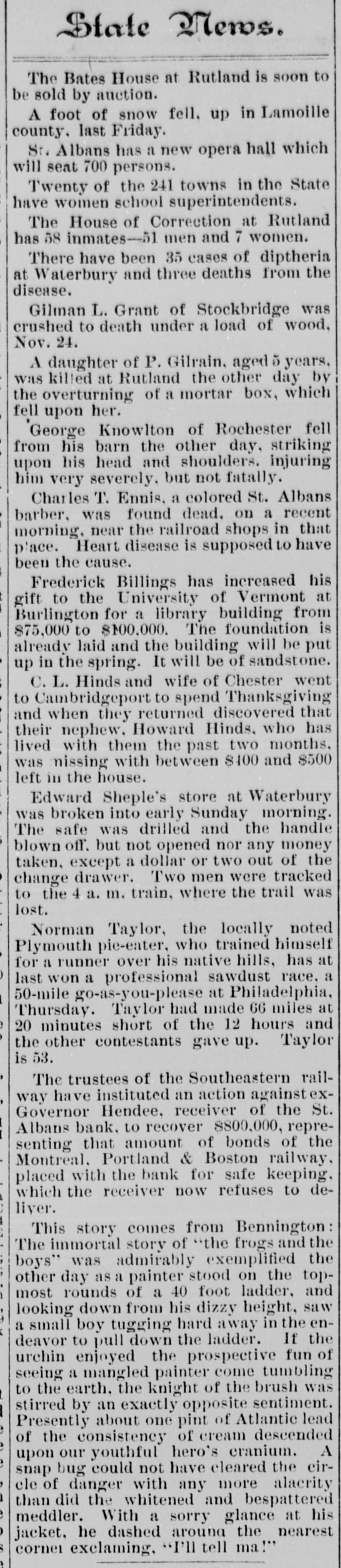 This story comes from Bennington: The immortal story of "the frogs and the boys" was admirably exemplified the other day as a painter stood on the top-most rounds of a 40 foot ladder, and looking down from his dizzy height, saw a small boy tugging hard away in the endeavor to pull down the ladder. If the urchin enjoyed the prospective fun of seeing a mangled painter come tumbling to the earth, the knight of the brush was stirred by an exactly opposite sentiment. Presently about one pint of Atlantic lead of the consistency of cream descended upon our youthful hero's cranium. A snap bug could not have cleared the circle of danger with any more alacrity than did the whitened and bespattered meddler. With a sorry glance at his jacket, he dashed around the nearest corner exclaming, "I'll tell ma!"