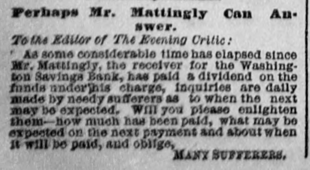 Perhaps Mr. Mattingly Can Answer. To the Editor of The Evening Critic: As some considerable time has elapsed since Mr. Mattingly, the receiver for the Washington Savings Bank, has paid a dividend on the funds underthis charge, inquiries are daily made by needy su forers as to when the next may be expected, will you please enlighten them-how much has been paid, what may be expected on the next payment and about when It will be paid, and oblige, MANY SUFFERERS,