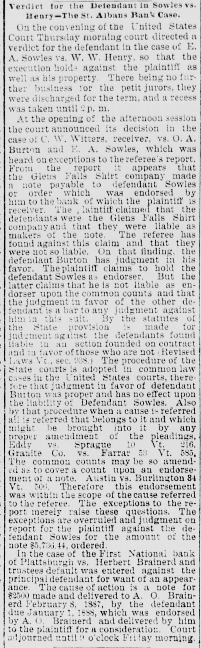 Verdict for the Defendant in Sowles vs. Henry-The St. Albans Bank Case. On the convening of the United States Court Thursday morning court directed a verdict for the defendant in the case of E. A. Sowles vs. W. W. Henry, so that the execution holds against the plaintiff as well as his property. There being no further business for the petit jurors, they were discharged for the term, and a recess was taken until p. m. At the opening of the afternoon session the court announced its decision in the case of C. W. Witters, receiver, vs. O. A. Burton and E. A. Sowles, which was heard on exceptions to the referee's report. From the report it appears that the Glens Falls Shirt company made a note payable to defendant Sowles or order which was endorsed by him to the bank of which the plaintiff is receiver. The laintiff claimed that the defendants were the Glens Falls Shirt company and that they were liable as makers of the note. The referee has found against this claim and that they were not so liable. On that finding, the defendant Burton has judgment in his favor. The plaintiff claims to hold the defendant Sowles as endorser. But the latter claims that he is not liable as endorser upon the common counts and that the judgment in favor of the other defendant is a bar to any judgment against him in this suit. By the statutes of the State provision is made for judgment against the defendants found liable in an action founded on contract and in favor of those who are not Revised Laws Vt., sec. 938.) The procedure of the State courts is adopted in common law cases in the United States courts, therefore that judgment in favor of defendant Burton was proper and has no effect upon the liability of Defendant Sowles. Also by that procedure when a cause is referred all is referred that belongs to it and which might be brought into it by any proper amendment of the pleadings, Eddy VS. Sprague 10 Vt. 216. Granite Co. vs. Farrar 53 Vt. 585, The common counts may be so amended as to cover a count upon an endorsement of a note. Austin vs. Burlington 34 Vt. 506. Therefore this endorsement was within the scope of the cause referred to the referee. The exceptions to the report merely raise these questions. The exceptions are overruled and judgment on report for the plaintiff against the defendant Sowles for the amount of the note $5,736.44, ordered. In the case of the First National bank of Plattsburgh VS. Herbert Brainerd and trustees default was entered against the principal defendant for want of an appearance. The cause of action is a note for $2500 made and delivered to A. O. Brainerd February 8, 1887, by the defendant due January 1, 1888, which was endorsed by A. O. Brainerd and delivered by him to the plaintiff for a consideration. Court adjourned until 9 o'clock Friday morning