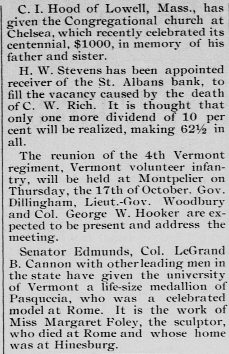 C.I. Hood of Lowell, Mass., has given the Congregational church at Chelsea, which recently celebrated its centennial, $1000, in memory of his father and sister. H. W. Stevens has been appointed receiver of the St. Albans bank, to fill the vacancy caused by the death of C. W. Rich. It is thought that only one more dividend of 10 per cent will be realized, making 62½ in all. The reunion of the 4th Vermont regiment, Vermont volunteer infantry, will be held at Montpelier on Thursday, the 17th of October. Gov. Dillingham, Lieut.-Gov. Woodbury and Col. George W. Hooker are expected to be present and address the meeting. Senator Edmunds, Col. LeGrand B. Cannon with otherleading men in the state have given the university of Vermont a life-size medallion of Pasquccia, who was a celebrated model at Rome. It is the work of Miss Margaret Foley, the sculptor, who died at Rome and whose home was at Hinesburg.