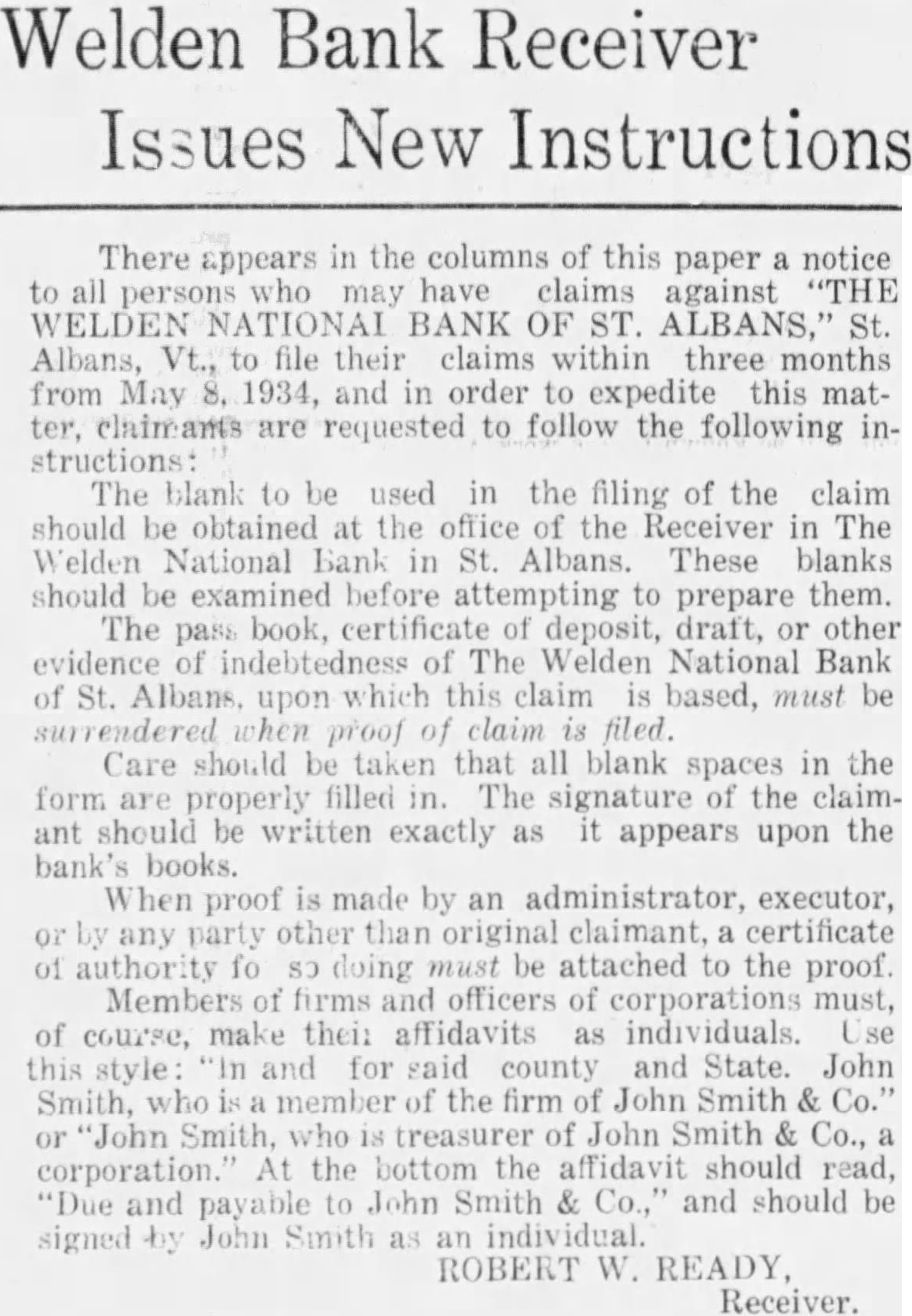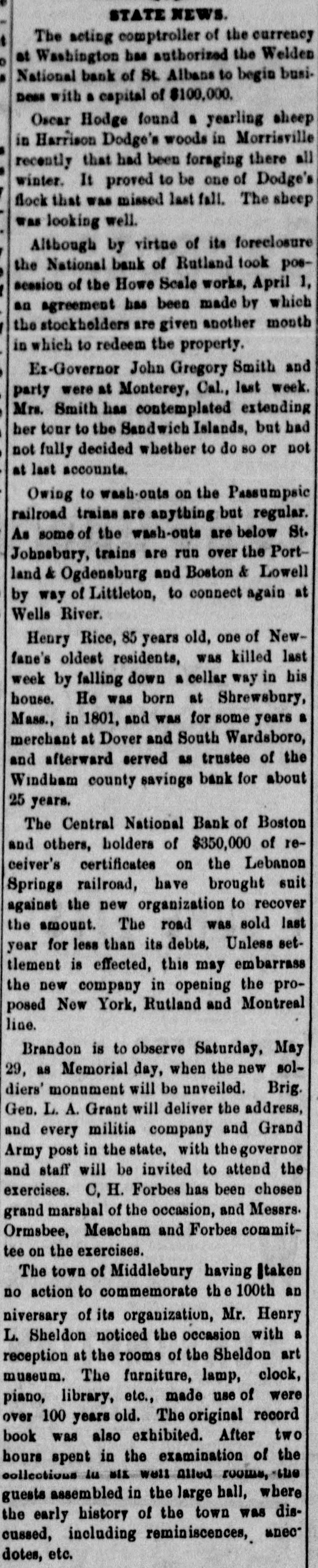 STATE NEWS. The acting comptroller of the currency at Washington has authorized the Welden National bank of St. Albans to begin busiDess with a capital of $100,000. Oscar Hodge found a yearling sheep in Harrison Dodge's woods in Morrisville recently that had been foraging there all winter. It proved to be one of Dodge's flock that was missed last fall. The sheep was looking well. Although by virtue of its foreclosure the National bank of Rutland took possession of the Howe Scale works, April 1, an agreement has been made by which the stockholders are given another month in which to redeem the property. Ex-Governor John Gregory Smith and party were at Monterey, Cal., last week. Mrs. Smith has contemplated extending her tour to the Sandwich Islands, but had not fully decided whether to do so or not at last accounts. Owing to wash-outs on the Passumpsic railroad trains are anything but regular. As some of the wash-outs are below St. Johnsbury, trains are run over the Portland & Ogdensburg and Boston & Lowell by way of Littleton, to connect again at Wells River. Henry Rice, 85 years old, one of Newfane's oldest residents, was killed last week by falling down a cellar way in his house. He was born at Shrewsbury, Mass., in 1801, and was for some years a merchant at Dover and South Wardsboro, and afterward served as trustee of the Windham county savings bank for about 25 years. The Central National Bank of Boston and others, holders of $350,000 of receiver's certificates on the Lebanon Springs railroad, have brought suit against the new organization to recover the amount. The road was sold last year for less than its debts, Unless settlement is effected, this may embarrass the new company in opening the proposed New York, Rutland and Montreal line. Brandon is to observe Saturday, May 29, as Memorial day, when the new soldiers' monument will be unveiled. Brig. Gen. L. A. Grant will deliver the address, and every militia company and Grand Army post in the state, with the governor and staff will be invited to attend the exercises. C, H. Forbes has been chosen grand marshal of the occasion, and Messrs. Ormsbee, Meacham and Forbes committee on the exercises. The town of Middlebury having Itaken no action to commemorate th e 100th an niversary of its organization, Mr. Henry L. Sheldon noticed the occasion with a reception at the rooms of the Sheldon art museum. The furniture, lamp, clock, piano, library, etc., made use of were over 100 years old. The original record book was also exhibited. After two hours spent in the examination of the collections Ass six well alled rooms, the guests assembled in the large hall, where the early history of the town was discussed, including reminiscences, anec dotes, etc.