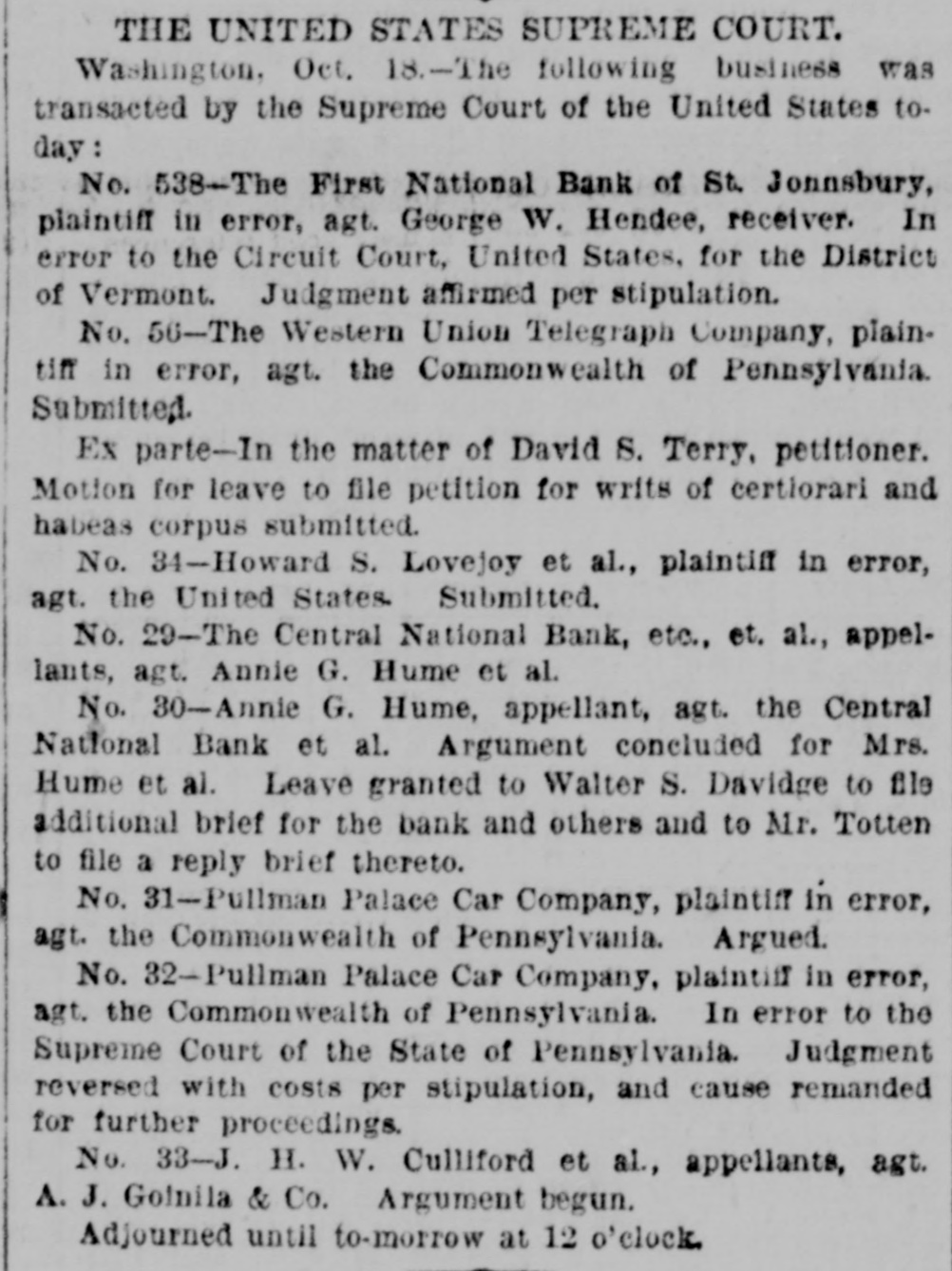 THE UNITED STATES SUPREME COURT. Washington, Oct. 18.-The following business was transacted by the Supreme Court of the United States today : No. 538-The First National Bank of St. Jonnsbury, plaintiff in error, agt. George W. Hendee, receiver. In error to the Circuit Court, United States, for the District of Vermont. Judgment affirmed per stipulation. No. 56-The Western Union Telegraph Company, plaintiff in error, agt. the Commonwealth of Pennsylvania Submitted. Ex parte-In the matter of David S. Terry, petitioner. Motion for leave to file petition for writs of certiorari and habeas corpus submitted. No. 34-Howard S. Lovejoy et al., plaintiff in error, agt. the United States. Submitted. No. 29-The Central National Bank, etc., et. al., appellants, agt. Annie G. Hume et al. No. 30-Annie G. Hume, appellant, agt. the Central National Bank et al. Argument concluded for Mrs. Hume et al. Leave granted to Walter S. Davidge to file additional brief for the bank and others and to Mr. Totten to file a reply brief thereto. No. 31-Pullman Palace Car Company, plaintiff in error, agt. the Commonwealth of Pennsylvania. Argued. No. 32-Pullman Palace Car Company. plaintiff in error, agt. the Commonwealth of Pennsylvania. In error to the Supreme Court of the State of Pennsylvania. Judgment reversed with costs per stipulation, and cause remanded for further proceedings. No. 33-J. H. W. Culliford et al., appellants, agt. A. J. Goinila & Co. Argument begun. Adjourned until to-morrow at 12 o'clock.