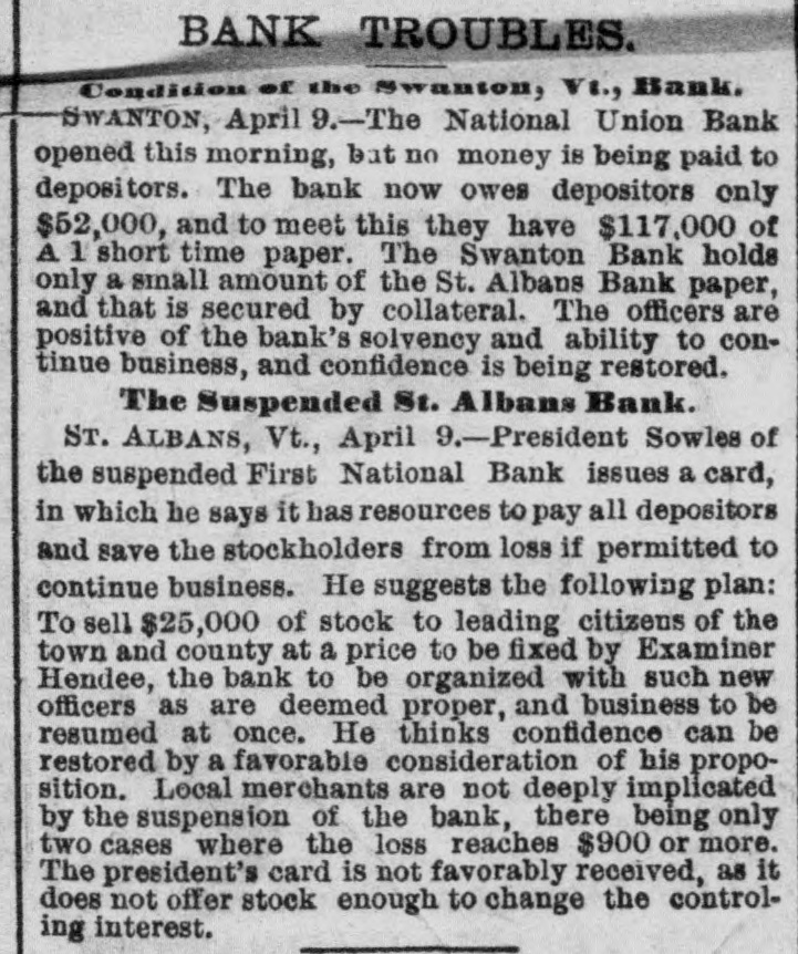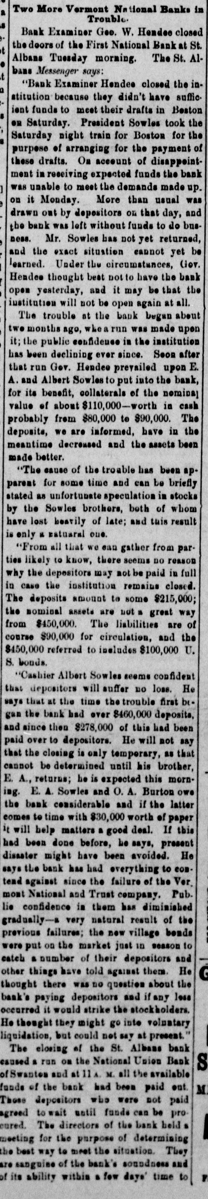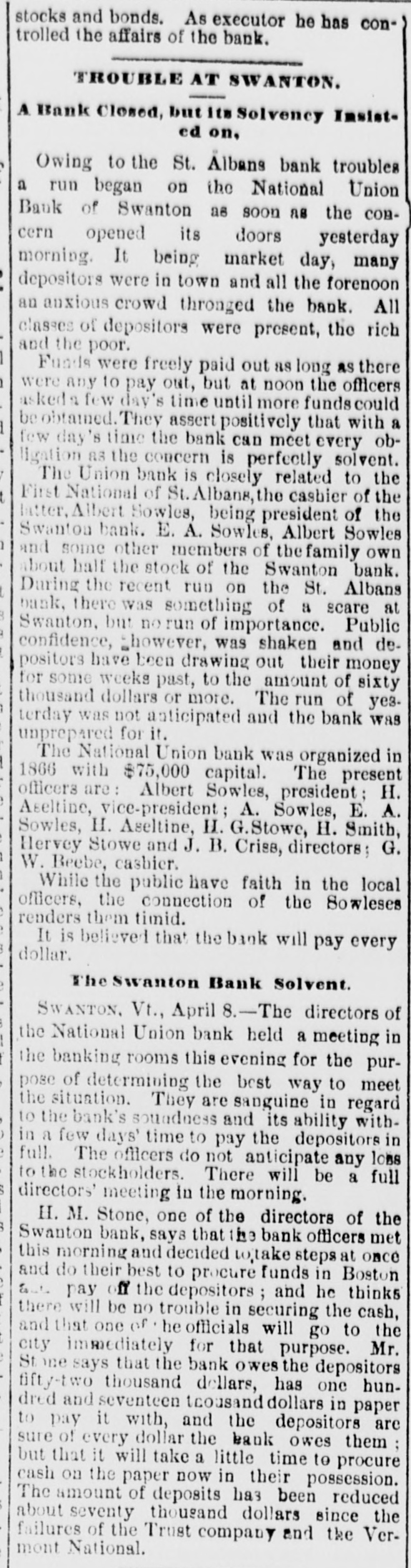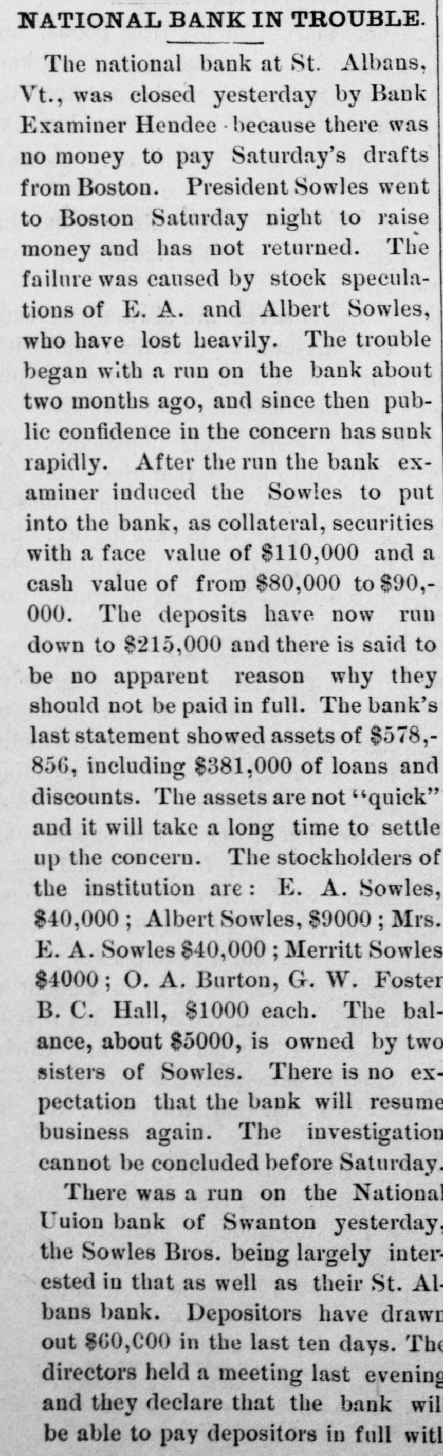 Hendee will at once make a complete investigation and if it is not feasible to continue the business the bank will go into voluntary liquidation. The assets are not of the quick kind and to speedily realize on them will be difficult, LATER. The bank crisis here is not surprising to the publıc, who have been expecting it. The stockholders of the institution are E. A. Sowles $30,000, Albert Sowles $90,000, Mrs. E. A. Sowles $40,000, Merritt Sowles $4.000, O. A. Burton, G. W. Foster and B. C. Hall, $1,000 each; the balance is owned by two sisters of Sowles' some $4,000 or $5,000. There is no expectation that the bank will resume business again. The investigation will not be concluded before tomorrow or Thursday. A general impression prevails that depositors are more likely to come out whole than in the case of the previous crisis. Developments are awaited with interest. A Run on the Swanton Bank. SWANTON, April 8.-There has been a run on the National Union Bank today owing to its close business relations with the first National of St. Albans. Payment was kept up while the funds lasted. The officers ask for delay, pronouncing the bank perfectly solvent, with ability to pay every dollar. Sixty thousand dollars has been drawn out by depos itors in the past ten days. An Illinois Bank Crippled by a Defaulting Cashier. MONMOUTH, April 8.-The First National bank closed doors this morning. The caused assigned is speculation by Cashier Hubbard whose [deficit is estimated at from $45,000 to $100,000. The bank is expected to resume in a day or two.
