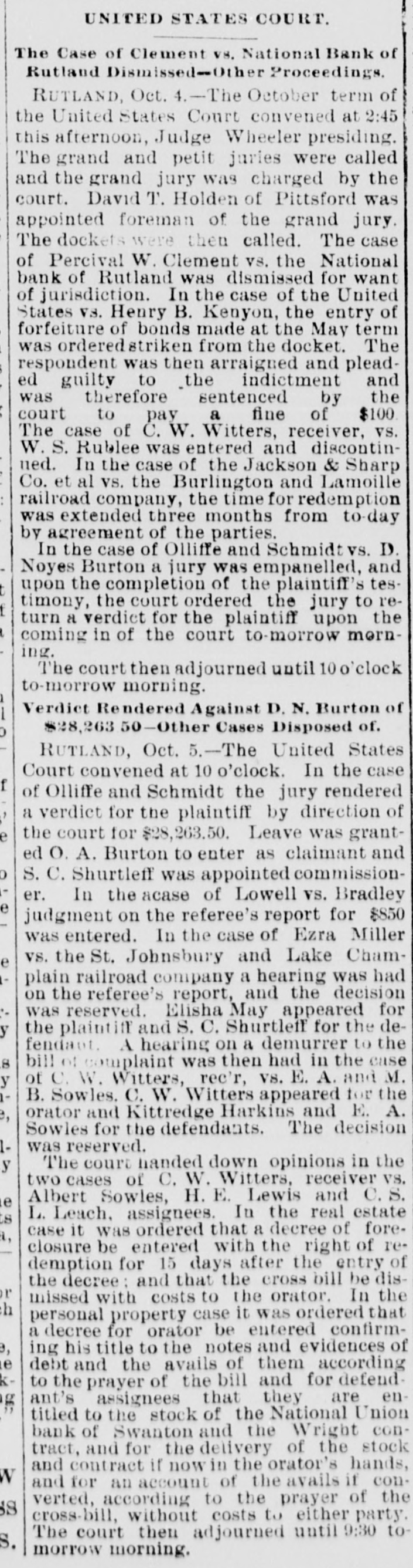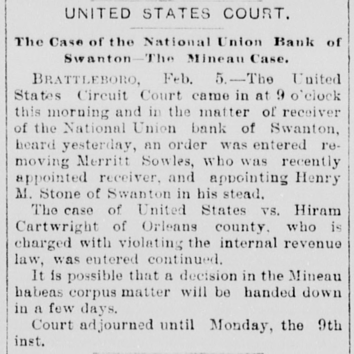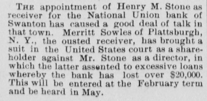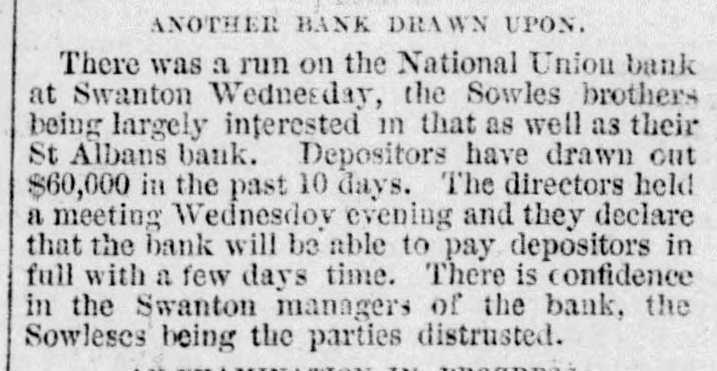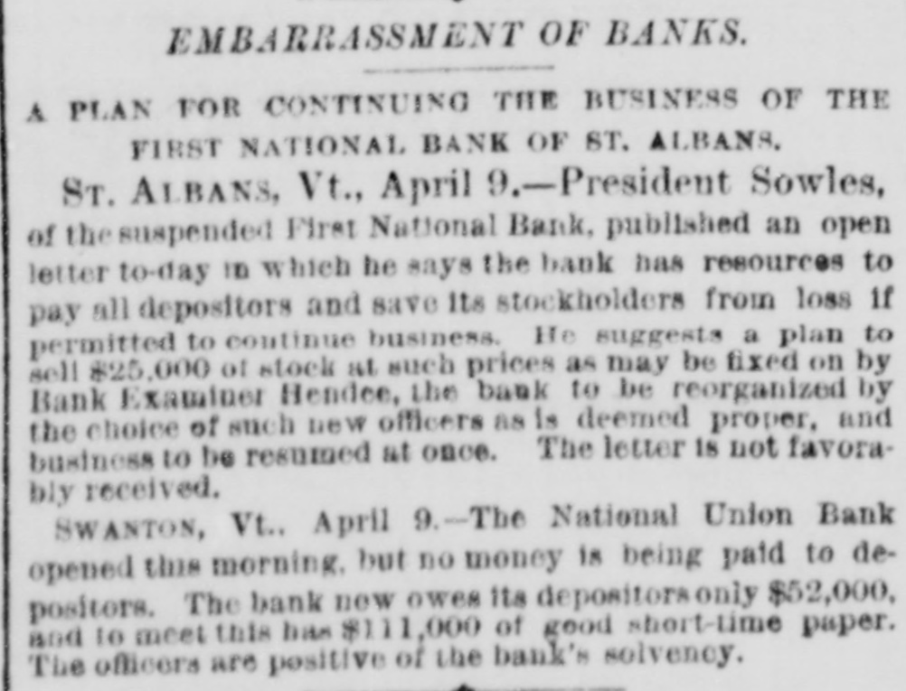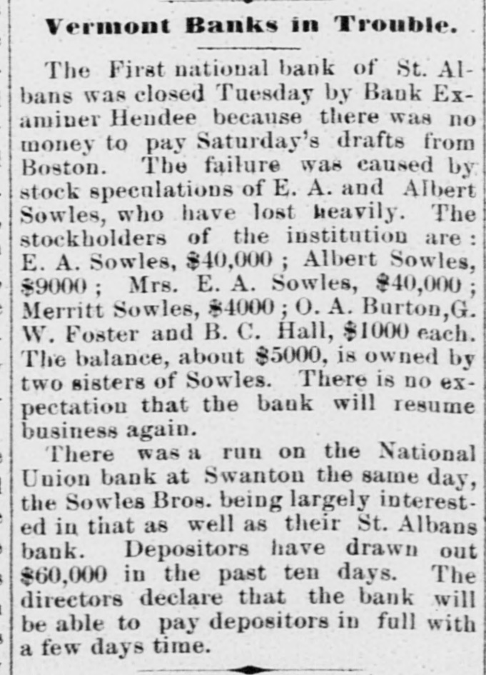 Hendee will at once make a complete investigation and if it is not feasible to continue the business the bank will go into voluntary liquidation. The assets are not of the quick kind and to speedily realize on them will be difficult, LATER. The bank crisis here is not surprising to the publıc, who have been expecting it. The stockholders of the institution are E. A. Sowles $30,000, Albert Sowles $90,000, Mrs. E. A. Sowles $40,000, Merritt Sowles $4.000, O. A. Burton, G. W. Foster and B. C. Hall, $1,000 each; the balance is owned by two sisters of Sowles' some $4,000 or $5,000. There is no expectation that the bank will resume business again. The investigation will not be concluded before tomorrow or Thursday. A general impression prevails that depositors are more likely to come out whole than in the case of the previous crisis. Developments are awaited with interest. A Run on the Swanton Bank. SWANTON, April 8.-There has been a run on the National Union Bank today owing to its close business relations with the first National of St. Albans. Payment was kept up while the funds lasted. The officers ask for delay, pronouncing the bank perfectly solvent, with ability to pay every dollar. Sixty thousand dollars has been drawn out by depos itors in the past ten days. An Illinois Bank Crippled by a Defaulting Cashier. MONMOUTH, April 8.-The First National bank closed doors this morning. The caused assigned is speculation by Cashier Hubbard whose [deficit is estimated at from $45,000 to $100,000. The bank is expected to resume in a day or two.