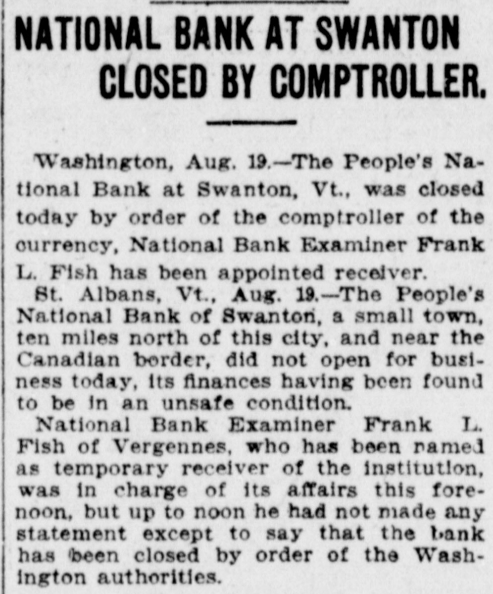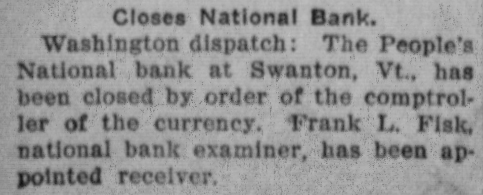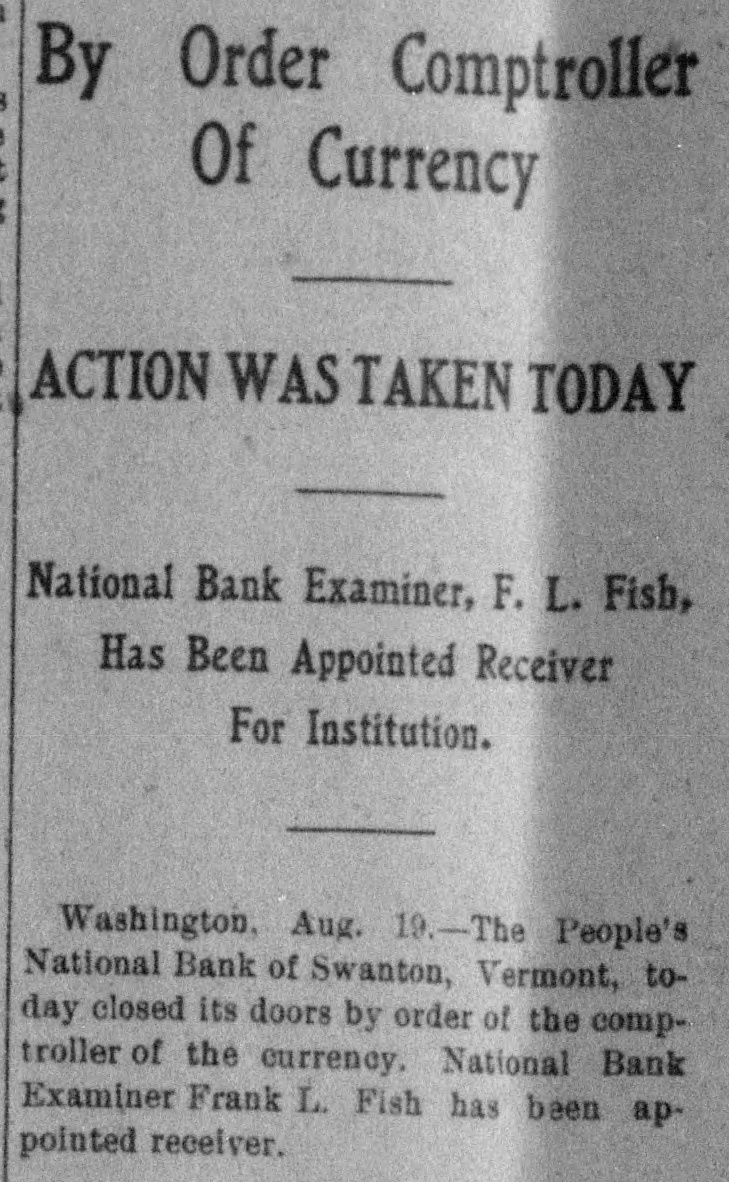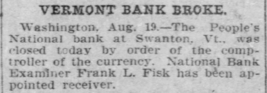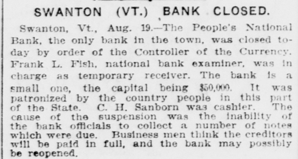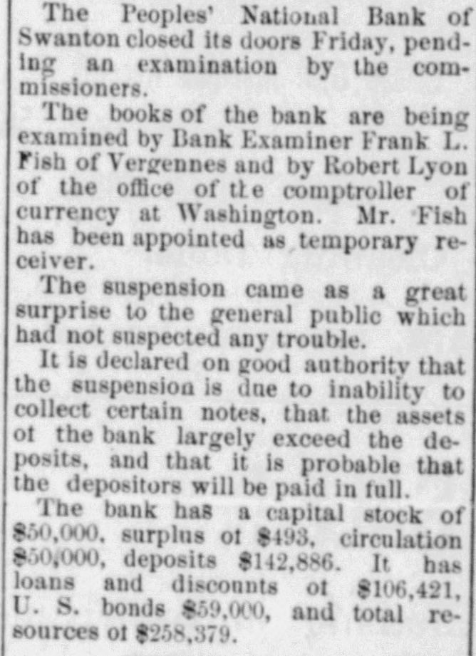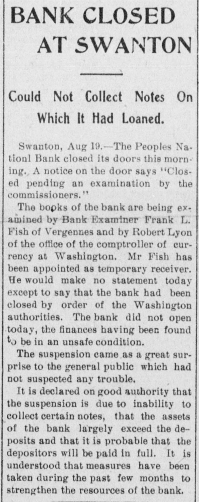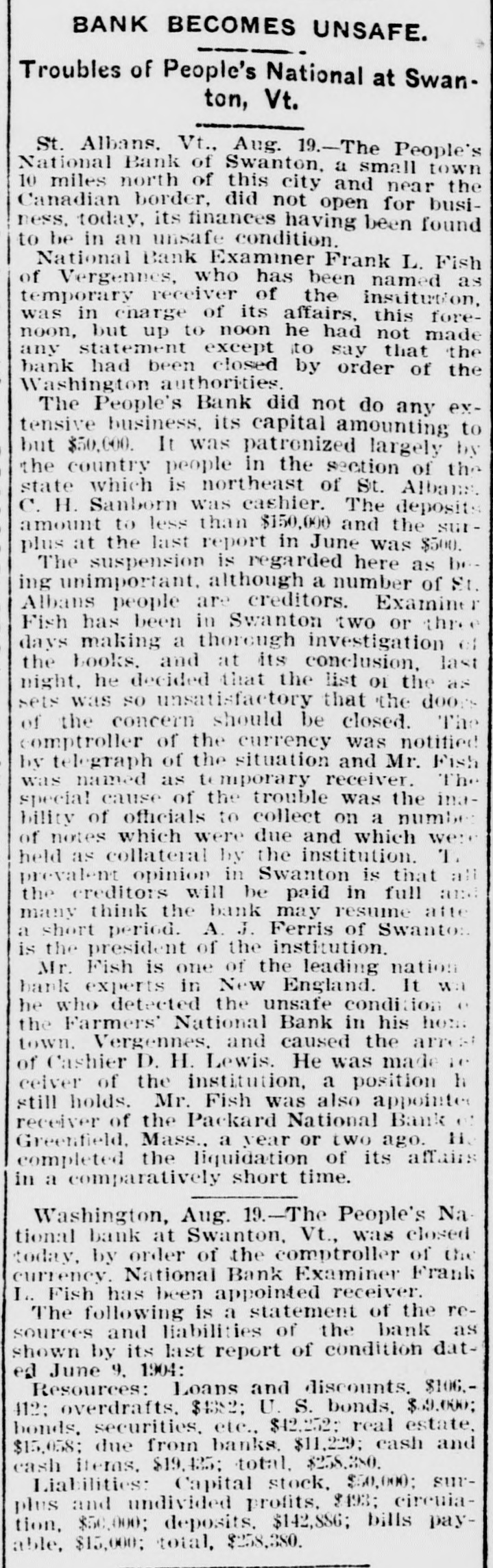 BANK BECOMES UNSAFE. Troubles of People's National at Swanton, Vt. St. Albans. Vt., Aug. 19.-The People's National Bank of Swanton, a small town 10 miles north of this city and near the Canadian border, did not open for business, today, its finances having been found to be in an unsafe condition. National Bank Examiner Frank L. Fish of Vergennes, who has been named as temporary receiver of the institution, was in charge of its affairs, this forenoon, but up to noon he had not made any statement except to say that the bank had been closed by order of the Washington authorities. The People's Bank did not do any extensive business, its capital amounting to but $50,000. It was patronized largely by the country people in the section of the state which is northeast of St. Albans. C. H. Sanborn was cashier. The deposits amount to less than $150,000 and the surat the last was as beplus The unimportant, suspension report although is regarded in June number here $500. of ing a St. Albans people are creditors. Examiner Fish has been in Swanton two or thr days making a thorough investigation et the books. and at its conclusion, last night, he decided that the list 01 the as sets was so unsatisfactory that the door of the concern should be closed. The comptroller of the currency was notified by telegraph of the situation and Mr. Fish was named as temporary receiver. The special cause of the trouble was the inability of officials to collect on a number of notes which were due and which we: held as collateral by the institution. T. prevalent opinion in Swanton is that all the creditors will be paid in full are many think the bank may resume atte a short period. A. J. Ferris of Swanto: is the president of the institution. Mr. Fish is one of the leading nation bank experts in New England. It Will he who detected the unsafe condition the Farmers' National Bank in his hom town. Vergennes, and caused the are of Cashier D. H. Lewis. He was made ceiver of the institution, a position h still holds. Mr. Fish was also appointed et receiver of the Packard National Bank Greenfield, Mass., a year or two ago. 11. completed the liquidation of its affairs in a comparatively short time. Washington, Aug. 19.-The People's Na tional bank at Swanton, Vt., was closed today. by order of the comptroller of the currency. National Bank Examiner Frank I.. Fish has been appointed receiver. The following is a statement of the resources and liabilities of the bank as shown by its last report of condition dated June 9. 1904: Resources: Loans and discounts. $106.412: overdrafts, $1352 U. S. bonds, $ 9.000; bonds. securities, etc., $42.252 real estate, $15,058; due from banks. $11,229; cash and cash items. $19,435 total. $258,380. Liabilities: Capital stock, $50,000; surplus and undivided profits, $493; circuiation, $50,000; deposits. $142,886; bills payable, $15,000; total, $258,380.