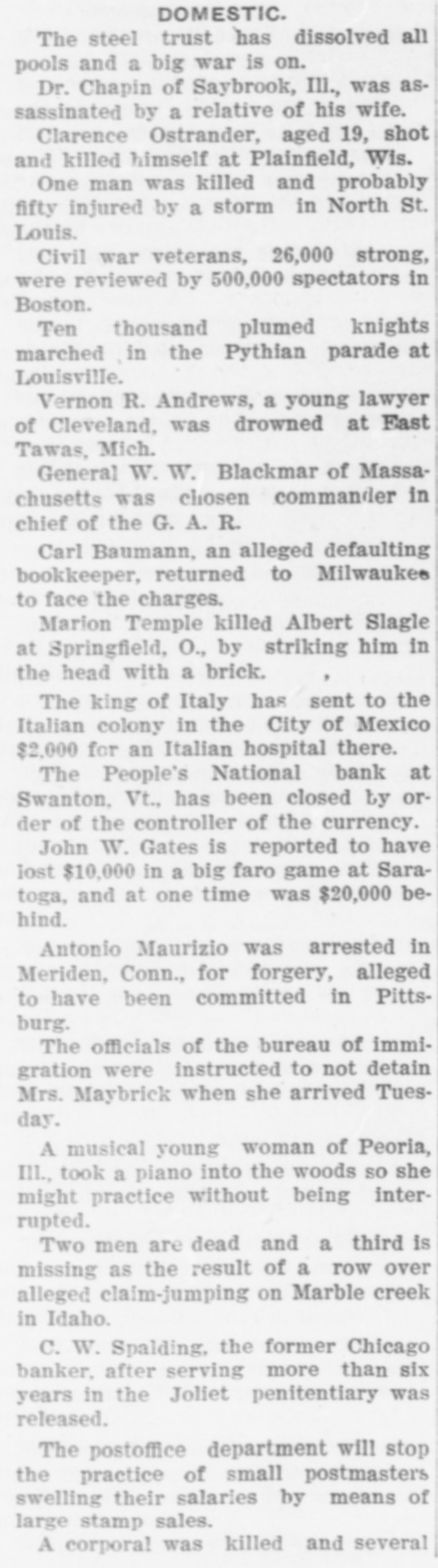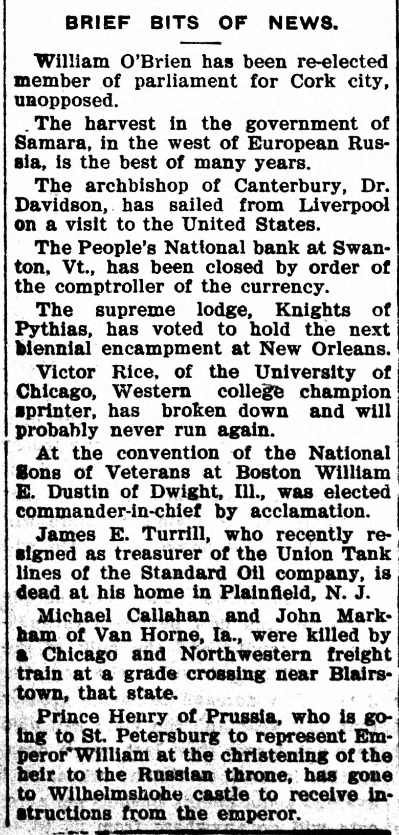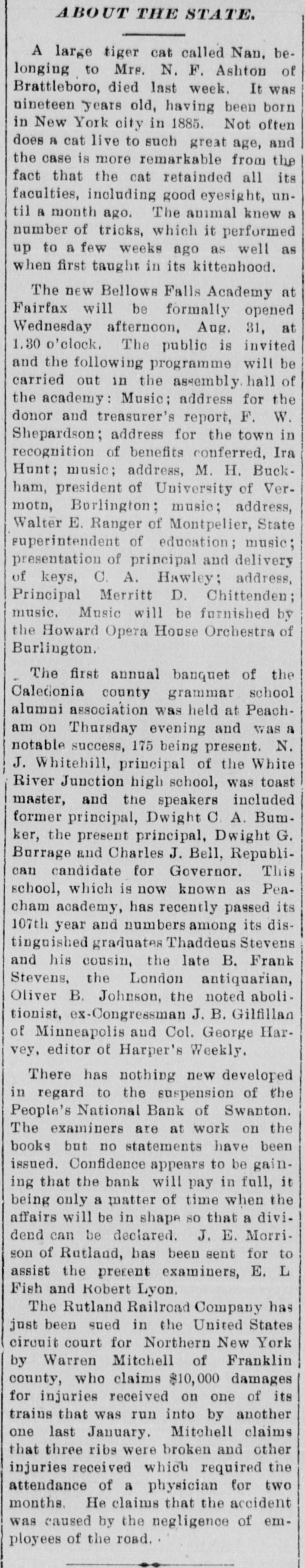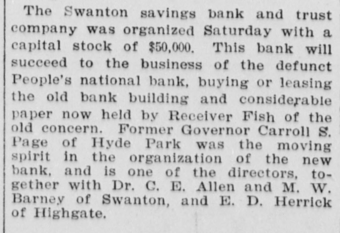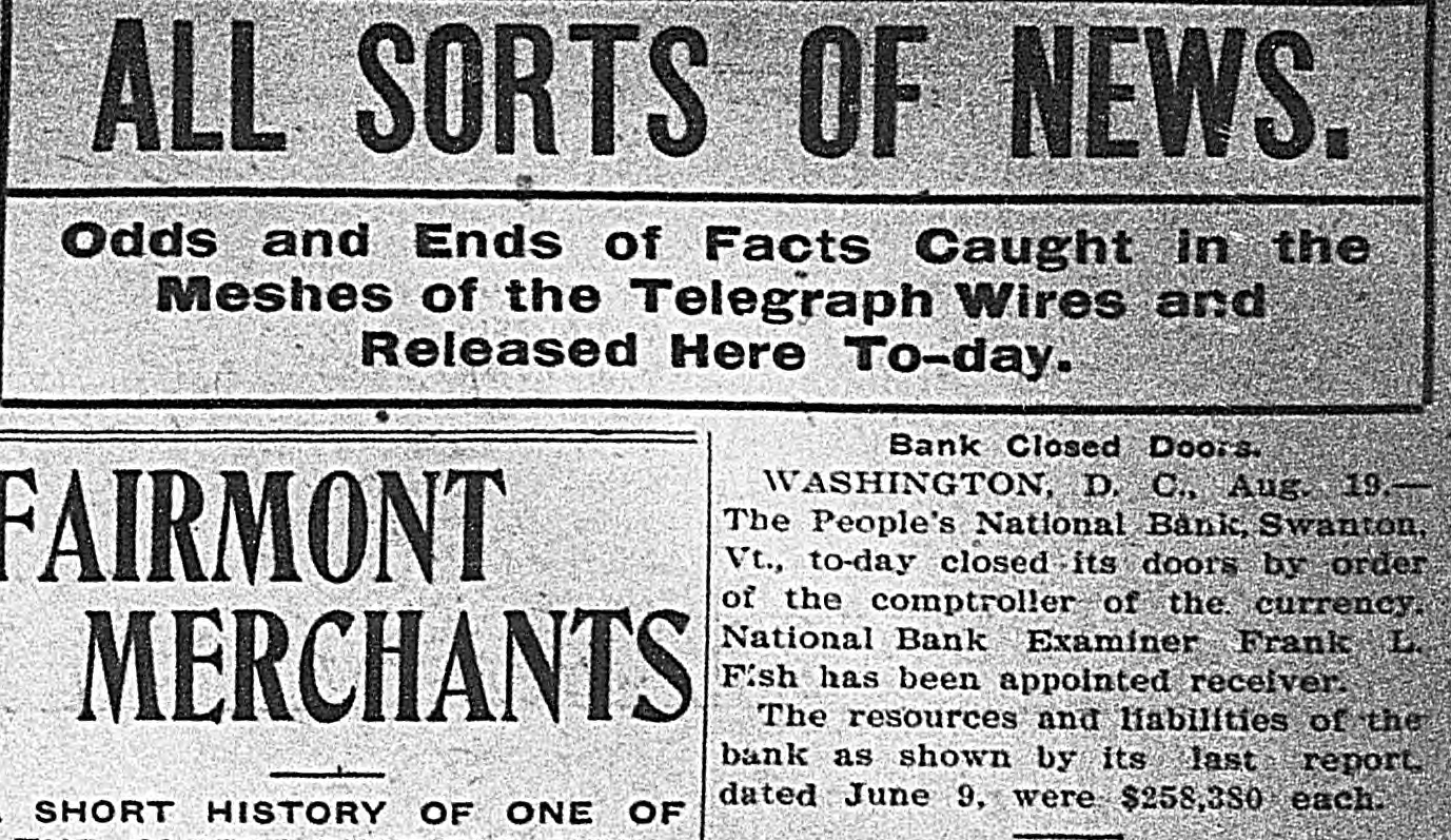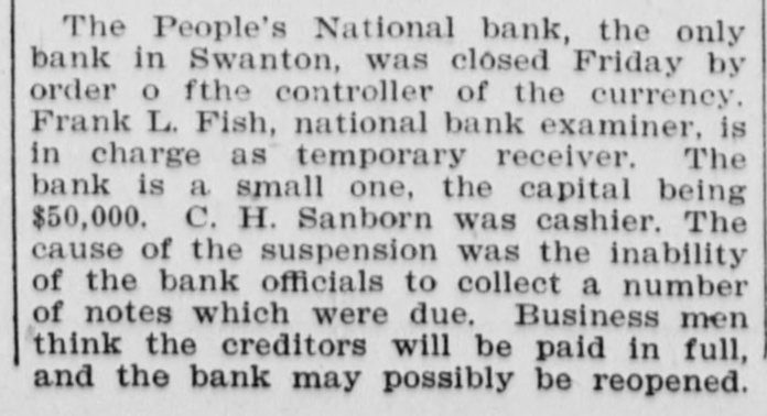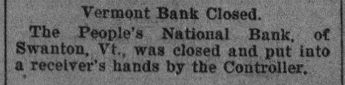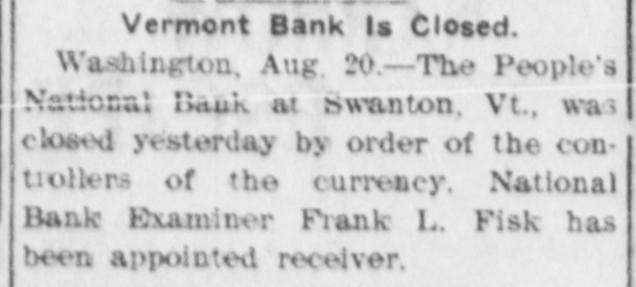 BANK BECOMES UNSAFE. Troubles of People's National at Swanton, Vt. St. Albans. Vt., Aug. 19.-The People's National Bank of Swanton, a small town 10 miles north of this city and near the Canadian border, did not open for business, today, its finances having been found to be in an unsafe condition. National Bank Examiner Frank L. Fish of Vergennes, who has been named as temporary receiver of the institution, was in charge of its affairs, this forenoon, but up to noon he had not made any statement except to say that the bank had been closed by order of the Washington authorities. The People's Bank did not do any extensive business, its capital amounting to but $50,000. It was patronized largely by the country people in the section of the state which is northeast of St. Albans. C. H. Sanborn was cashier. The deposits amount to less than $150,000 and the surat the last was as beplus The unimportant, suspension report although is regarded in June number here $500. of ing a St. Albans people are creditors. Examiner Fish has been in Swanton two or thr days making a thorough investigation et the books. and at its conclusion, last night, he decided that the list 01 the as sets was so unsatisfactory that the door of the concern should be closed. The comptroller of the currency was notified by telegraph of the situation and Mr. Fish was named as temporary receiver. The special cause of the trouble was the inability of officials to collect on a number of notes which were due and which we: held as collateral by the institution. T. prevalent opinion in Swanton is that all the creditors will be paid in full are many think the bank may resume atte a short period. A. J. Ferris of Swanto: is the president of the institution. Mr. Fish is one of the leading nation bank experts in New England. It Will he who detected the unsafe condition the Farmers' National Bank in his hom town. Vergennes, and caused the are of Cashier D. H. Lewis. He was made ceiver of the institution, a position h still holds. Mr. Fish was also appointed et receiver of the Packard National Bank Greenfield, Mass., a year or two ago. 11. completed the liquidation of its affairs in a comparatively short time. Washington, Aug. 19.-The People's Na tional bank at Swanton, Vt., was closed today. by order of the comptroller of the currency. National Bank Examiner Frank I.. Fish has been appointed receiver. The following is a statement of the resources and liabilities of the bank as shown by its last report of condition dated June 9. 1904: Resources: Loans and discounts. $106.412: overdrafts, $1352 U. S. bonds, $ 9.000; bonds. securities, etc., $42.252 real estate, $15,058; due from banks. $11,229; cash and cash items. $19,435 total. $258,380. Liabilities: Capital stock, $50,000; surplus and undivided profits, $493; circuiation, $50,000; deposits. $142,886; bills payable, $15,000; total, $258,380.