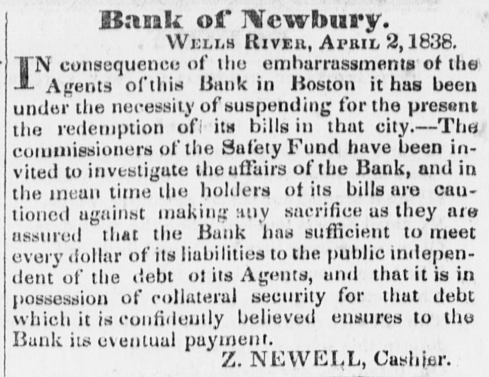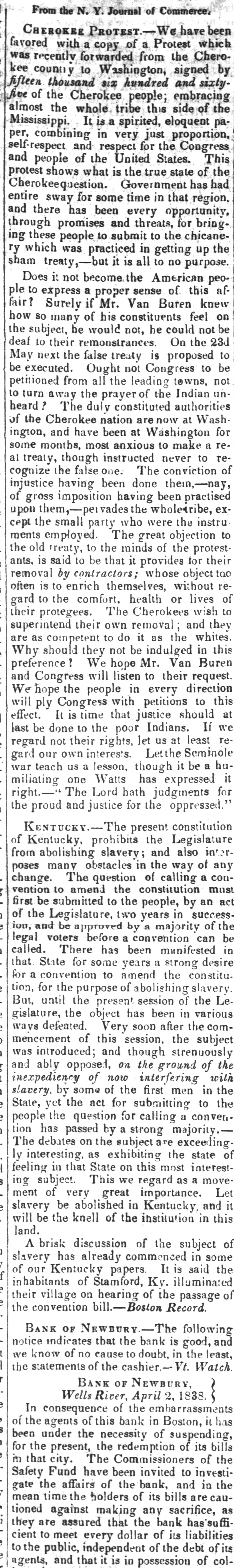 From the N. Y. Journal of Commerce. CHEROKEE PROTEST.--We have been favored with a copy of a Protest which was forwarded from by kee to Washington, recently country the signed and Chero- sixtythousand six hundred of the Cherokee people; the whole tribe this It is a spirited, pain very just and respect for the fifteen five almost Mississippi. combining eloquent proportion, side embracing Congress of This the and of the United self-respect per, people States. of the shows what is the true state Government protest Cherokeequestion. that has region, had entire for some time in and there has been every promises and threats, to submit to through sway the opportunity, for chicane- bringwas practiced in up sham ry it is all to no ing which these treaty,-but people getting purpose. the it not become the Does American of this peo- afto a proper sense if Mr. Van how so of his constituents fair? ple express Surely many Buren could feel not knew on be the subject, he would not, he the 23d their remonstrances. On to next the false treaty is be Ought not from all the unto the prayer of the deaf be petitioned May turn executed. to away leading Congress proposed towns, authorities Indian to not The duly constituted of Cherokee nation are now at and have been at remost anxious to a though instructed never ington, some al heard? treaty, the months, Washington conviction make Wash to for rethe false one. The of having been done of having the the small party who were to cept The great injustice cognize upou them,-pervades gross imposition wholexribe, been them,-nay, objection the practised instru exto the minds of their is said to be that it provides contractors; whose too rethe ments ants. removal old employed. treaty, by the without object for protestto enrich themselves, of the comfort, health or to often to is lives wish their gard The Cherokees their own removal; to do it as this are as should they not be superintend Why protegees. competent indulged Van the and whites. in Buren they We hope Mr. will listen to with and the people in every this preference? We hope Congress ply Congress petitions their should direction request. to It is time that justice last be done to the poor effect. will Indians. If re- we at not their rights, let us at gard our own us a interests. lesson, though Let the it be a hu- it war one Watts has miliating regard teach judgments expressed Seminole least for right.- The Lord hath the and justice for the oppressed." - The present KENTUCKY.-1 proud Legislature constitution Kentucky, prohibits the interfrom slavery and many obstacles in the way poses The question of a must amend the change. of vention abolishing to constitution calling also by of con- any act first be submitted to the people, an of the Legislature, two years in success- of and be approved by a majority voters before a convention legal ion, manifested can called. There has been desire that State for some years a strong constituconvention to amend the for the purpose of Leuntil the present session of the object has been in Very soon gislature, tion, ways for But, a defeated. abolishing after the the slavery. the various subject commencement of this session, and though strenuously opposed, on the of now the and inexpediency was introduced; ably interfering ground of in wiln the slavery, by some of the first men the State, the act for submitting to the question for a convenpassed by a strong debates on the subject are as exhibiting the people tion The interesting, has yet calling majority. exceeding interest- state ly feeling in that State on this most subject. This we regard as a move- Let ing of very great importance. and ment be abolished in Kentucky, this slavery will be the knell of the institution in land. brisk discussion of the subject of slavery A has already commenced is said in some the our Kentucky papers. It of inhabitants of Stamford, Kv. illuminated their village on hearing of the passage the convention -Boston Record. BANK OF NEWBURY.-The following and notice indicates that the bank is good, know of no cause to doubt, in the Watch. least, the we statements of the cashier.- Vt. BANK OF NEWBURY, Wells River, April 1838. consequence of the embarrassments it the In agents of this bank in Boston, of under the necessity of suspending, The for the redemption the been that the city. present, Commissioners of its investi- of bills Safety in Fund have been invited to in the the affairs of the bank, and gate time the holders of its bills are caumaking any suffi- as are assured that the mean they tioned against bank sacrifice, liabilities has cient to meet every dollar of its of its to the public, independent of the debt colagents, and that it is in possession of