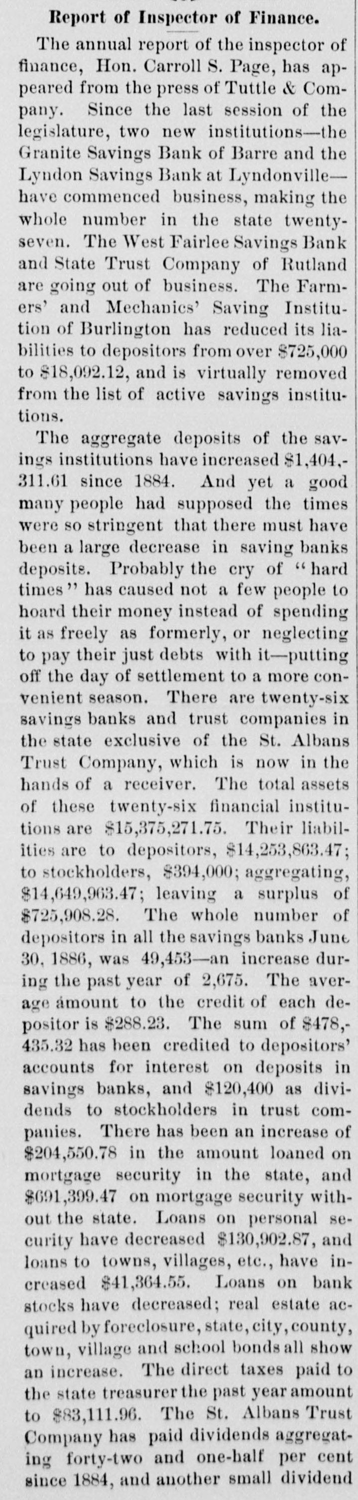 Report of Inspector of Finance. The annual report of the inspector of finance, Hon. Carroll S. Page, has appeared from the press of Tuttle & Company. Since the last session of the legislature, two new institutions-the Granite Savings Bank of Barre and the Lyndon Savings Bank at Lyndonvillehave commenced business, making the whole number in the state twentyseven. The West Fairlee Savings Bank and State Trust Company of Rutland are going out of business. The Farmers' and Mechanics' Saving Institution of Burlington has reduced its liabilities to depositors from over $725,000 to $18,092.12, and is virtually removed from the list of active savings institutions. The aggregate deposits of the savings institutions have increased $1,404,311.61 since 1884. And yet a good many people had supposed the times were so stringent that there must have been a large decrease in saving banks deposits. Probably the cry of hard times" has caused not a few people to hoard their money instead of spending it as freely as formerly, or neglecting to pay their just debts with it-putting off the day of settlement to a more convenient season. There are twenty-six savings banks and trust companies in the state exclusive of the St. Albans Trust Company, which is now in the hands of a receiver. The total assets of these twenty-six financial institutions are $15,375,271.75. Their liabilities are to depositors, $14,253,863.47; to stockholders, $394,000; aggregating, $14,649,963.47; leaving a surplus of $725,908.28. The whole number of depositors in all the savings banks June 30, 1886, was 49,453-an increase during the past year of 2,675. The average ámount to the credit of each depositor is $288.23. The sum of $478,435.32 has been credited to depositors' accounts for interest on deposits in savings banks, and $120,400 as dividends to stockholders in trust companies. There has been an increase of $204,550.78 in the amount loaned on mortgage security in the state, and $691,399.47 on mortgage security without the state. Loans on personal security have decreased $130,902.87, and loans to towns, villages, etc., have increased $41,364.55. Loans on bank stocks have decreased; real estate acquired by foreclosure, state, city, county, town, village and school bonds all show an increase. The direct taxes paid to the state treasurer the past year amount to $83,111.96. The St. Albans Trust Company has paid dividends aggregating forty-two and one-half per cent since 1884, and another small dividend