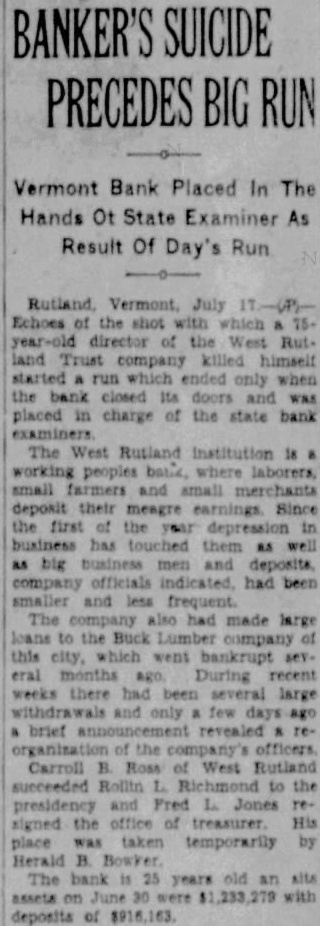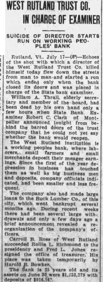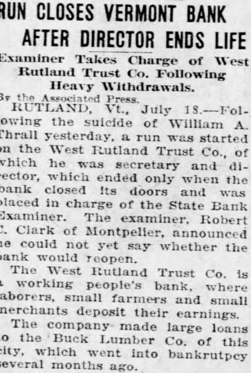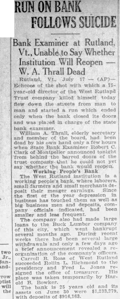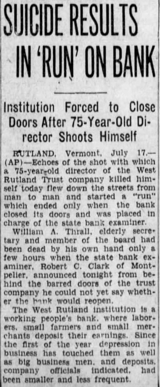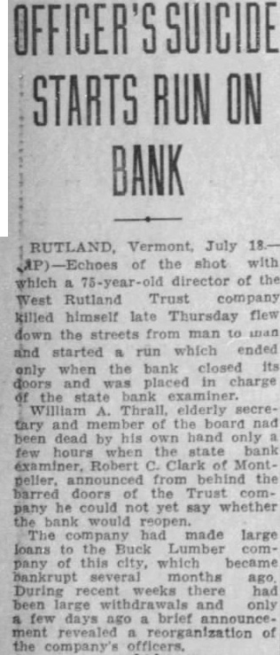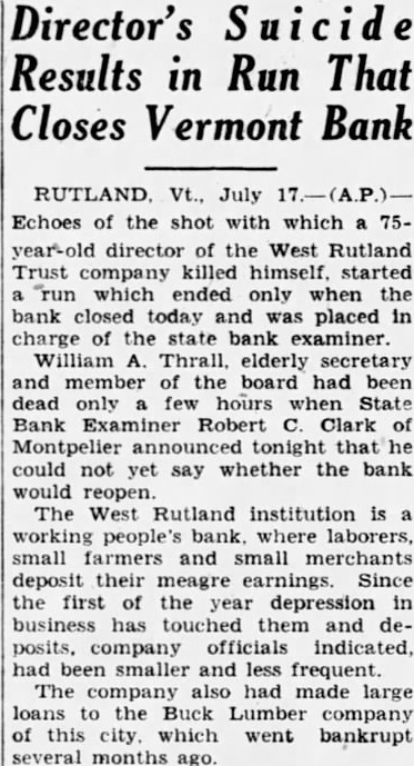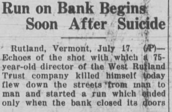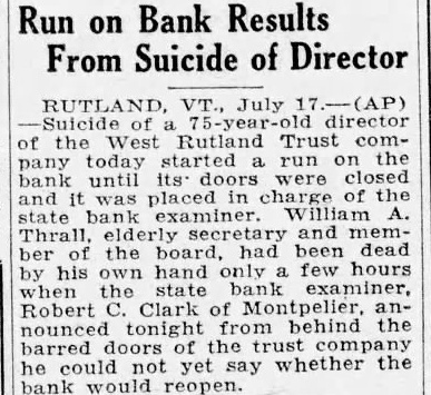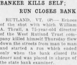 West Rutland Bank Director, Thrall, Commits Suicide And "Run" Bank Follows on