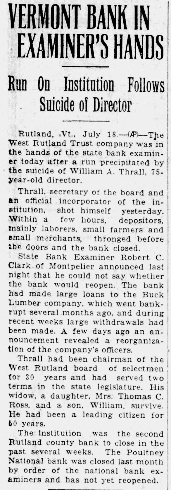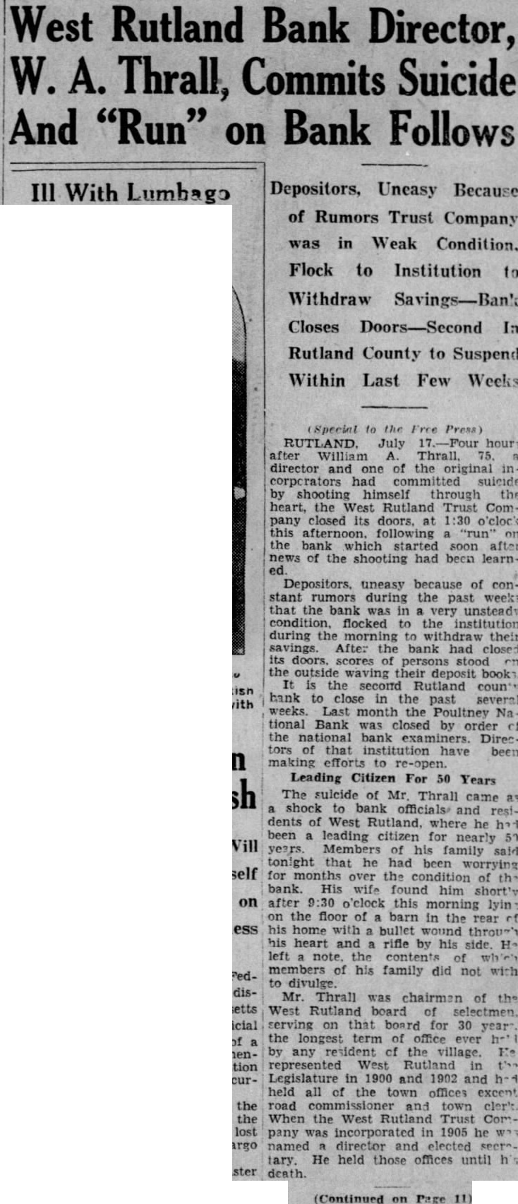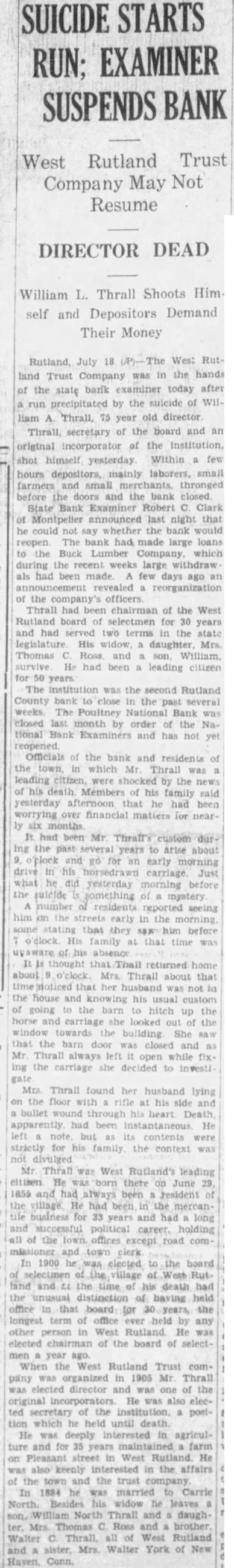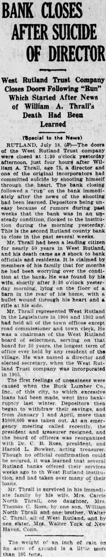 (Special to the News) RUTLAND. July 18. (P)-The doors of the West Rutland Trust company were closed at 1:30 o'clock yesterday afternoon, just four hours after William A. Thrall, age 75, a director and one of the original incorporators had committed suicide by shooting himself through the heart. The bank closing followed "run" on the bank immediately after the news of the shooting had been learned. Depositors being un. easy because of rumors during past weeks that the bank was in an unsteady condition, flocked to the Institution during the morning yesterday. This is the second Rutland county bank to close in the past several weeks. Mr. Thrall had been leading citizen for nearly 50 years in West Rutland, and his death came as a shock to bank officials and residents. It is claimed by members of his family that for months he had been worrying over the condition at the bank, He was found by his wife, shortly after 9:30 o'clock yesterday morning, lying on the floor of a barn in the rear of his home, with a bullet wound through his heart and a rifle at his side. Mr. Thrall represented West Rutland in the Legislature in 1900 and 1902 and had held all of the town offices except road commissioner and town clerk. He was chairman of the West Rutland board of selectmen. serving on that board for 30 years, the longest term of office ever held by any resident of the village. He was named a director and elected secretary, when the West Rutland Trust company was incorporated in 1905. The first feelings of uneasiness were caused when the Buck Lumber Co., Inc., of this city, to which excessive loans had been made, went into bankruptcy last winter. Depositors then began to withdraw their savings, and from January and April, more than $1000,000 was taken out. At an emergency meeting called recently. the president and treasurer resigned. and the board of officers was reorganized with Dr. C. B. Ross, president, and Harold L. Bowker, acting treasurer Though no official confirmation could be secured, it was learned tnat several Rutland banks offered their services weeks ago to th West Rutland institution. and had taken over many of their loans. Mr. Thrall is survived in his immediate family by his wife. Mrs. Carrie North Thrall, one daughter, Mrs. Thomas C. Ross, by one son, William North Thrall and one brother, Walter C. Thrall. all of West Rutland, and by one sister. Mrs. Walter York of New Haven. Conn.