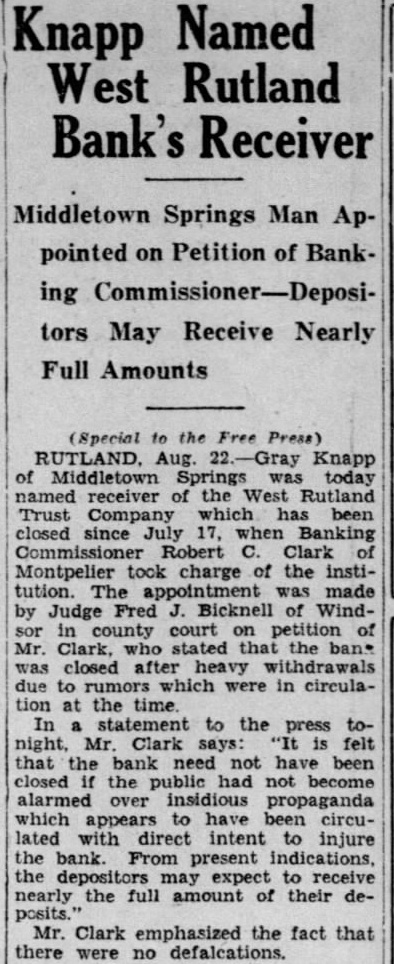 (Special the Press) RUTLAND. Knapp Middletown today named receiver of the West Rutland Trust Company which been closed since July 17, when Banking Commissioner Robert Clark Montpelier took charge of the institution. was made by Judge Fred Bicknell of Windcounty court Clark, stated the closed after heavy due to which were in circulation at the time In statement to the press tonight, Clark says: felt that the bank need not have been closed the public had not become alarmed over insidious propaganda which appears have circulated direct intent to injure the bank. From present indications, expect to receive nearly the full amount of their deMr. Clark emphasized the fact that there no defalcations.