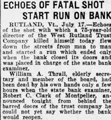 -Echoes of the shot with which a 75-year-old director of the West Rutland Trust company killed himself today flew down the streets and started a run which ended only when the bank closed its doors and was placed in charge of the state bank examiner. William A. Thrall elderly secretary and member of the board, had been dead by his own hand only few hours when the state bank examiner, Robert Clark of Montpelier, announced tonight from behind the barred doors of the trust company he could not yet say whether the bank would reopen. The West Rutland institution is working people's bank. where laborers, small farmers and small merchants deposit their earnings.