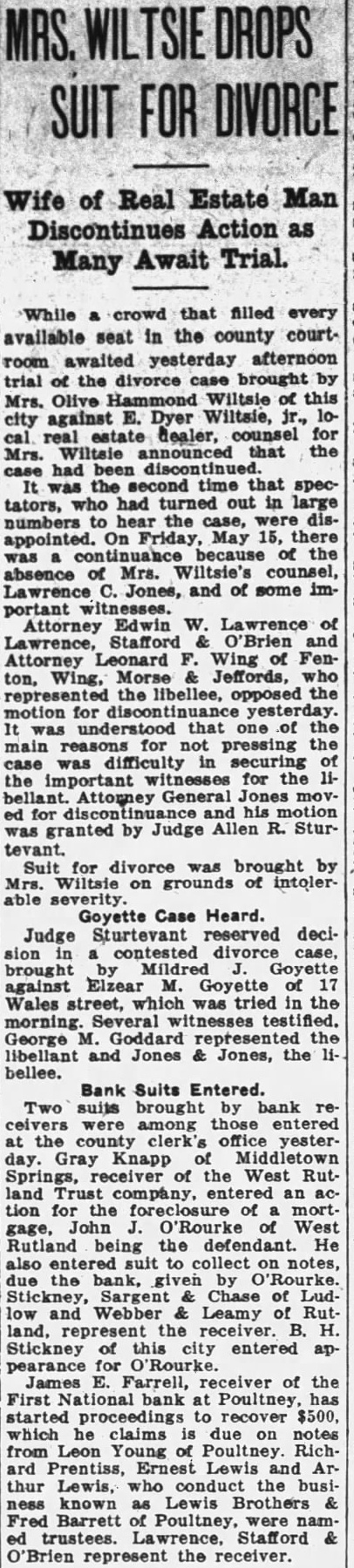 While crowd that filled every available seat in the county courtroom awaited yesterday afternoon trial of the divorce case brought by Mrs. Olive Hammond Wiltsle of this city against E. Dyer Wiltsie, real estate dealer, counsel for Wiltsie announced that the Mrs. had been discontinued. second time that spectators, who had turned out in large numbers the case, were disappointed. On Friday, May 15, there because the absence Mrs. Wiltsie's counsel, Jones, and of some important Attorney Edwin W. Lawrence of Lawrence, Stafford O'Brien and Attorney Leonard Wing of Fenton, Wing, Morse Jeffords, who represented libellee, opposed motion for yesterday. understood that one of the main reasons for not pressing the case was difficulty in securing the important witnesses for the Attorney General Jones movfor his was granted by Judge Allen R. Sturtevant. Suit for divorce was brought by Mrs. Wiltsie on grounds of intolerGoyette Case Heard. Judge Sturtevant reserved decision in contested divorce case, brought Mildred Goyette against Elzear M. Goyette of Wales street, which was tried in the morning. Several witnesses testified. George Goddard represented libellant and Jones Jones, the bellee.