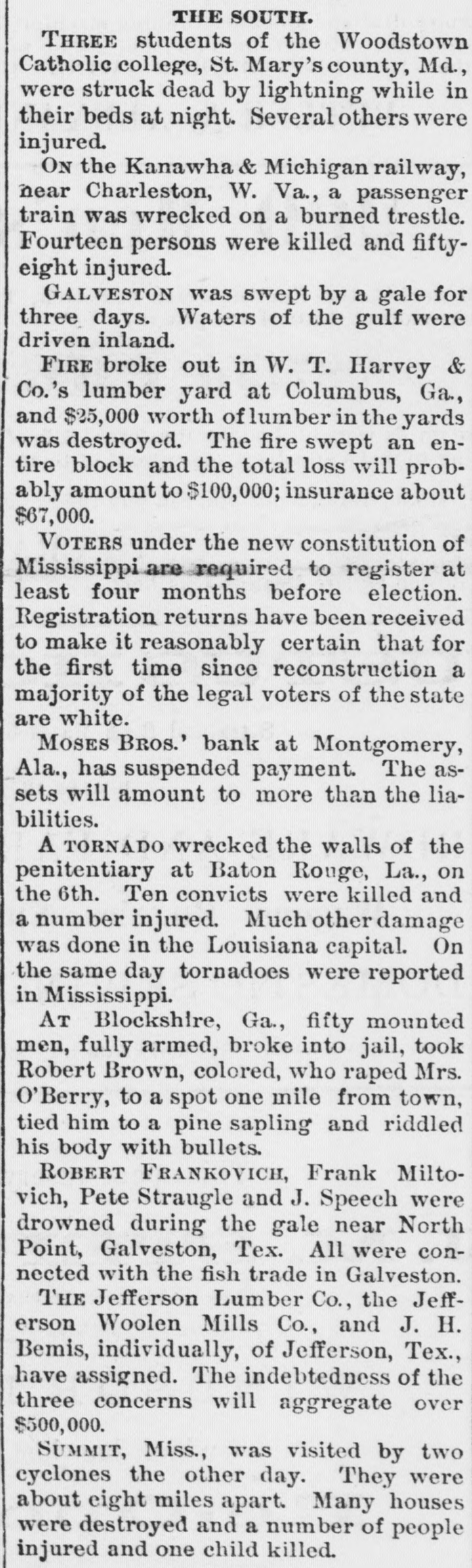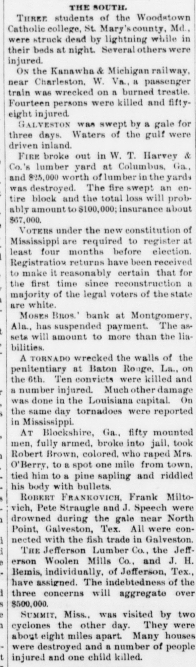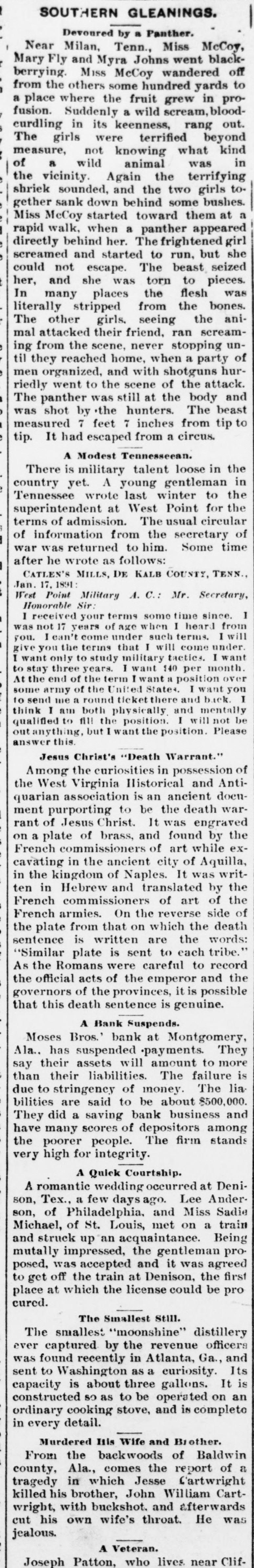 SOUTHERN GLEANINGS. Devoured by a Panther. Near Milan, Tenn., Miss McCoy, Mary and Johns went off berrying. from the Fly others Miss Myra McCoy wandered blacksome hundred yards to a place where the fruit grew in profusion. Suddenly a wild scream, bloodout. The were curdling girls in its keenness, terrified rang beyond measure, not knowing what kind in of a wild animal was the vicinity. Again the terrifying shriek sounded, and the two girls together sank down behind some bushes. a a girl directly rapid Miss McCoy walk, behind started when her. The toward panther frightened them appeared at screamed and started to run, but she could not escape. The beast seized her, was torn to In was many and she places the flesh pieces. literally stripped from the bones. The other girls. seeing the animal attacked their friend, ran screaming never until a of they from reached the scene, home, when stopping party men hurwent to scene The was at and riedly panther organized, the and still with of the shotguns the body attack. was measured 7 feet 7 to shot by the hunters. inches from The tip beast tip. It had escaped from a circus. A Modest Tennesseen. the There is yet. military young talent gentleman loose in country A in at the superintendent Tennessee wrote last West winter Point for to the terms of admission. The usual circular of information from the secretary of war was returned to him. Some time after he wrote as follows: CATLEN'S MILLS, DE KALB COUNTY, TENN. Jan. 17. 1891 West Point Military A. C.: Mr. Secretary, Honorable Sir: I received your terms some time since. I was 17 of age when under such you. not I can't come years I terms. heard under. from will give the terins come I to to three want per want stay you only years. study that military I I will 140 tactics. month. want At the end of the term I want a position over some army of the United State4. I want you I to send me a round ticket there and back. think I am both physically and mentally qualified to fill the position. I will not be outanything, but I want the position. Please answer this. Jesus Christ's "Death Warrant." Among the curiosities in possession of the association an quarian West Virginia Historical is ancient death and doen- Antiment purporting to be the warrant of Jesus Christ. It was engraved on a plate of brass, and found by the French commissioners of art while excavating in the ancient city of Aquilla, in the kingdom of Naples. It was written in Hebrew and translated by the French commissioners of art of the French armies. On the reverse side of the plate from that on which the death written are "Similar is sent to sentence plate is each the words: tribe.' As were the of the the the official Romans acts careful emperor it is to possible and record governors of the provinces, that this death sentence is genuine. A Bank Suspends. Moses Bros. bank at Montgomery, Ala., has suspended payments. They say their assets will amount to more than their liabilities. The failure is due to stringency of money. The lia bilities are said to be about $500,000. They did a saving bank business and have scores the poorer many people. of depositors The firm among stands very high for integrity. A Quick Courtship. occurred at Denison, a few A romantic Tex., wedding daysage and Lee Miss Ander- Sadie of Philadelphia. of St. met on a and an son, Michael, struck up Louis, acquaintance. Being train prowas was posed, mutally impressed, accepted the and gentleman it the agreed to off the train at at which the pro place get license Denison, could be first cured. The Smallest Still. The smallest "moonshine" distillery ever the revenue was found in and captured recently by Atlanta, curiosity. Ga., officers sent to Washington as a Its capacity is about three gallons. It is so as to be operated on an stove, ordinary constructed cooking and is complete in every detail. Murdered His Wife and Brother. From the backwoods of Baldwin Ala., comes a in which Jesse tragedy county, the William report Cartwright Cart- of killed his brother, John with buckshot. wright, throat. and afterwards He cut his own wife's was jealous. A Veteran. Joseph Patton, who lives. near Clif-
