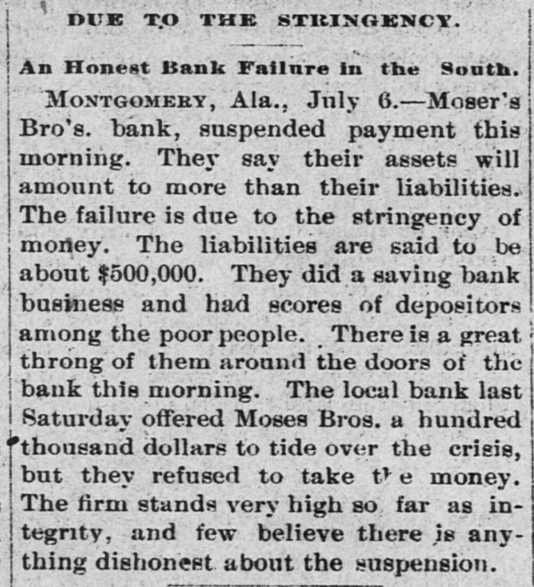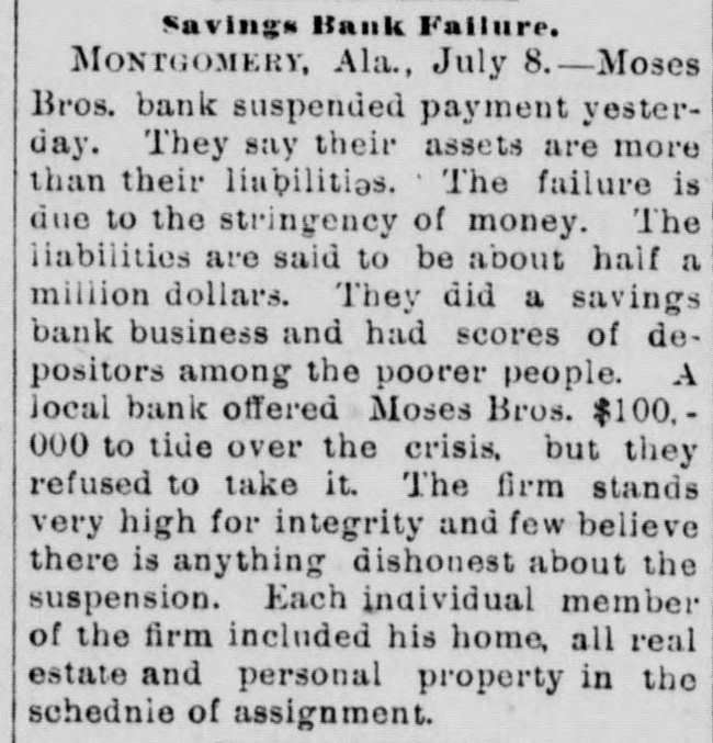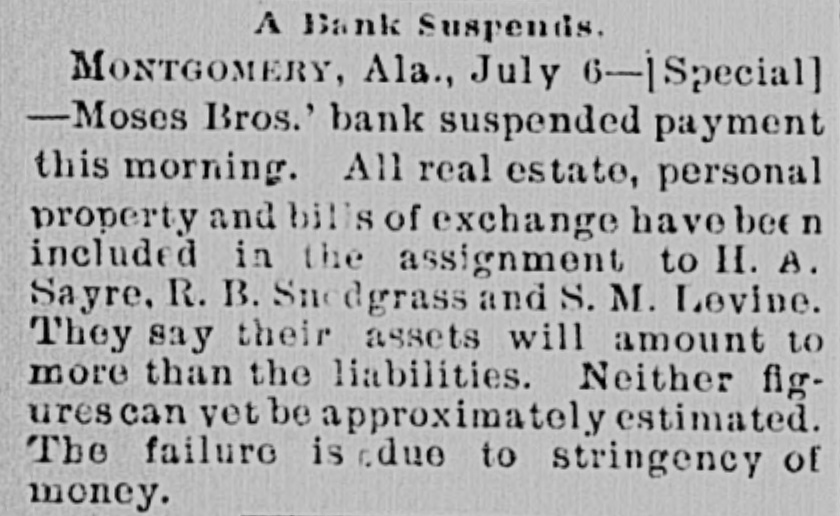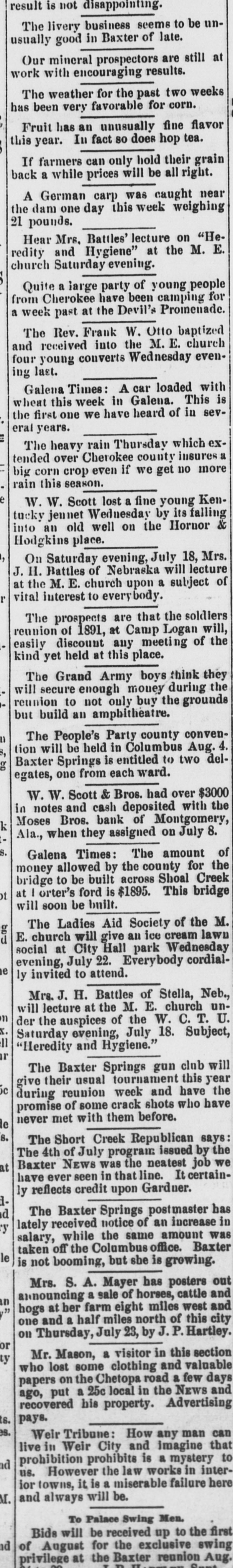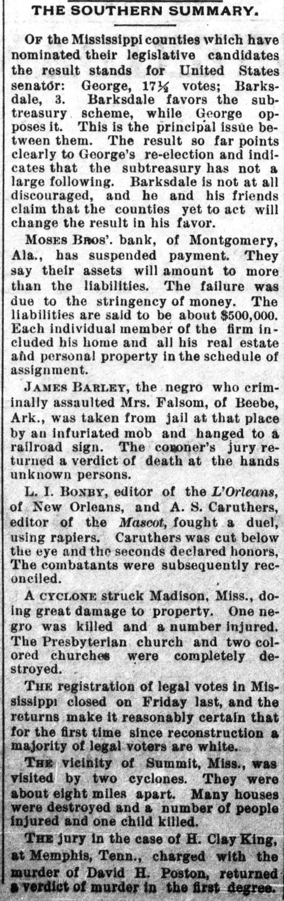 SOUTHERN GLEANINGS. Devoured by a Panther. Near Milan, Tenn., Miss McCoy, Mary and Johns went off berrying. from the Fly others Miss Myra McCoy wandered blacksome hundred yards to a place where the fruit grew in profusion. Suddenly a wild scream, bloodout. The were curdling girls in its keenness, terrified rang beyond measure, not knowing what kind in of a wild animal was the vicinity. Again the terrifying shriek sounded, and the two girls together sank down behind some bushes. a a girl directly rapid Miss McCoy walk, behind started when her. The toward panther frightened them appeared at screamed and started to run, but she could not escape. The beast seized her, was torn to In was many and she places the flesh pieces. literally stripped from the bones. The other girls. seeing the animal attacked their friend, ran screaming never until a of they from reached the scene, home, when stopping party men hurwent to scene The was at and riedly panther organized, the and still with of the shotguns the body attack. was measured 7 feet 7 to shot by the hunters. inches from The tip beast tip. It had escaped from a circus. A Modest Tennesseen. the There is yet. military young talent gentleman loose in country A in at the superintendent Tennessee wrote last West winter Point for to the terms of admission. The usual circular of information from the secretary of war was returned to him. Some time after he wrote as follows: CATLEN'S MILLS, DE KALB COUNTY, TENN. Jan. 17. 1891 West Point Military A. C.: Mr. Secretary, Honorable Sir: I received your terms some time since. I was 17 of age when under such you. not I can't come years I terms. heard under. from will give the terins come I to to three want per want stay you only years. study that military I I will 140 tactics. month. want At the end of the term I want a position over some army of the United State4. I want you I to send me a round ticket there and back. think I am both physically and mentally qualified to fill the position. I will not be outanything, but I want the position. Please answer this. Jesus Christ's "Death Warrant." Among the curiosities in possession of the association an quarian West Virginia Historical is ancient death and doen- Antiment purporting to be the warrant of Jesus Christ. It was engraved on a plate of brass, and found by the French commissioners of art while excavating in the ancient city of Aquilla, in the kingdom of Naples. It was written in Hebrew and translated by the French commissioners of art of the French armies. On the reverse side of the plate from that on which the death written are "Similar is sent to sentence plate is each the words: tribe.' As were the of the the the official Romans acts careful emperor it is to possible and record governors of the provinces, that this death sentence is genuine. A Bank Suspends. Moses Bros. bank at Montgomery, Ala., has suspended payments. They say their assets will amount to more than their liabilities. The failure is due to stringency of money. The lia bilities are said to be about $500,000. They did a saving bank business and have scores the poorer many people. of depositors The firm among stands very high for integrity. A Quick Courtship. occurred at Denison, a few A romantic Tex., wedding daysage and Lee Miss Ander- Sadie of Philadelphia. of St. met on a and an son, Michael, struck up Louis, acquaintance. Being train prowas was posed, mutally impressed, accepted the and gentleman it the agreed to off the train at at which the pro place get license Denison, could be first cured. The Smallest Still. The smallest "moonshine" distillery ever the revenue was found in and captured recently by Atlanta, curiosity. Ga., officers sent to Washington as a Its capacity is about three gallons. It is so as to be operated on an stove, ordinary constructed cooking and is complete in every detail. Murdered His Wife and Brother. From the backwoods of Baldwin Ala., comes a in which Jesse tragedy county, the William report Cartwright Cart- of killed his brother, John with buckshot. wright, throat. and afterwards He cut his own wife's was jealous. A Veteran. Joseph Patton, who lives. near Clif-