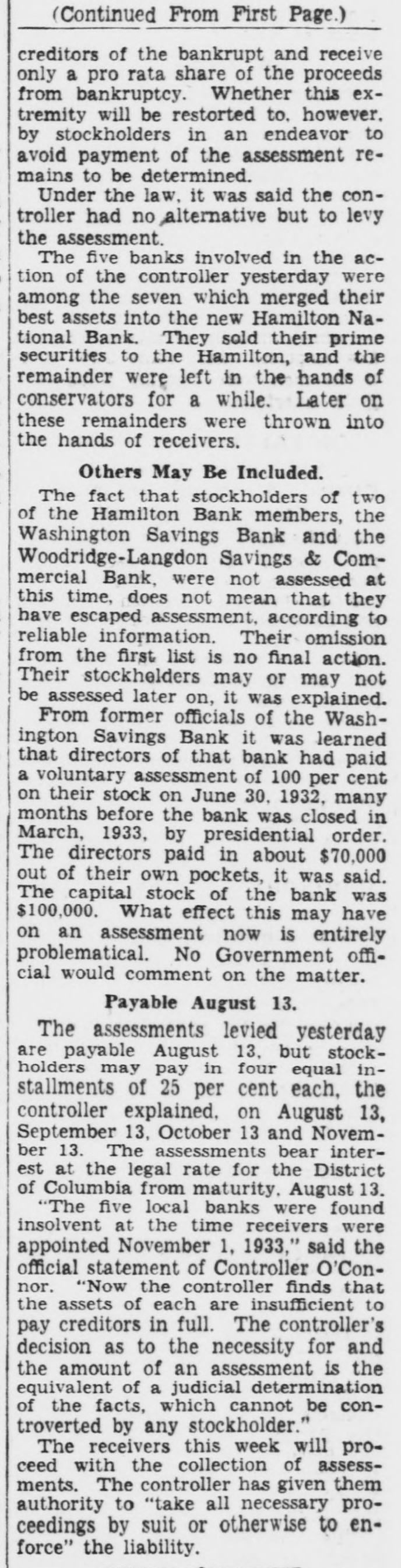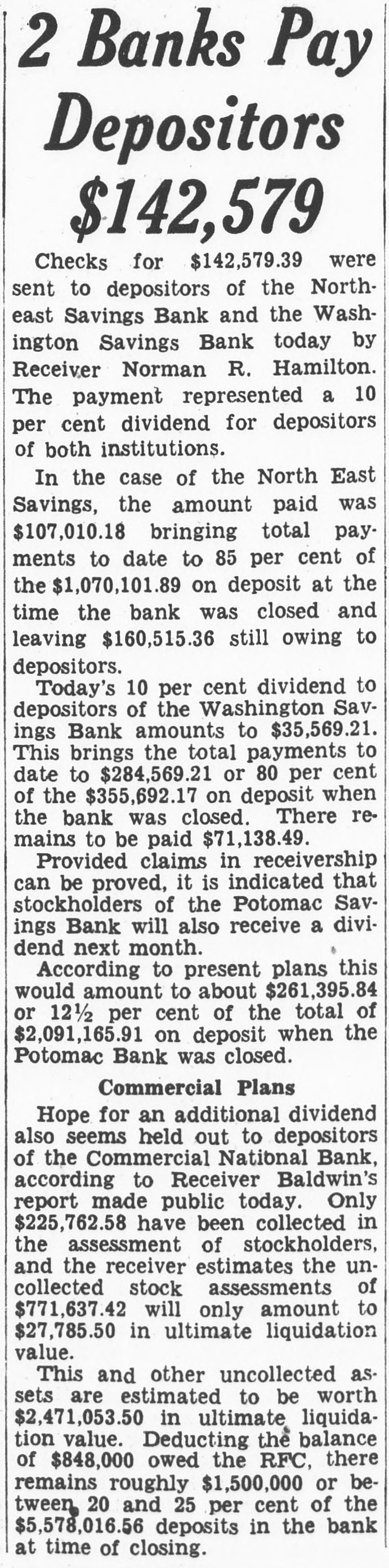 LOCAL BANKS ACT TO PROTECT FUNDS District National Limits Withdrawals-Others Invoke 60Day Clause on Savings. The District National Bank opened today on a 5 per cent withdrawal basis, following action taken by the directors early this morning, for the protection of depositors. President Joshua Evans, jr., announced. (The following notice was addressed today to the depositors in the bank: "Owing to heavy withdrawals of deposits during the last few days, and in order to safeguard all of our depositors, the board of directors has passed a resolution allowing depositors to withdraw 5 per cent of their balances in this bank at the close of business February 28, 1933, until further notice. All new deposits and new accounts opened March 1, 1933, and thereafter are subject to 100 per cent withdrawal at any time after actual realization cf funds by the bank." 60-Day Clause Invoked. The officials stressed the fact that all deposits made today and after this date can be withdrawn in full at any time. It was announced in the financial district that most of the local building and loan associations have invoked their time clauses on withdrawals, limiting the amount to $100. For larger amounts notice must be given in advance. Officials said the rule would be in force for the present. Several savings banks here invoked the 60-day clause on withdrawal of savings accounts. Some of these banks permit the withdrawal of 10 per cent up to $100. Above that amount, the 60day or two-month notice, is being required. Protective Measure. Among the local banks which have adopted this rule-the same plan which has been adopted extensively in other cities-are: United States Savings Bank, Chevy Chase Savings Bank, Security Savings & Commercial Bank, Park Savings Bank, Seventh Street Savings Bank, Washington Savings Bank, Anacostia Bank, Mount Vernon Savings Bank and the Northeast Savings Bank. (In an earlier edition of The Star the name of the Washington Mechanics' Savings Bank was included with those involking the 60-day clause. This was incorrect.) Officials said the action was taken merely as a protective measure, both for the banks and for the depósitors. The Commercial National Bank. which closed yesterday, has been placed in the hands of Robert C. Baldwin, a receiver of the office of the controller of the currency. Mr. Baldwin has taken over the receivership from J. L. Bailey, who took charge when the bank was closed. It was explained that Mr. Bailey will remain for a while in his capacity as a national Bank examiner to assist Mr. Baldwin. Has Considerable Experience. In the meantime, it was said at the Treasury Department, the new receiver probably will use a large part of the staff of the bank for his work. The new receiver. before Joining the office of the Controller of th è Currency, had considerable liquidating experience. Under the auspices of the Government he has been receiver for e bank at Lynn, Mass., since the latter part of 1931, and has been directing its liquidation. An official of the Treasury said in regard to Mr. Baldwin: "By reason of his ability in liquidating that bank, the Treasury Department saw fit to transfer him to the Commercial National Bank. We have every confidence that he will administer the affairs of the institution in a manner satisfactory to all concerned."