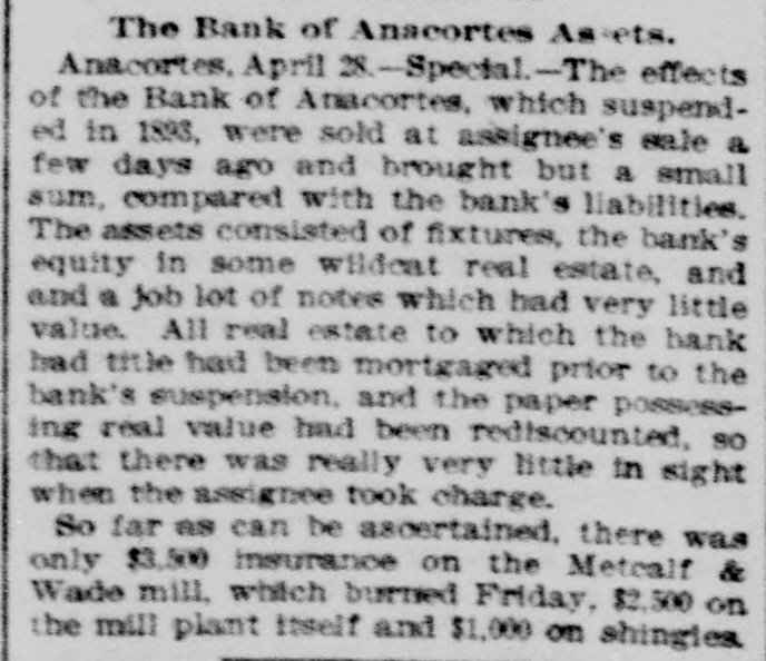 The Bank of Anscortes Assets. Anacortes, April 28.-Spectal.-The effects of the Bank of Anacortes, which suspended in 1893, were sold at assignee's sale a few days ago and brought but a small sum, compared with the bank's liabilities. The assets consisted of fixtures, the bank's equity in some wildcat real estate, and and a Job lot of notes which had very little value. All real estate to which the bank had title had been mortgaged prior to the bank's suspension, and the paper possessing real value had been rediscounted, so that there was really very little in sight when the assignee took charge. So far as can be ascertained, there was only $3,500 insurance on the Metcalf & Wade mill, which burned Friday, $2,500 on the mill plant itself and $1,000 on shingies.