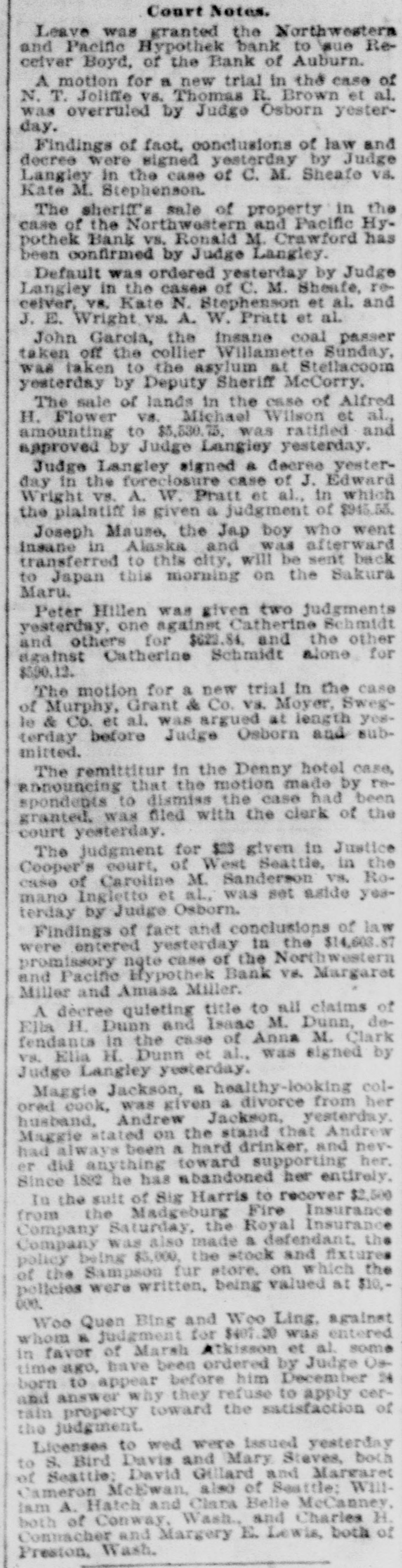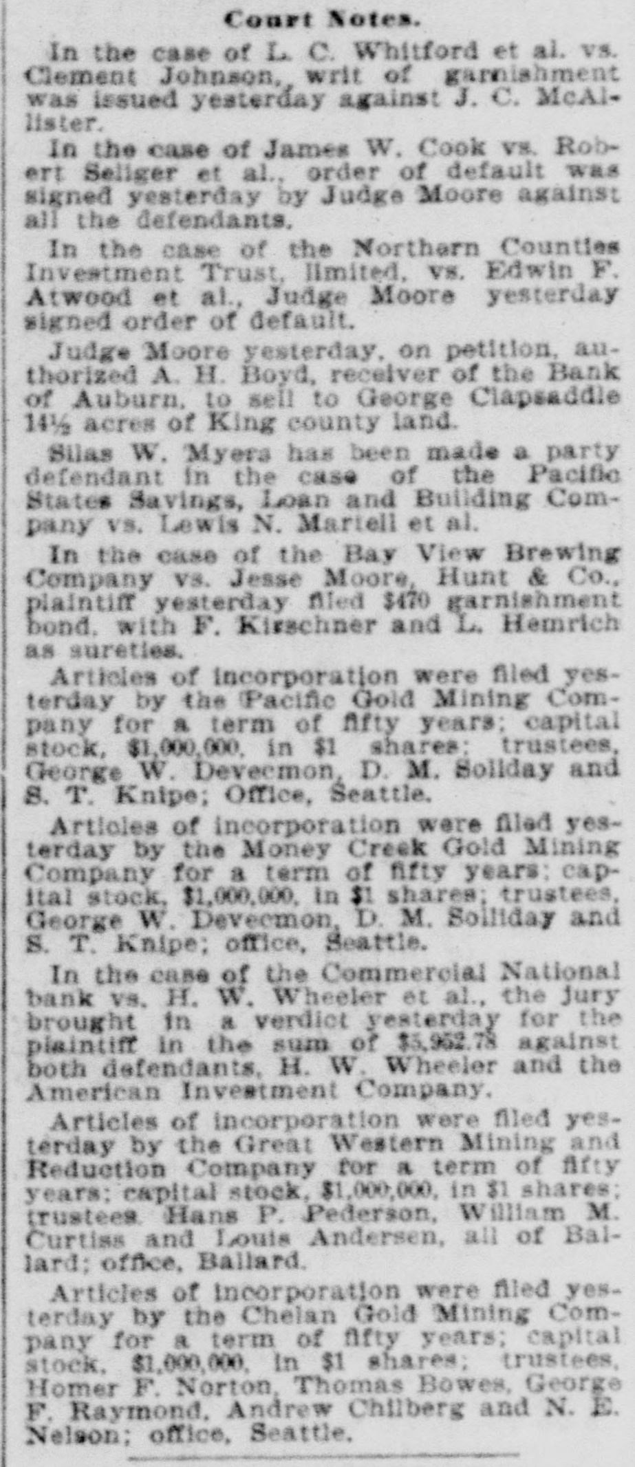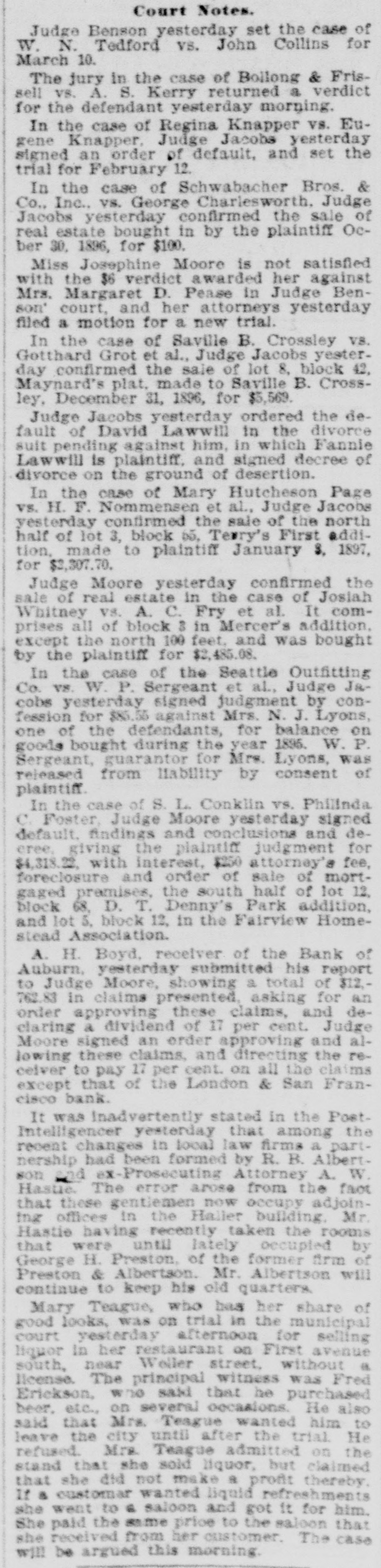 Court Notes. Judge Benson yesterday set the case of W. N. Tedford VS. John Collins for March 10. The jury in the case of Bollong & Frissell vs. A. S. Kerry returned a verdict for the defendant yesterday morning. In the case of Regina Knapper vs. Eugene Knapper, Judge Jacobs yesterday signed an order of default, and set the trial for February 12. In the case of Schwabacher Bros. & Co., Inc., vs. George Charlesworth. Judge Jacobs yesterday confirmed the sale of real estate bought in by the plaintiff Ocber 30, 1896, for $100. Miss Josephine Moore is not satisfied with the $6 verdict awarded her against Mrs. Margaret D. Pease in Judge Benson' court, and her attorneys yesterday filed a motion for a new trial. In the case of Saville B. Crossley VS. Gotthard Grot et al., Judge Jacobs yesterday confirmed the sale of lot 8, block 42, Maynard's plat, made to Saville B. Crossley, December 31, 1896, for $5,569. Judge Jacobs yesterday ordered the default of David Lawwill in the divorce suit pending against him, in which Fannie Lawwill is plaintiff. and signed decree of divorce on the ground of desertion. In the case of Mary Hutcheson Page vs. H. F. Nommensen et al., Judge Jacobs yesterday confirmed the sale of the north half of lot 3, block 65, Terry's First addition, made to plaintiff January 3, 1897, for $3,307.70. Judge Moore yesterday confirmed the sale of real estate in the case of Josiah Whitney vs. A. C. Fry et al. It comprises all of block 3 in Mercer's addition. except the north 100 feet, and was bought by the plaintiff for $2,485.08. In the case of the Seattle Outfitting Co. VS. W. P. Sergeant et al., Judge Jacobs yesterday signed judgment by confession for $85.55 against Mrs. N. J. Lyons, one of the defendants, for balance on goods bought during the year 1895. W. P. Sergeant, guarantor for Mrs. Lyons, was released from liability by consent of plaintiff. In the case of S. L. Conklin vs. Philinda C. Foster, Judge Moore yesterday signed default. findings and conclusions and decree. giving the plaintiff judgment for $4,318.22, with interest, $250 attorney's fee, foreclosure and order of sale of mortgaged premises, the south half of lot 12, block 68, D. T. Denny's Park addition, and lot 5, block 12, in the Fairview Homestead Association. A. H. Boyd, receiver of the Bank of Auburn. yesterday submitted his report to Judge Moore, showing a total of $12,762.83 in claims presented, asking for an order approving these claims, and declaring a dividend of 17 per cent. Judge Moore signed an order approving and allowing these claims, and directing the receiver to pay 17 per cent. on all the claims except that of the London & San Francisco bank. It was Inadvertently stated in the PostIntelligencer yesterday that among the recent changes in local law firms a partnership had been formed by R. B. Albertson and ex-Prosecuting Attorney A. W. Hastie. The error arose from the faot that these gentlemen now occupy adjointng offices in the Haller building. Mr. Hastie having recently taken the rooms that were until lately occupied by George H. Preston, of the former firm of Preston & Albertson. Mr. Albertson will continue to keep his old quarters. Mary Teague, who bas her share of good looks, was on trial in the municipal court yesterday afternoon for selling Hquor In her restaurant on First avenue south, near Woller street, without a license. The principal witness was Fred Erickson, who said that he purchased bear. etc., on several occasions. He also said that Mrs. Teague wanted him to leave the city until after the trial. He refused. Mrs. Teague admitted on the stand that she sold liquor, but claimed that she did not make a profit thereby. If a customer wanted liquid refreshments she went to 6 saloon and got It for him. She paid the same price to the saloon that she received from her customer. The case will be argued this morning.