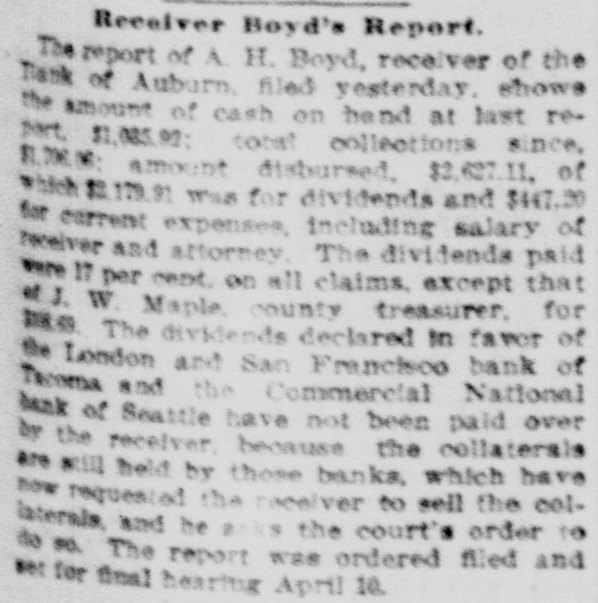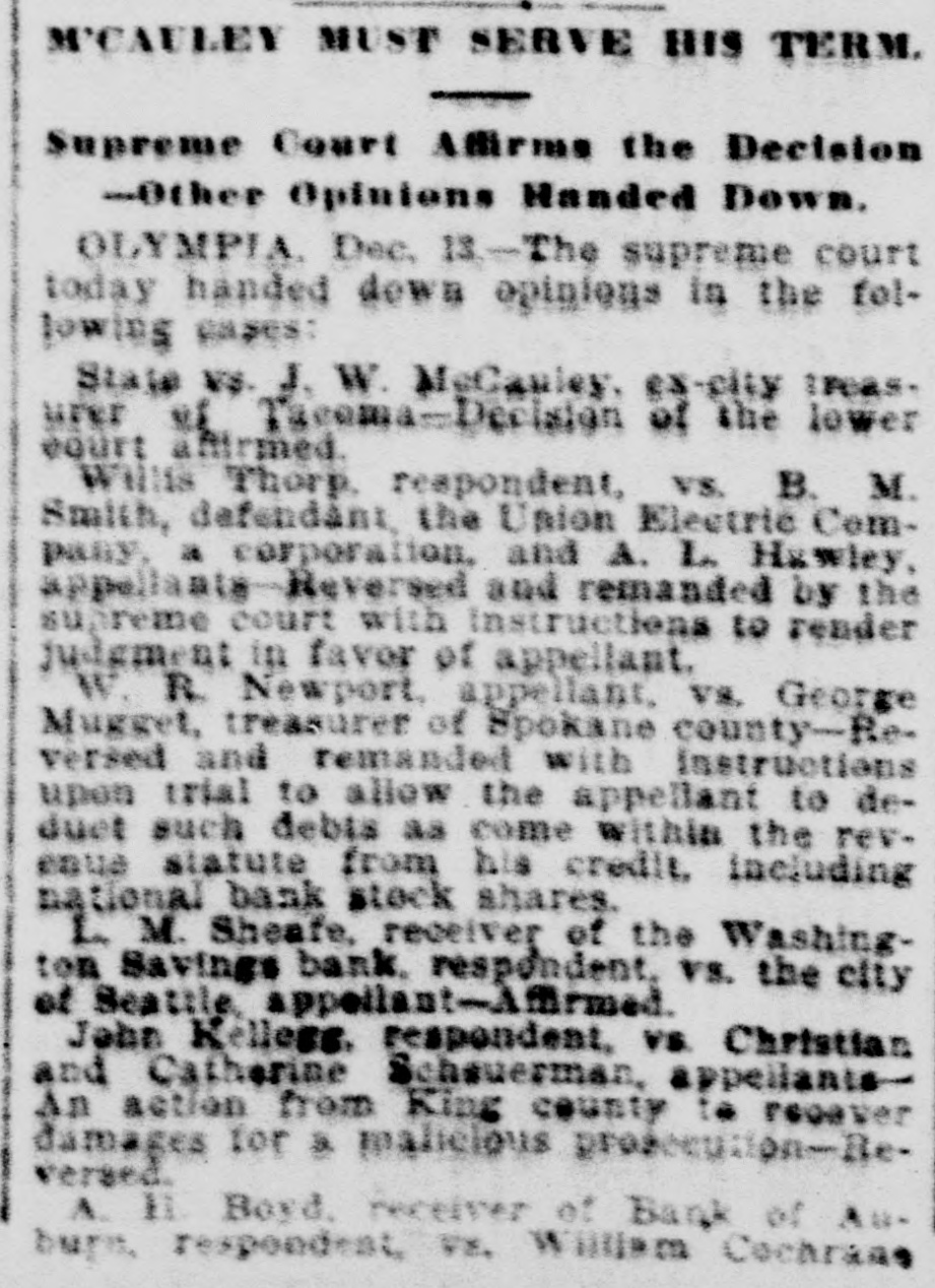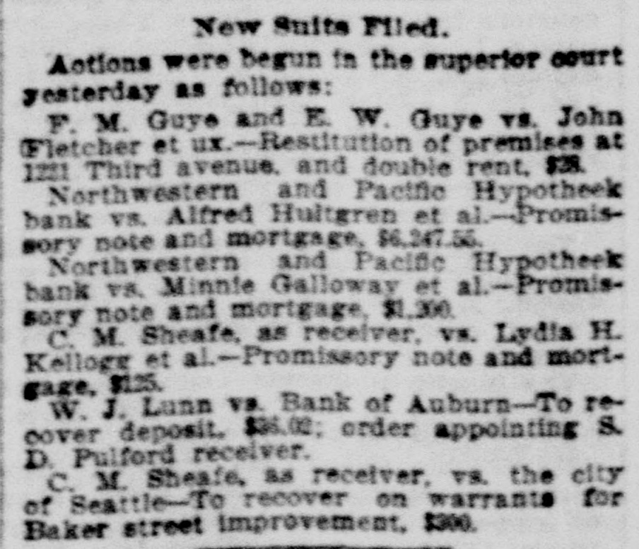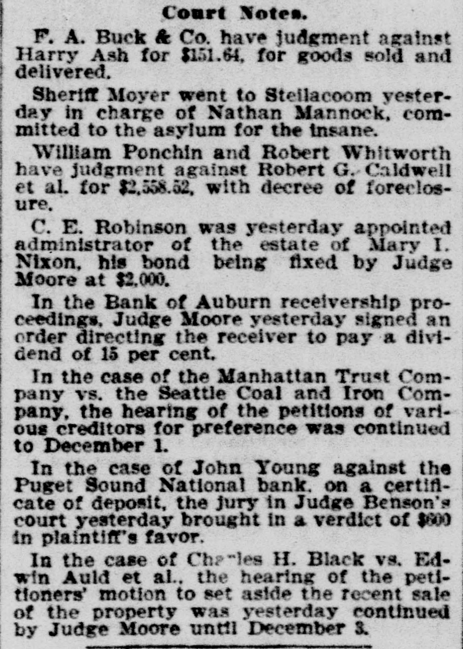 Court Notes. Judge Benson yesterday set the case of W. N. Tedford VS. John Collins for March 10. The jury in the case of Bollong & Frissell vs. A. S. Kerry returned a verdict for the defendant yesterday morning. In the case of Regina Knapper vs. Eugene Knapper, Judge Jacobs yesterday signed an order of default, and set the trial for February 12. In the case of Schwabacher Bros. & Co., Inc., vs. George Charlesworth. Judge Jacobs yesterday confirmed the sale of real estate bought in by the plaintiff Ocber 30, 1896, for $100. Miss Josephine Moore is not satisfied with the $6 verdict awarded her against Mrs. Margaret D. Pease in Judge Benson' court, and her attorneys yesterday filed a motion for a new trial. In the case of Saville B. Crossley VS. Gotthard Grot et al., Judge Jacobs yesterday confirmed the sale of lot 8, block 42, Maynard's plat, made to Saville B. Crossley, December 31, 1896, for $5,569. Judge Jacobs yesterday ordered the default of David Lawwill in the divorce suit pending against him, in which Fannie Lawwill is plaintiff. and signed decree of divorce on the ground of desertion. In the case of Mary Hutcheson Page vs. H. F. Nommensen et al., Judge Jacobs yesterday confirmed the sale of the north half of lot 3, block 65, Terry's First addition, made to plaintiff January 3, 1897, for $3,307.70. Judge Moore yesterday confirmed the sale of real estate in the case of Josiah Whitney vs. A. C. Fry et al. It comprises all of block 3 in Mercer's addition. except the north 100 feet, and was bought by the plaintiff for $2,485.08. In the case of the Seattle Outfitting Co. VS. W. P. Sergeant et al., Judge Jacobs yesterday signed judgment by confession for $85.55 against Mrs. N. J. Lyons, one of the defendants, for balance on goods bought during the year 1895. W. P. Sergeant, guarantor for Mrs. Lyons, was released from liability by consent of plaintiff. In the case of S. L. Conklin vs. Philinda C. Foster, Judge Moore yesterday signed default. findings and conclusions and decree. giving the plaintiff judgment for $4,318.22, with interest, $250 attorney's fee, foreclosure and order of sale of mortgaged premises, the south half of lot 12, block 68, D. T. Denny's Park addition, and lot 5, block 12, in the Fairview Homestead Association. A. H. Boyd, receiver of the Bank of Auburn. yesterday submitted his report to Judge Moore, showing a total of $12,762.83 in claims presented, asking for an order approving these claims, and declaring a dividend of 17 per cent. Judge Moore signed an order approving and allowing these claims, and directing the receiver to pay 17 per cent. on all the claims except that of the London & San Francisco bank. It was Inadvertently stated in the PostIntelligencer yesterday that among the recent changes in local law firms a partnership had been formed by R. B. Albertson and ex-Prosecuting Attorney A. W. Hastie. The error arose from the faot that these gentlemen now occupy adjointng offices in the Haller building. Mr. Hastie having recently taken the rooms that were until lately occupied by George H. Preston, of the former firm of Preston & Albertson. Mr. Albertson will continue to keep his old quarters. Mary Teague, who bas her share of good looks, was on trial in the municipal court yesterday afternoon for selling Hquor In her restaurant on First avenue south, near Woller street, without a license. The principal witness was Fred Erickson, who said that he purchased bear. etc., on several occasions. He also said that Mrs. Teague wanted him to leave the city until after the trial. He refused. Mrs. Teague admitted on the stand that she sold liquor, but claimed that she did not make a profit thereby. If a customer wanted liquid refreshments she went to 6 saloon and got It for him. She paid the same price to the saloon that she received from her customer. The case will be argued this morning.