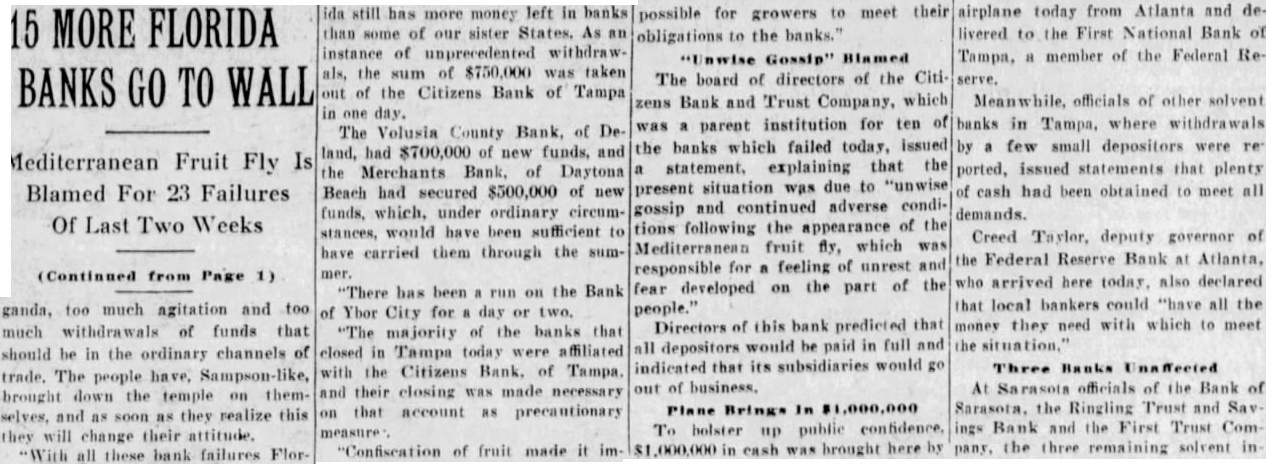 14 SOUTH FLORIDA BANKS ARE CLOSED Total Failures in Past Two Weeks Reaches 22, With Collapse of Chain. By the Associated Press. TAMPA, Fla., July 17.-Fourteen State banks in Southwest Florida closed their doors today, bringing to 23 the number of financial institutions to fail within the State in the past two weeks. Following the closing of the Citizens' Bank & Trust Co. of Tampa and nine subsidiary institutions here and in nearby counties today, it was learned that five other banks in this territory also had failed. Total deposits in the Tampa banks involved was $17,347,968.15, of which the Citizens' Bank & Trust held $13;695.870.78. Total assets of the Tampa banks were $22,927,003.36. The institutions placed in the hands of the State banking department today were: The Citizens" Bank & Trust Co., Tampa Franklin Bank, Tampa. The Lafayette Bank, Tampa. American State Bank, Tampa. The Citizens' Nebraska Avenue Bank, Tampa. The Bank of Ybor City, at Ybor City, on which there was a run Monday. The Bank of Plant City, Plant City. The Bradenton Bank & Trust Co., Bradenton. The First Bank & Trust Co., Sarasota. First State Bank of Fort Meade. The Bank of Pasco County, Dade City. First Bank of Port Tampa City. Bank of Mulberry, at Mulberry. Ellenton State Bank, Ellenton. Other institutions which have closed their doors within the past two weeks are: Peoples State Bank, Jacksonville. Volusia County Bank & Trust Co., Deland. First National Bank, Deland. Colonial Bank & Trust Co., Miami. Merchants' Bank & Trust Co., Daytona Beach. Atlantic Bank & Trust Co., Daytona Beach. First National Bank, Sanford. Merchants' Bank, Melbourne. Capital and surplus of the 15 institutions that closed today, according to figures released by the State banking department, totaled $3,890,000. Deposits aggregated $22,283,963.61 and assets $29,679,107.51. Deposits of the eight banks which failed during the two weeks prior to today were estimated at $10,800,000, bringing the total deposits tied up in bank failures to date at $33,083,963.61. E. P. Jackson, State examiner, has been here since Monday checking up on condition. Capt. R. A. Gray, assistant to the State controller, was expected from Tallahassee at noon to take charge. The board of directors of the Citizens' Bank & Trust Co. predicted that all depositors would be paid in full and that the depositories would go out of business. EXPLAINS BANK FAILURES.