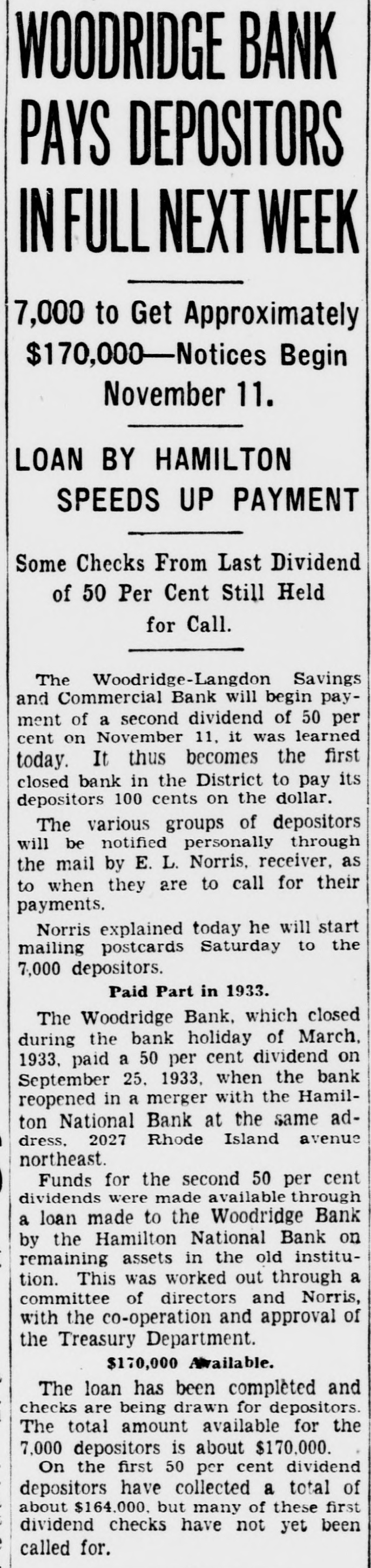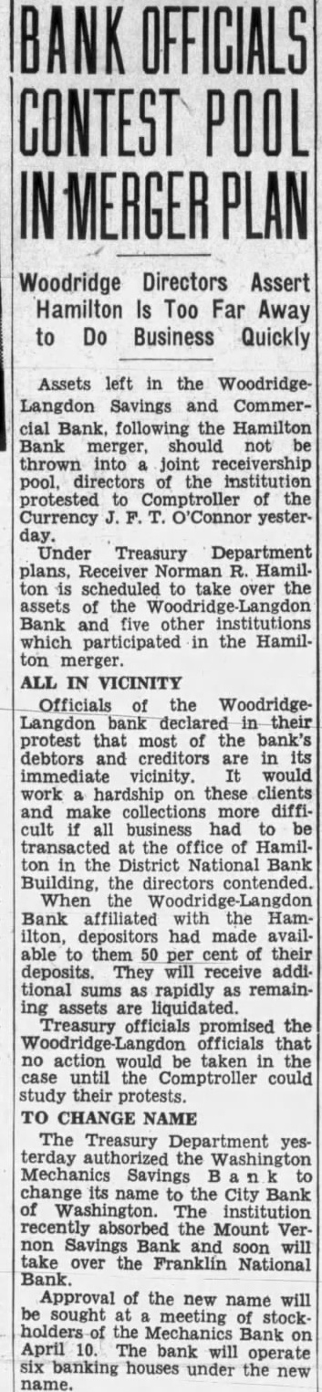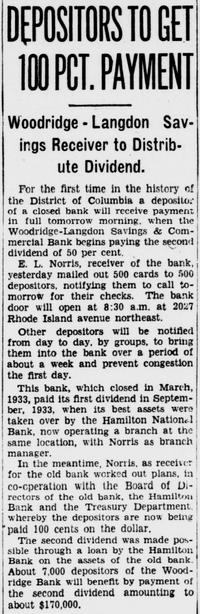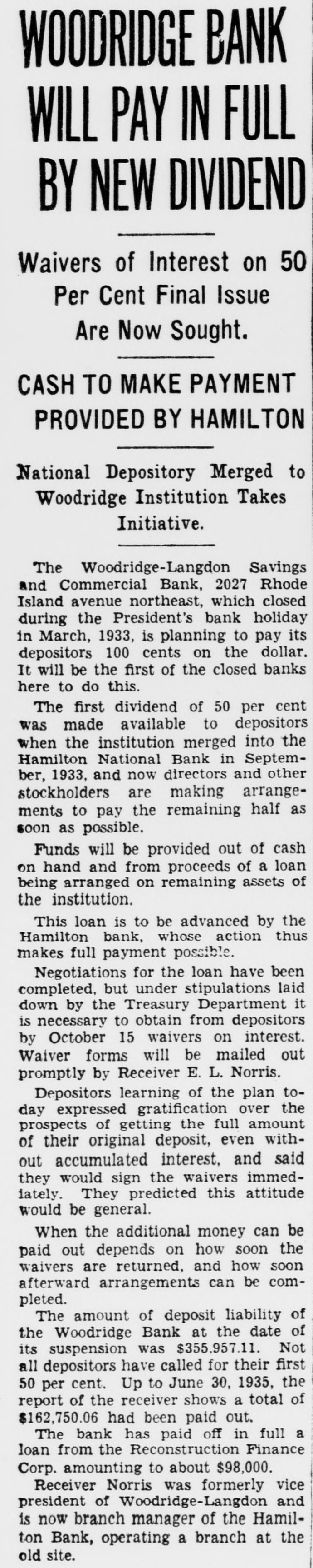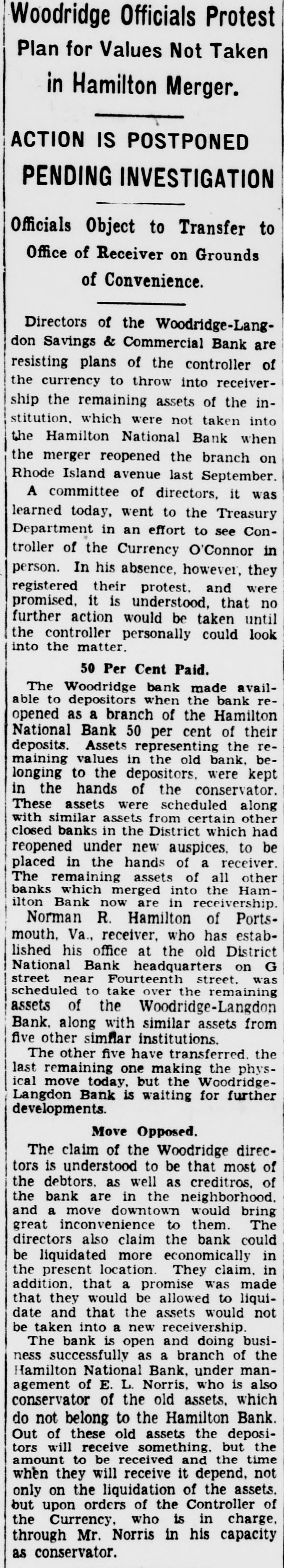HAMILTON BANK'S OPENING MARKED BY NEW DEPOSITS One Receipt of $100,000 and Another for $50,000 Reported. BALANCE EXPECTED TO GROW DURING DAY President Graham and Other Officers Recipients of Many Congratulations With its headquarters and seven branches decorated with flowers and comfortably filled with customers, the new Hamilton National Bank opened today, releasing about $8,000,000 in deposits. To the surprise of both officials of the bank and police who had been stationed at each of the buildings. no lines formed before the opening hour of 8:30 and early crowds were small. The number of customers increased, however, during the morning hours until just before noon most of the lobbies were fairly well filled. Some persons were withdrawing while some others were making new deposits. President E C. Graham of the Hamilton merger and other officers were flooded with congratulations arriving by mail and by wire and there was a spectacular floral exhibit of baskets of flowers at headquarters. Deputy Controller of the Currency Lioyd G. Awalt called at the Hamilton Bank shortly after noon to greet President Graham and congratulate the officers on the opening of the new institution. Awalt was acting controller of the currency when the movement for merger of the Hamilton Bank was first started He came to the bank in the company of Maj. W Irving Shuman of the Treasury Department. who had handled the Government's negotiations for opening the new merger Most of the withdrawals were said to be small while there were many substantial new accounts. officials said Among the deposits at Hamilton headquarters at Fourteenth and G streets were one for $100,000 and another for $50,000. Larger Deposits Seen. While some bank officials were too conservative to make a prediction about the net business for the day. it was freely predicted in some quarters where the flow of business was being watched closely that by the end of the day the Hamilton would have ,larger deposits than when it opened for business this morning. The first customer at Hamilton headquarters arrived at 7:15 a m. with a request to make a deposit. He was George Tait. 421 Fifteenth street southeast He was admitted and made a deposit While the formal opening hour was 8 :30. the front doors of the Hamilton headquarters were actually opened for a little group of about four women who were there at 8:15. and from then on the customers came in a small but seadily increasing stream during the morning Established with a capital stock of $1,000,000, with $250,000 surplus. the Hamilton had on hand this morning to meet the demands of its depositors $2,500,000 in cash, President Graham said Most of this had been delivered to headquarters and to four of the member branches Saturday, but some of it was distributed to the three branches of the old Federal-American National Bank & Trust Co. early this morning President Graham. in an official statement on the financial set-up of the bank today said With a capital structure of $1.250.000, the Hamilton National Bank eniovs the unique position of being practically without liabilities beyond its deposits. Unencumbered by Loans, "In respect to assets. the Hamilton is a particularly model example We are unencumbered by loans or real estate All assets taken over by the bank consist of cash Government bonds, listed bonds at Saturday's selling prices. and loans on which schedules are checked up to date by the United States Treasury and Federal Reserve Board. This statement plainly shows that the Hamilton Bank has nothing but prime assets upon which depend the security and financial integrity of an institution of this kind. The value of equipment for the several banks comprising the Hamilton institution amounts to less than $50,000 The Hamilton has not borrowed a dollar from the R. F. C. or from any other source. Meantime, the Treasury Department had no appointed new conservators to take the place of four men who were taken over by the Hamilton National Bank for its official staff What the Treasury will do in this respect remains to be seen, although the business of conservatorship was moving forward today in these four banks- the District National. the Washington Savings, the Northeast Savings and the WoodridgeLangdon Savings and Commercial Bank. Some kind of action by the Treasury is anticipated soon in this respect as the situation regarding these in old member banks is now left "up the air." This, however, does not affect in any way the operation of the new Hamilton merger and it is anticipated that the Treasury will clear up the inservatorship question shortly Reports received at Hamilton headquarters from its seven branches pointed to a situation in the outlying houses very similar to that at headquarters. Many persons were making withdrawal (Continued on Page 3. Column 5.)