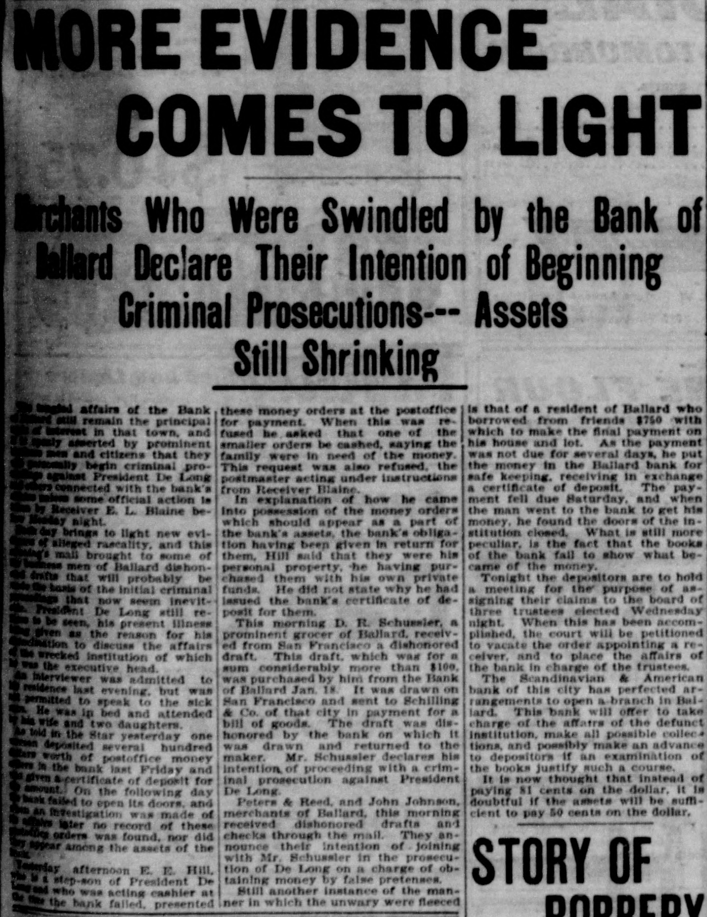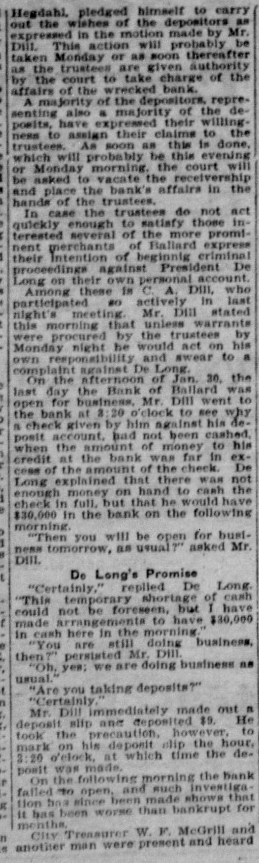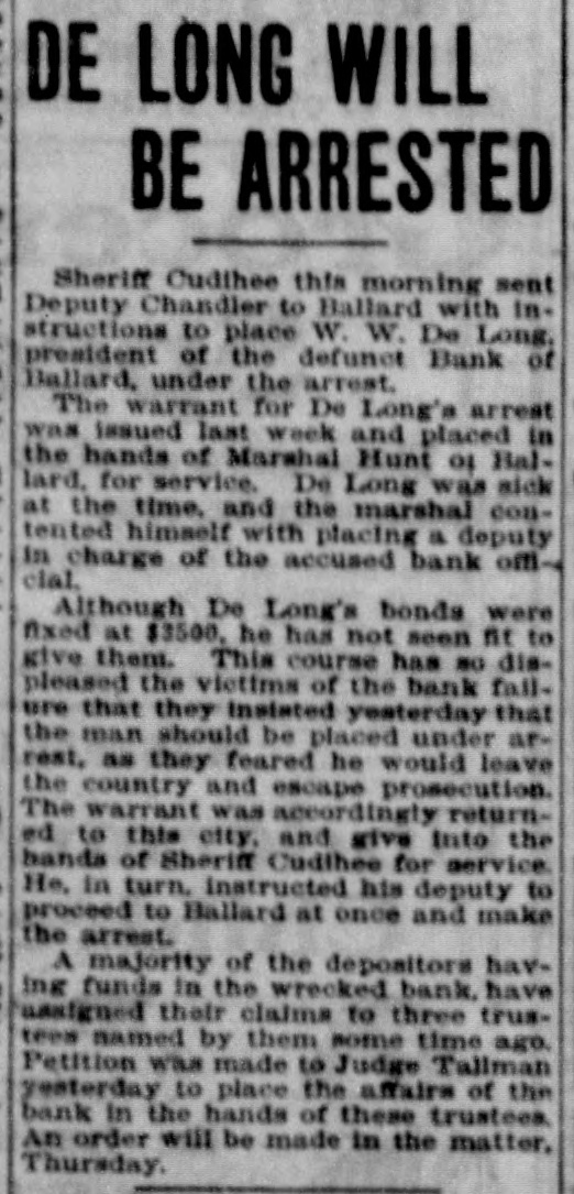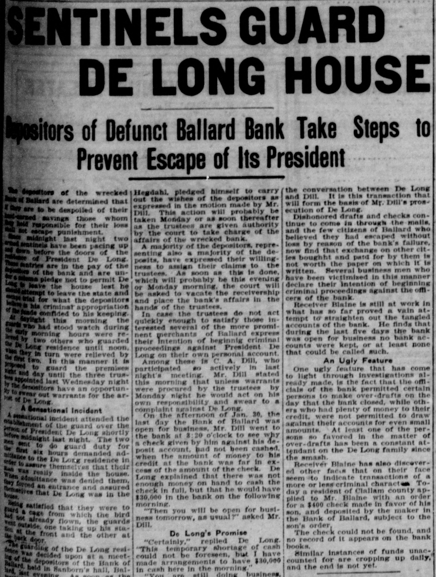 SENTINELS GUARD DE LONG HOUSE Repositors of Defunct Ballard Bank Take Steps to Prevent Escape of Its President the conversation between De Long m depositors of the wrecked Hegdahl. pledged himself to carry and Dill. It is this transaction that out the wishes of the depositors an if Ballard are determined that will form the basis of Mr. Dill's promexpressed in the motion made by Mr. ecution of De Long. they are to be despoiled of their Dill. This action will probably be Dishonored drafts and checks consavings those whom taken Monday or as soon thereafter tinue to come in through the mails, held responsible for their loss as the trustees are given authority and the few citizens of Ballard who shall Bot escape punishment. by the court to take charge of the believed they had escaped without affairs of the wrecked bank. midnight last night two loss by reason of the bank's failure, sentineis have been pacing up A majority of the depositors, reprenow find that exchange on other citand Gown before the doors of the senting also a majority of the deles boughht and paid for by them is refilence of President De Long. posits, have expressed their willingif not worth the paper on which It is Matries are in the pay of the ness to assign their claims to the written. Several business men who of the bank and are untrustees. As soon as this is done, have been victimized in this manner miems piedge not to permit De which will probably be this evening declare their Intention of beginning leave the house lest he or Monday morning. the court will criminal proceedings against the offiattempt to leave the state and be asked to vacate the receivership cers of the bank. Vial for what the depositors and place the bank's affairs in the Receiver Blaine is still at work in hands of the trustees. his criminal appropriation what has so far proved a vain atIn case the trustees do not act the funds confided to his keeping. tempt to straighten out the tangled At deylight this morning the quickly enough to satisfy those inaccounts of the bank. He finds that terested several of the more promlsuards who had stood watch during during the last five days the bank the easly morning hours were renent merchants of Ballard express was open for business no bank actheir Intention of beginnig criminal lieved by two others who guarded counts were kept, or at least none the De Long residence until noon, proceedings against President De that could be called such. *Mn they in turn were relieved by Long on their own personal account. the first two, In this manner it in An Ugly Feature Among these is C. A. Dill, who Imposed to guard the premises One ugly feature that has come participated 80 actively in last Night and day until the three trusnight's meeting. Mr. Dill stated to light through investigations alby appointed last Wednesday night this morning that unless warrants ready made, is the fact that the offiby the depositors have an opportunclais of the bank permitted certain were procured by the trustees by My to swear out warrants for the arMonday night he would act on his persons to make over-drafts on the of De Long. own responsibility and swear to a day that the bank closed, while othcomplaint against De Long. ers who had plenty of money to their A Consational Incident On the afternoon of Jan. 30, the credit. were not permitted to draw A Immational incident attended the last day the Bank of Ballard was against their accounts for even small mablishment of the guard over the open for business, Mr. Dill went to amounts. At least one of the perperson of President De Long shortly the bank at 8:20 o'clock to see why sons 80 favored in the matter of before midnight last night, The two a check given by him against his deover-drafts has been a. constant atmen the sent to do guard duty for posit account. had not been cashed. tendant on the De Long family since first six hours demanded adwhen the amount of money to his the smash. mistance to the De Long residence in credit at the bank WAR far in exReceiver Blaine has also discoverorder to assure themselves that their cess of the amount of the check. De ed other facts that on their face lan was really Inside the house. Long explained that there was not seem to Indicate transactions of a When admittance was denied them, enough money on hand to cash the more or less criminal charact Tothey forced an entrance and assured check in full. but that he would have day a resident of Clallam county aphouse, memselves that De Long was in the $30,000 in the bank on the following plied to Mr. Blaine with an order morning. for a $400 check made in favor of his Being satisfied that they were to "Then you will be open for busison, and deposited by the maker in hard w a cage from which the bird ness tomorrow, as usual? asked Mr. the Bank of Ballard, subject to the were not already flown, the guards Dill. mon's order, the outside. one taking up his staThe check could not be found, and Do Long's Promise the at the front and the other at no record of It appears on the bank back door, "Certainly," replied De Long. books. "This temporary shortage of cash dence The guarding of the De Long resiSimilar instances of funds unaccould not be foreseen, but I have Ing was decided upon at a meetcounted for are cropping up daily, made arrangementa to have $30,000 of the depositors of the Bank of and the end is not yet. in cash here in the morning." Ballard. lard, isst held in Sanborn's hall, Balare still doing business. evening the As