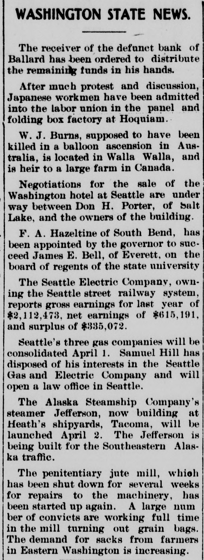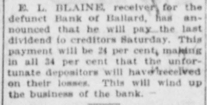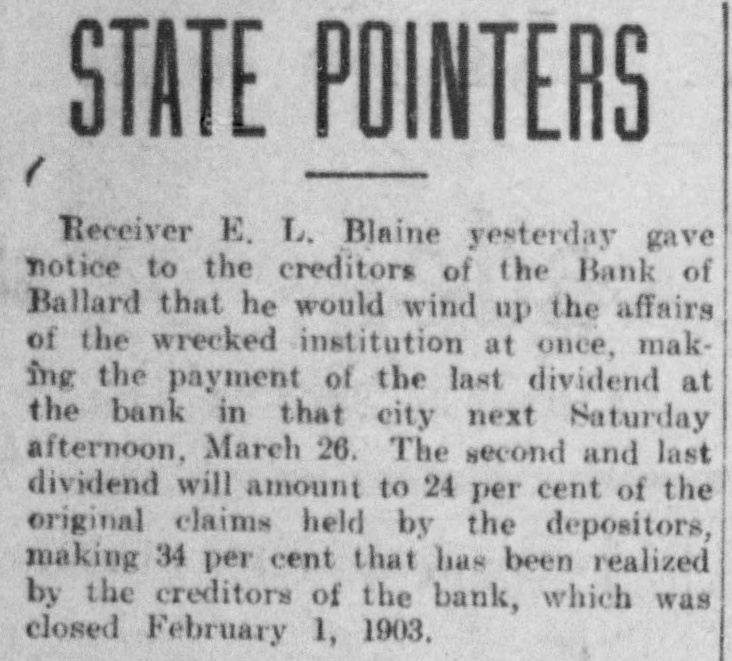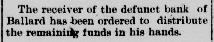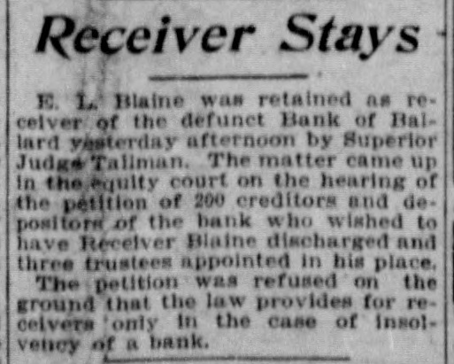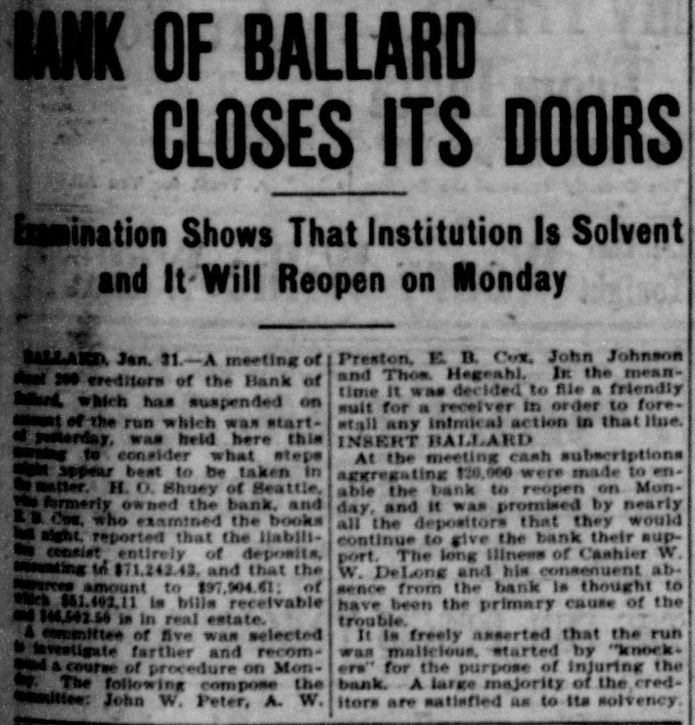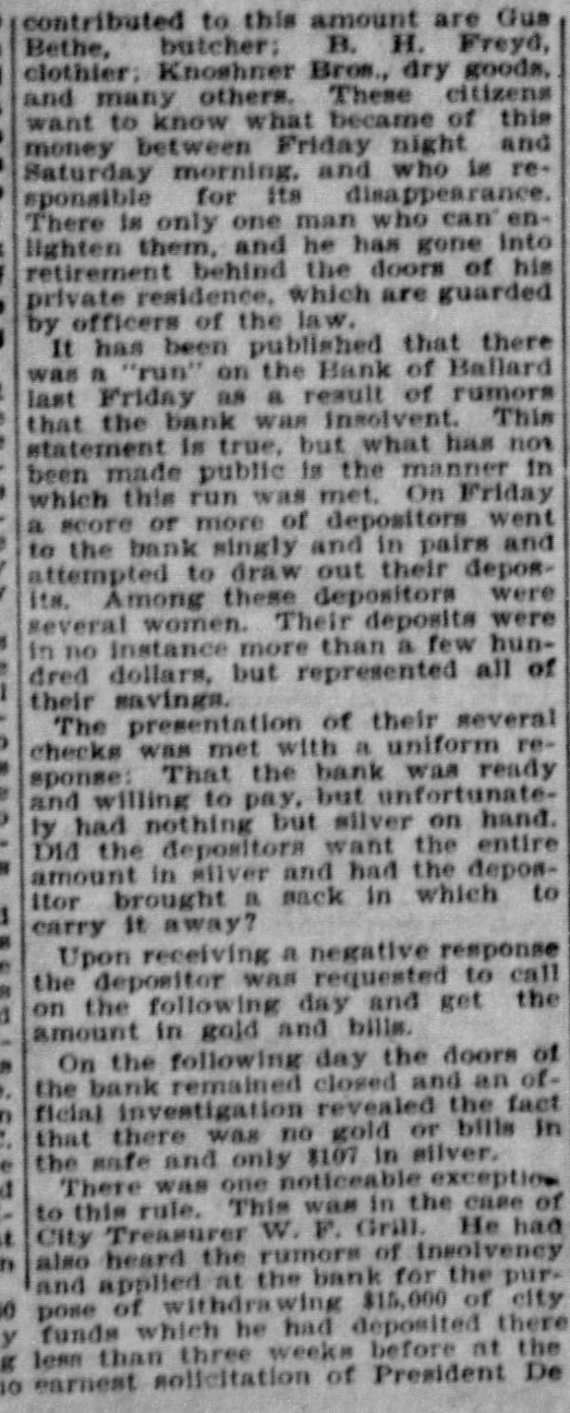 SENTINELS GUARD DE LONG HOUSE Repositors of Defunct Ballard Bank Take Steps to Prevent Escape of Its President the conversation between De Long m depositors of the wrecked Hegdahl. pledged himself to carry and Dill. It is this transaction that out the wishes of the depositors an if Ballard are determined that will form the basis of Mr. Dill's promexpressed in the motion made by Mr. ecution of De Long. they are to be despoiled of their Dill. This action will probably be Dishonored drafts and checks consavings those whom taken Monday or as soon thereafter tinue to come in through the mails, held responsible for their loss as the trustees are given authority and the few citizens of Ballard who shall Bot escape punishment. by the court to take charge of the believed they had escaped without affairs of the wrecked bank. midnight last night two loss by reason of the bank's failure, sentineis have been pacing up A majority of the depositors, reprenow find that exchange on other citand Gown before the doors of the senting also a majority of the deles boughht and paid for by them is refilence of President De Long. posits, have expressed their willingif not worth the paper on which It is Matries are in the pay of the ness to assign their claims to the written. Several business men who of the bank and are untrustees. As soon as this is done, have been victimized in this manner miems piedge not to permit De which will probably be this evening declare their Intention of beginning leave the house lest he or Monday morning. the court will criminal proceedings against the offiattempt to leave the state and be asked to vacate the receivership cers of the bank. Vial for what the depositors and place the bank's affairs in the Receiver Blaine is still at work in hands of the trustees. his criminal appropriation what has so far proved a vain atIn case the trustees do not act the funds confided to his keeping. tempt to straighten out the tangled At deylight this morning the quickly enough to satisfy those inaccounts of the bank. He finds that terested several of the more promlsuards who had stood watch during during the last five days the bank the easly morning hours were renent merchants of Ballard express was open for business no bank actheir Intention of beginnig criminal lieved by two others who guarded counts were kept, or at least none the De Long residence until noon, proceedings against President De that could be called such. *Mn they in turn were relieved by Long on their own personal account. the first two, In this manner it in An Ugly Feature Among these is C. A. Dill, who Imposed to guard the premises One ugly feature that has come participated 80 actively in last Night and day until the three trusnight's meeting. Mr. Dill stated to light through investigations alby appointed last Wednesday night this morning that unless warrants ready made, is the fact that the offiby the depositors have an opportunclais of the bank permitted certain were procured by the trustees by My to swear out warrants for the arMonday night he would act on his persons to make over-drafts on the of De Long. own responsibility and swear to a day that the bank closed, while othcomplaint against De Long. ers who had plenty of money to their A Consational Incident On the afternoon of Jan. 30, the credit. were not permitted to draw A Immational incident attended the last day the Bank of Ballard was against their accounts for even small mablishment of the guard over the open for business, Mr. Dill went to amounts. At least one of the perperson of President De Long shortly the bank at 8:20 o'clock to see why sons 80 favored in the matter of before midnight last night, The two a check given by him against his deover-drafts has been a. constant atmen the sent to do guard duty for posit account. had not been cashed. tendant on the De Long family since first six hours demanded adwhen the amount of money to his the smash. mistance to the De Long residence in credit at the bank WAR far in exReceiver Blaine has also discoverorder to assure themselves that their cess of the amount of the check. De ed other facts that on their face lan was really Inside the house. Long explained that there was not seem to Indicate transactions of a When admittance was denied them, enough money on hand to cash the more or less criminal charact Tothey forced an entrance and assured check in full. but that he would have day a resident of Clallam county aphouse, memselves that De Long was in the $30,000 in the bank on the following plied to Mr. Blaine with an order morning. for a $400 check made in favor of his Being satisfied that they were to "Then you will be open for busison, and deposited by the maker in hard w a cage from which the bird ness tomorrow, as usual? asked Mr. the Bank of Ballard, subject to the were not already flown, the guards Dill. mon's order, the outside. one taking up his staThe check could not be found, and Do Long's Promise the at the front and the other at no record of It appears on the bank back door, "Certainly," replied De Long. books. "This temporary shortage of cash dence The guarding of the De Long resiSimilar instances of funds unaccould not be foreseen, but I have Ing was decided upon at a meetcounted for are cropping up daily, made arrangementa to have $30,000 of the depositors of the Bank of and the end is not yet. in cash here in the morning." Ballard. lard, isst held in Sanborn's hall, Balare still doing business. evening the As