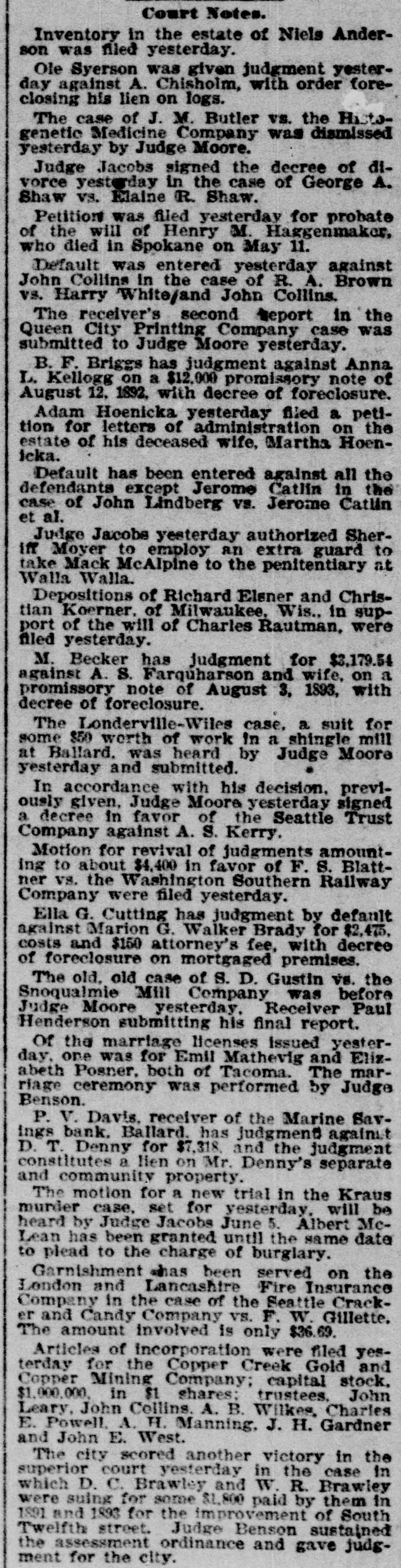 Court Notes. Inventory in the estate of Niels Anderson was filed yesterday. Ole Syerson was given judgment yesterday against A. Chisholm, with order foreclosing his lien on logs. The case of J. M. Butler vs. the Histogenetic Medicine Company was dismissed yesterday by Judge Moore. Judge Jacobs signed the decree of divorce yesterday in the case of George A. Shaw VS. Elaine R. Shaw. Petition was filed yesterday for probate of the will of Henry M. Haggenmaker, who died in Spokane on May 11. Default was entered yesterday against John Collins In the case of R. A. Brown vs. Harry White/and John Collins. The receiver's second Deport in the Queen City Printing Company case was submitted to Judge Moore yesterday. B. F. Briggs has judgment against Anna L. Kellogg on a $12,000 promissory note of August 12. 1892. with decree of foreclosure. Adam Hoenicka yesterday filed a petition for letters of administration on the estate of his deceased wife, Martha Hoenicka. Default has been entered against all the defendants except Jerome Catlin in the case of John Lindberg vs. Jerome Catlin et al. Judge Jacobs yesterday authorized Sheriff Moyer to employ an extra guard to take Mack McAlpine to the penitentiary at Walla Walla. Depositions of Richard Elsner and Christian Koerner. of Milwaukee, Wis., in support of the will of Charles Rautman, were filed yesterday. M. Becker has judgment for $3,179.54 against A. S. Farquharson and wife, on a promissory note of August 3, 1893, with decree of foreclosure. The Londerville-Wiles case, a suit for some $50 worth of work in a shingle mill at Ballard. was heard by Judge Moore yesterday and submitted. In accordance with his decision. previously given, Judge Moore yesterday signed a decree in favor of the Seattle Trust Company against A. S. Kerry. Motion for revival of judgments amounting to about $4,400 in favor of F. S. Blattner vs. the Washington Southern Railway Company were filed yesterday. Ella G. Cutting has judgment by default against Marion G. Walker Brady for $2,475. costs and $150 attorney's fee, with decree of foreclosure on mortgaged premises. The old, old case of S. D. Gustin vs. the Snoqualmie Mill Company was before Judge Moore yesterday. Receiver Paul Henderson submitting his final report. Of the marriage licenses Issued yesterday, one was for Emil Mathevig and Elizabeth Posner, both of Tacoma. The marriage ceremony was performed by Judge Benson. P. V. Davis, receiver of the Marine Savings bank. Ballard. has judgment against D. T. Denny for $7,318. and the judgment constitutes a lien on Mr. Denny's separate and community property. The motion for a new trial in the Kraus murder case, set for yesterday, will be heard by Judge Jacobs June 5. Albert McLean has been granted until the same date to plead to the charge of burglary. Garnishment whas been served on the London and Lancashtre Fire Insurance Company in the case of the Seattle Cracker and Candy Company VS. F. W. Gillette. The amount involved is only $36.69. Articles of incorporation were filed yesterday for the Copper Creek Gold and Copper Mining Company: capital stock, $1,000,000. in $1 shares: trustees. John Leary, John Collins. A. B. Wilkes. Charles E. Powell. A. H. Manning, J. H. Gardner and John E. West. The city scored another victory in the superior court yesterday in the case in which D. C. Brawley and W. R. Brawley were suing for some $1,800 paid by them in 1891 and 1893 for the improvement of South Twelfth street. Judge Benson sustained the assessment ordinance and gave judgment for the city.