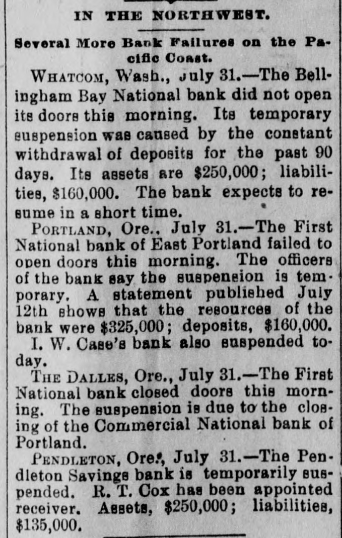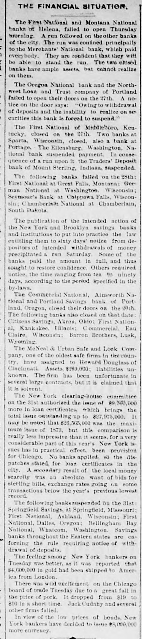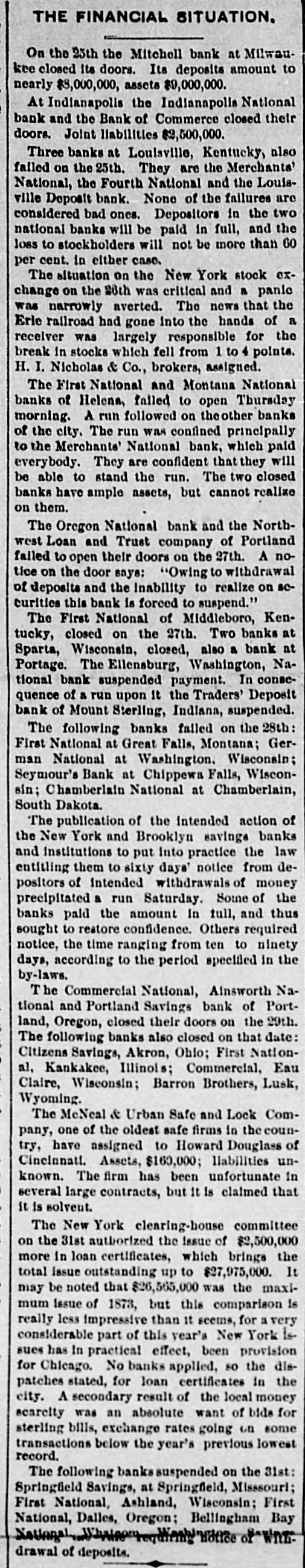 THE FINANCIAL SITUATION. On the 25th the Mitchell bank at Milwaukee closed its doors. Its deposits amount to nearly $8,000,000, assets $9,000,000. At Indianapolis the Indianapolis National bank and the Bank of Commerce closed their doors. Joint liabilities $2,500,000. Three banks at Louisville, Kentucky, also failed on the 25th. They are the Merchants' National, the Fourth National and the Louisville Deposit bank. None of the failures are considered bad ones. Depositors in the two national banks will be paid in full, and the loss to stockholders will not be more than 60 per cent. in either case. The situation on the New York stock exchange on the 28th was critical and a panic was narrowly averted. The news that the Erle railroad had gone into the hands of a receiver was largely responsible for the break in stocks which fell from 1 to 4 points. H. I. Nicholas & Co., brokers, assigned. The First National and Montana National banks of Helena, failed to open Thursday morning. A run followed on theother banks of the city. The run was confined principally to the Merchants' National bank, which paid everybody. They are confident that they will be able to stand the run. The two closed banks have ample assets, but cannot realize on them. The Oregon National bank and the Northwest Loan and Trust company of Portland failed to open their doors on the 27th. A notice on the door says: "Owing to withdrawal of deposits and the Inability to realize on securities this bank is forced to suspend." The First National of Middleboro, Kentucky, closed on the 27th. Two banks at Sparta, Wisconsin, closed, also a bank at Portage. The Ellensburg, Washington, National bank suspended payment. In consequence of a run upon It the Traders' Deposit bank of Mount Sterling, Indiana, suspended. The following banks failed on the 28th: First National at Great Falls, Montana; German National at Washington, Wisconsin; Seymour's Bank at Chippewa Falls, Wisconsin; Chamberlain National at Chamberlain, South Dakota. The publication of the intended action of the New York and Brooklyn savings banks and institutions to put into practice the law entitling them to sixty days' notice from depositors of intended withdrawals of money precipitated a run Saturday. Some of the banks paid the amount In full, and thus sought to restore confidence. Others required notice, the time ranging from ten to ninety days, according to the period specified in the by-laws. The Commercial National, Ainsworth National and Portland Savings bank of Portland, Oregon, closed their doors on the 29th. The following banks also closed on that date: Citizens Savings, Akron, Ohio; First National, Kankakee, Illinois; Commercial, Eau Claire, Wisconsin; Barron Brothers, Lusk, Wyoming. The McNeal & Urban Safe and Lock Company, one of the oldest safe firms in the country, have assigned to Howard Douglass of Cincinnati. Assets, $160,000; liabilities unknown. The firm has been unfortunate in several large contracts, but it Is claimed that it is solvent. The New York clearing-house committee on the 31st authorized the Issue of $2,500,000 more in loan certificates, which brings the total issue outstanding up to $27,975,000. It may be noted that $26,565,000 was the maximum Issue of 1873, but this comparison is really less impressive than it seems, for a very considerable part of this year's New York issues has In practical effect, been provision for Chicago. No banks applied, so the dispatches stated, for loan certificates in the city. A secondary result of the local money scarcity was an absolute want of bids for sterling bills, exchange rates going on some transactions below the year's previous lowest record. The following banks suspended on the 31st: Springfield Savings, at Springfield, Misssouri; First National, Ashland, Wisconsin: First National, Dalles, Oregon: Bellingham Bay National Whatcom lequiring Notice of When drawal of deposits.