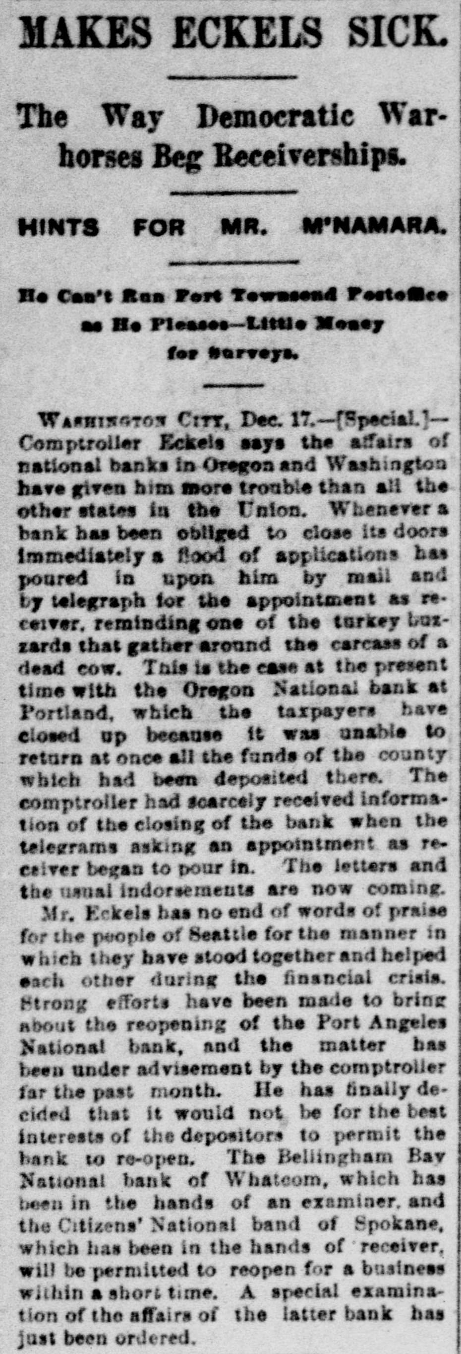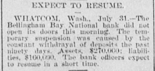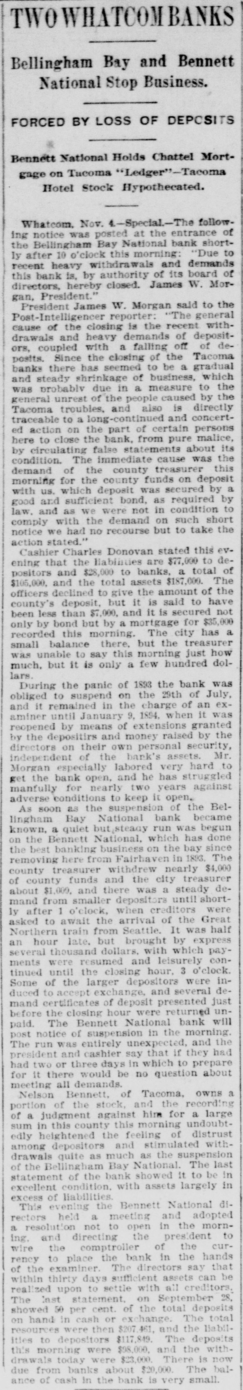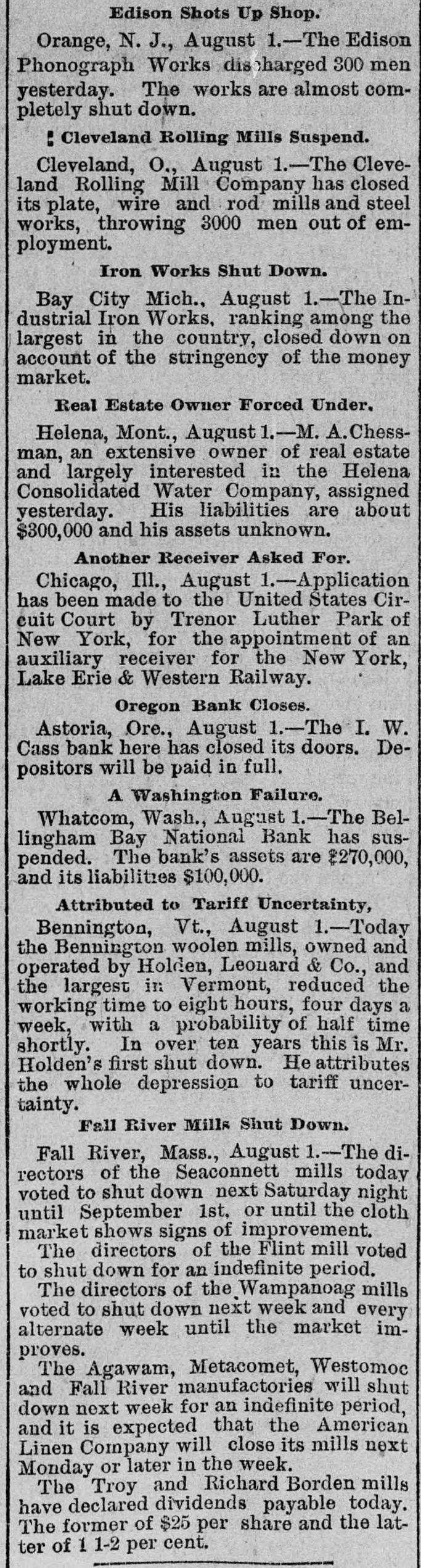 THE FINANCIAL SITUATION. On the 25th the Mitchell bank at Milwaukee closed its doors. Its deposits amount to nearly $8,000,000, assets $9,000,000. At Indianapolis the Indianapolis National bank and the Bank of Commerce closed their doors. Joint liabilities $2,500,000. Three banks at Louisville, Kentucky, also failed on the 25th. They are the Merchants' National, the Fourth National and the Louisville Deposit bank. None of the failures are considered bad ones. Depositors in the two national banks will be paid in full, and the loss to stockholders will not be more than 60 per cent. in either case. The situation on the New York stock exchange on the 28th was critical and a panic was narrowly averted. The news that the Erle railroad had gone into the hands of a receiver was largely responsible for the break in stocks which fell from 1 to 4 points. H. I. Nicholas & Co., brokers, assigned. The First National and Montana National banks of Helena, failed to open Thursday morning. A run followed on theother banks of the city. The run was confined principally to the Merchants' National bank, which paid everybody. They are confident that they will be able to stand the run. The two closed banks have ample assets, but cannot realize on them. The Oregon National bank and the Northwest Loan and Trust company of Portland failed to open their doors on the 27th. A notice on the door says: "Owing to withdrawal of deposits and the Inability to realize on securities this bank is forced to suspend." The First National of Middleboro, Kentucky, closed on the 27th. Two banks at Sparta, Wisconsin, closed, also a bank at Portage. The Ellensburg, Washington, National bank suspended payment. In consequence of a run upon It the Traders' Deposit bank of Mount Sterling, Indiana, suspended. The following banks failed on the 28th: First National at Great Falls, Montana; German National at Washington, Wisconsin; Seymour's Bank at Chippewa Falls, Wisconsin; Chamberlain National at Chamberlain, South Dakota. The publication of the intended action of the New York and Brooklyn savings banks and institutions to put into practice the law entitling them to sixty days' notice from depositors of intended withdrawals of money precipitated a run Saturday. Some of the banks paid the amount In full, and thus sought to restore confidence. Others required notice, the time ranging from ten to ninety days, according to the period specified in the by-laws. The Commercial National, Ainsworth National and Portland Savings bank of Portland, Oregon, closed their doors on the 29th. The following banks also closed on that date: Citizens Savings, Akron, Ohio; First National, Kankakee, Illinois; Commercial, Eau Claire, Wisconsin; Barron Brothers, Lusk, Wyoming. The McNeal & Urban Safe and Lock Company, one of the oldest safe firms in the country, have assigned to Howard Douglass of Cincinnati. Assets, $160,000; liabilities unknown. The firm has been unfortunate in several large contracts, but it Is claimed that it is solvent. The New York clearing-house committee on the 31st authorized the Issue of $2,500,000 more in loan certificates, which brings the total issue outstanding up to $27,975,000. It may be noted that $26,565,000 was the maximum Issue of 1873, but this comparison is really less impressive than it seems, for a very considerable part of this year's New York issues has In practical effect, been provision for Chicago. No banks applied, so the dispatches stated, for loan certificates in the city. A secondary result of the local money scarcity was an absolute want of bids for sterling bills, exchange rates going on some transactions below the year's previous lowest record. The following banks suspended on the 31st: Springfield Savings, at Springfield, Misssouri; First National, Ashland, Wisconsin: First National, Dalles, Oregon: Bellingham Bay National Whatcom lequiring Notice of When drawal of deposits.