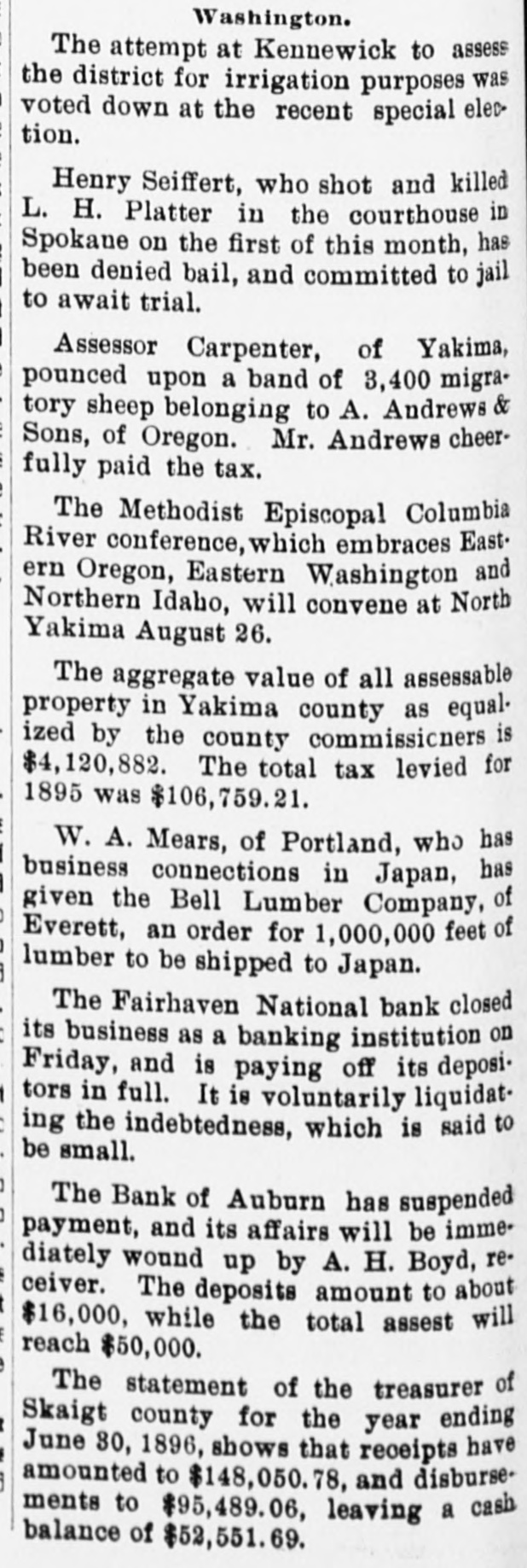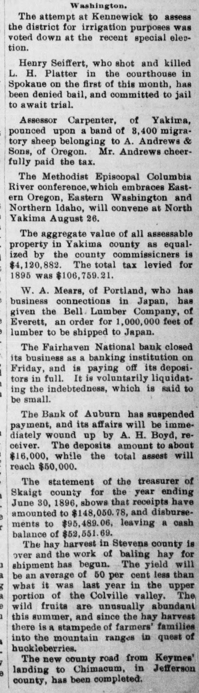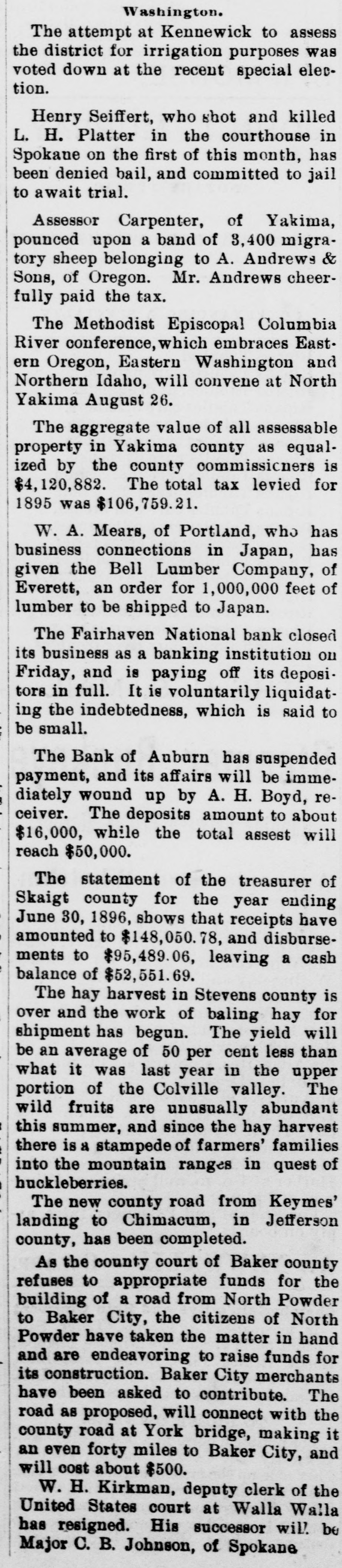 Washington. The attempt at Kennewick to assess the district for irrigation purposes was voted down at the recent special elestion. Henry Seiffert, who shot and killed L. H. Platter in the courthouse in Spokane on the first of this month, has been denied bail, and committed to jail to await trial. Assessor Carpenter, of Yakima, pounced upon a band of 8,400 migratory sheep belonging to A. Andrews & Sons, of Oregon. Mr. Andrews cheerfully paid the tax. The Methodist Episcopal Columbia River conference, which embraces Eastern Oregon, Eastern Washington and Northern Idaho, will convene at North Yakima August 26. The aggregate value of all assessable property in Yakima county as equal. ized by the county commissioners is $4,120,882. The total tax levied for 1895 was $106,759.21. W. A. Mears, of Portland, who has business connections in Japan, has given the Bell. Lumber Company, of Everett, an order for 1,000,000 feet of lumber to be shipped to Japan. The Fairhaven National bank closed its business as a banking institution on Friday, and is paying off its depositors in full. It is voluntarily liquidating the indebtedness, which is said to be small. The Bank of Auburn has suspended payment, and its affairs will be imme) diately wound up by A. H. Boyd, receiver. The deposits amount to about $16,000, while the total assest will reach $50,000. The statement of the treasurer of Skaigt county for the year ending June 30, 1896, shows that receipts have amounted to $148,050.78, and disburseB ments to $95,489.06, leaving a cash balance of $52,551.69. The hay harvest in Stevens county is over and the work of baling hay for a shipment has begun. The yield will a be an average of 50 per cent less than be what it was last year in the upper a portion of the Colville valley. The e wild fruits are unusually abundant 1 this summer, and since the hay harvest there is a stampede of farmers' families into the mountain ranges in quest of buckleberries. The new county road from Keymes' 7 landing to Chimacum, in Jefferson e county, has been completed.