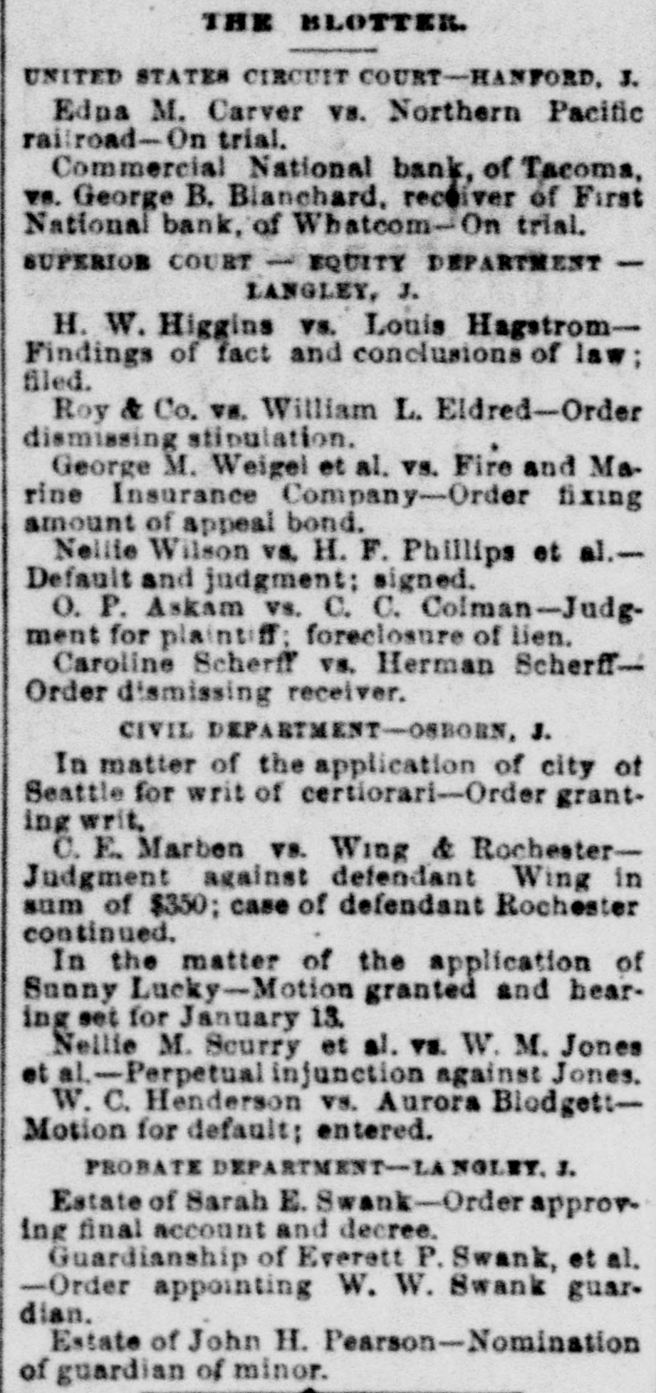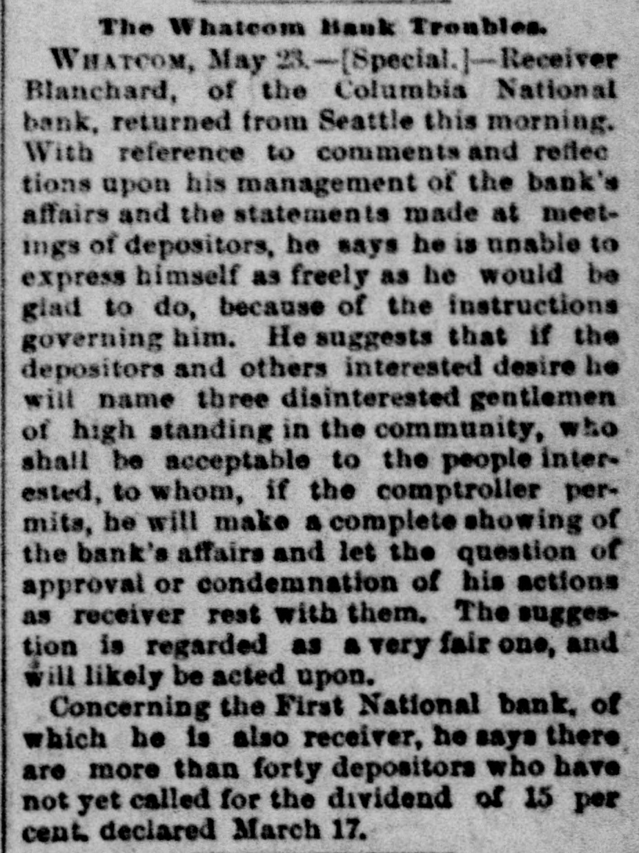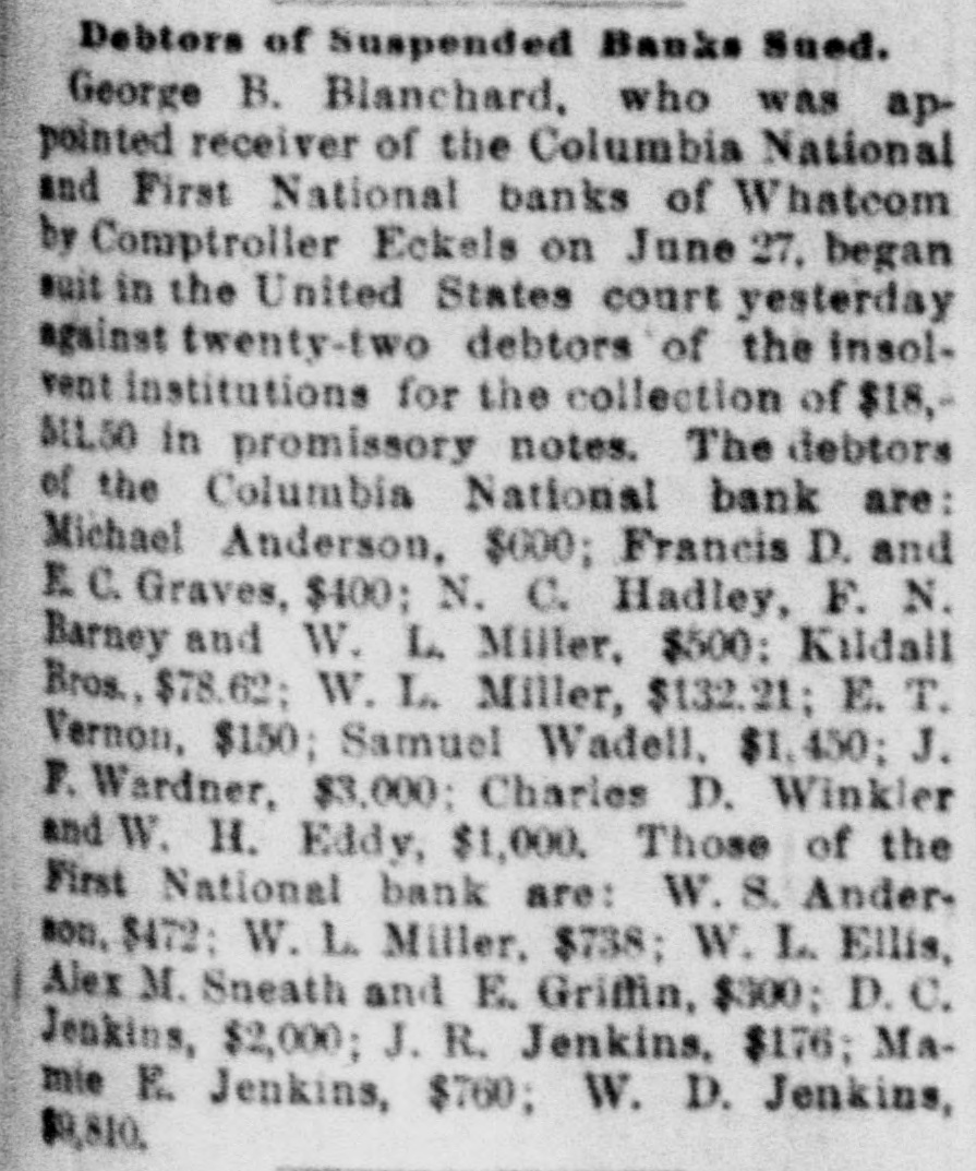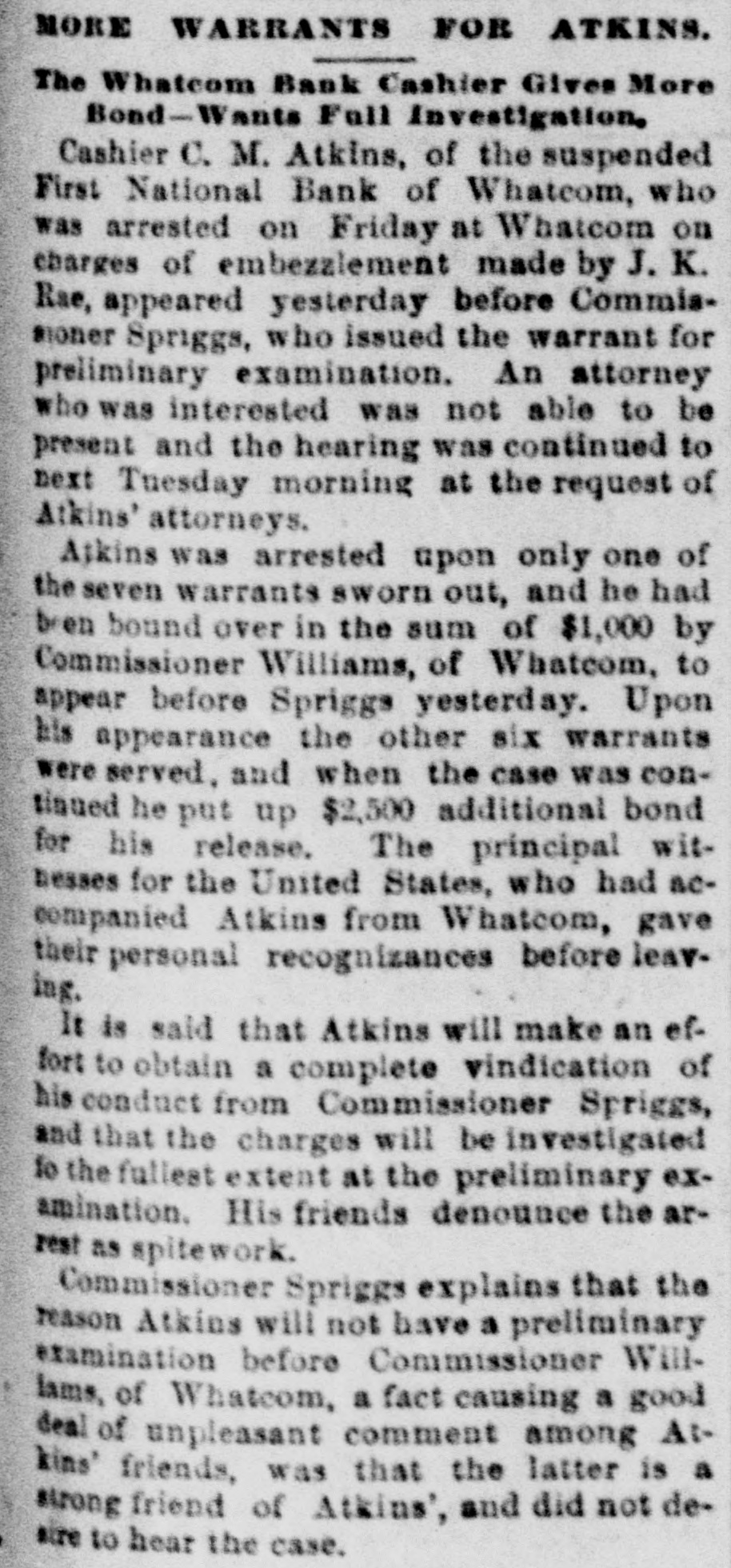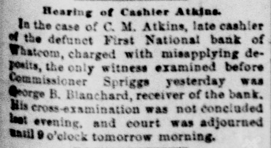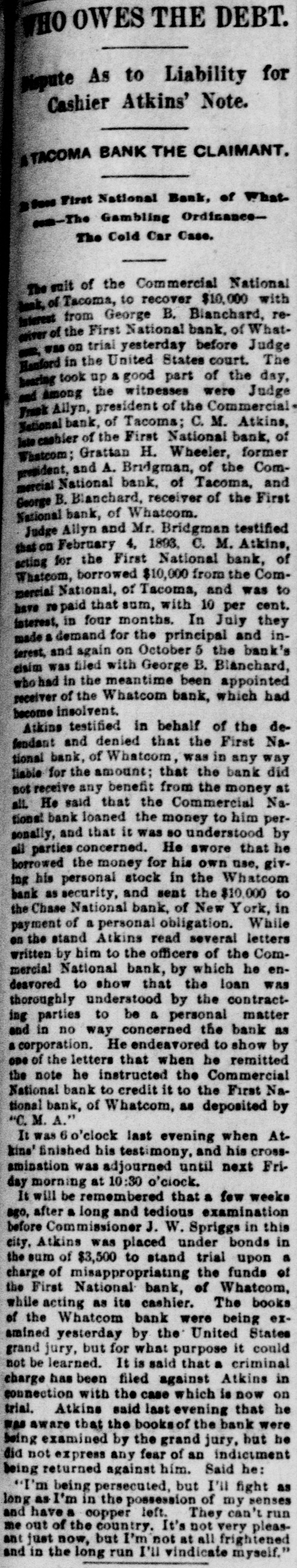 THO OWES THE DEBT. Dispute As to Liability for Cashier Atkins' Note. A TACOMA BANK THE CLAIMANT. First National Bank, of Whateam-The Gambling OrdinanceThe Cold Car Case. of the Commercial National lask, of Tacoma, to recover $10,000 with interest from George B. Blanchard, reof the First National bank, of Whatoriver = was on trial yesterday before Judge Hanford in the United States court. The hearing took up a good part of the day, and Among the witnesses were Judge Frank Allyn, president of the Commercial National bank, of Tacoma; C. M. Atkins, Internabler of the First National bank, of Whatcom; Grattan H. Wheeler, former president, and A. Bridgman, of the Commercial National bank, of Tacoma, and George B. Blanchard, receiver of the First National bank, of Whatcom. Judge Allyn and Mr. Bridgman testified that February 4, 1893, C. M. Atkins, seting for the First National bank, of Whatcom, borrowed $10,000 from the Commercial National, of Tacoma, and was to have repaid that sum, with 10 per cent. interest, in four months. In July they made a demand for the principal and interest, and again on October 5 the bank's claim was filed with George B. Blanchard, who had in the meantime been appointed receiver of the Whatcom bank, which had become insolvent. Atkins testified in behalf of the defendant and denied that the First National bank, of Whatcom, was in any way liable for the amount; that the bank did not receive any benefit from the money at all. He said that the Commercial Natione! bank loaned the money to him personally, and that it was so understood by all parties concerned. He swore that he borrowed the money for his own use, giving his personal stock in the Whatcom bank as security, and sent the $10,000 to the Chase National bank, of New York, in payment of a personal obligation. While on the stand Atkins read several letters written by him to the officers of the Commercial National bank, by which he endeavored to show that the loan was thoroughly understood by the contracting parties to be a personal matter and in no way concerned the bank as a corporation. He endeavored to show by OD# of the letters that when he remitted the note he instructed the Commercial National bank to credit it to the First National bank, of Whatcom, as deposited by "C. M. A." It was 6 o'clock last evening when Atkins' finished his testimony, and his crossamination was adjourned until next Friday morning at 10:30 o'clock. It will be remembered that a few weeks ago, after a long and tedious examination before Commissioner J. W. Spriggs in this city, Atkins was placed under bonds in the sum of $3,500 to stand trial upon a charge of misappropriating the funds of the First National bank, of Whatcom, while acting as its cashier. The books of the Whatcom bank were being examined yesterday by the United States grand jury, but for what purpose it could not be learned. It is said that a criminal charge has been filed against Atkins in connection with the case which is now on trial. Atkins said last evening that he was aware that the booksof the bank were being examined by the grand jury, but he did not express any fear of an indictment being returned against him. Said he: "I'm being persecuted, but I'll fight as long as I'm in the possession of my senses and have a copper left. They can't run out of the Esta