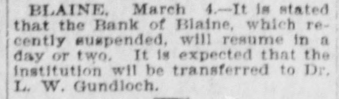 BLAINE. March 4.-It is stated that the Bank of Blaine, which recently suspended, will resume in a day or two, It is expected that the institution will be transferred to Dr. L. W. Gundloch. i