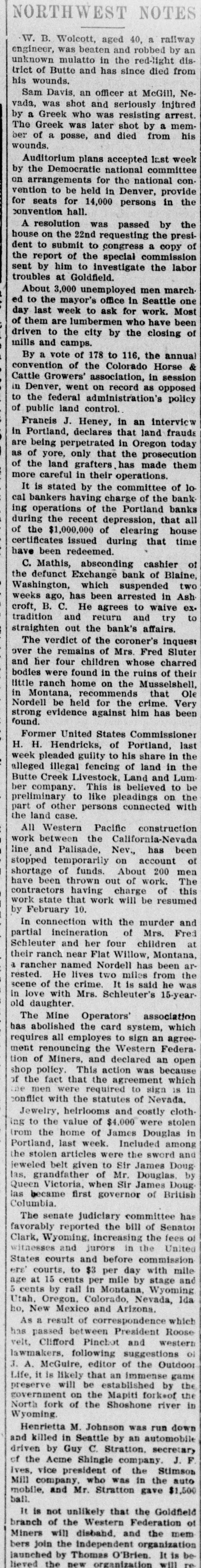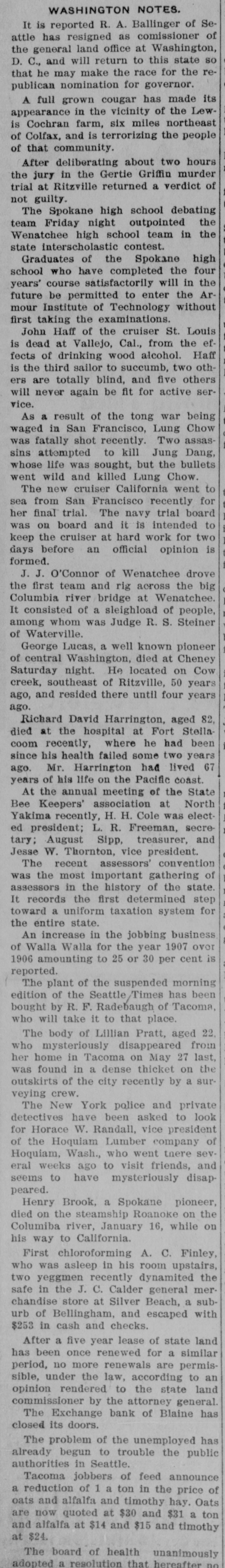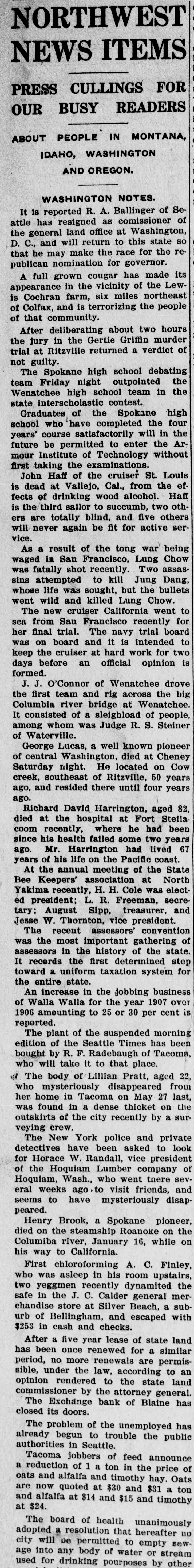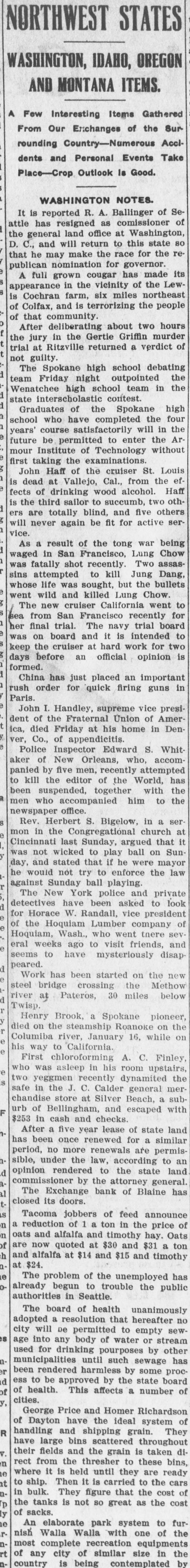 NORTHWEST STATES WASHINGTON, IDAHO, OREGON AND MONTANA ITEMS. A Few Interesting Items Gathered From Our Erichanges of the Sur rounding Country-Numerous Accldents and Personal Events Take Place-Crop Outlook is Good. WASHINGTON NOTES. It is reported R. A. Ballinger of Seattle has resigned as comissioner of the general land office at Washington, D. C., and will return to this state so that he may make the race for the republican nomination for governor. A full grown cougar has made its appearance in the vicinity of the Lewis Cochran farm, six miles northeast of Colfax, and is terrorizing the people of that community. After deliberating about two hours the jury in the Gertie Griffin murder trial at Ritzville returned a verdict of not guilty. The Spokane high school debating team Friday night outpointed the Wenatchee high school team in the state interscholastic contest. Graduates of the Spokane high school who have completed the four years' course satisfactorily will in the future be permitted to enter the Armour Institute of Technology without first taking the examinations. John Haff of the cruiser St. Louis is dead at Vallejo, Cal., from the effects of drinking wood alcohol. Haff is the third sailor to succumb, two others are totally blind, and five others will never again be fit for active service. As a result of the tong war being waged in San Francisco, Lung Chow was fatally shot recently. Two assassins attempted to kill Jung Dang, whose life was sought, but the bullets went wild and killed Lung Chow. The new cruiser California went to sea from San Francisco recently for her final trial. The navy trial board was on board and it is intended to keep the cruiser at hard work for two days before an official opinion is formed. China has just placed an important rush order for quick firing guns in Paris. John I. Handley, supreme vice president of the Fraternal Union of America, died Friday at his home in Denver, Co., of appendicitis. Police Inspector Edward S. Whitaker of New Orleans, who, accompanied by five men, recently attempted to kill the editor of the World, has been suspended, together with the men who accompanied him to the newspaper office. Rev. Herbert S. Bigelow, in a sermon in the Congregational church at Cincinnati last Sunday, argued that it was not wicked to play ball on Sunday, and stated that if he were mayor he would not try to enforce the law against Sunday ball playing. The New York police and private detectives have been asked to look for Horace W. Randall, vice president of the Hoquiam Lumber company of Hoquiam, Wash., who went there several weeks ago to visit friends, and seems to have mysteriously disappeared. 1 Work has been started on the new steel bridge crossing the Methow river at Pateros, 30 miles below d Twisp. Henry Brook, a Spokane pioneer, died on the steamship Roanoke on the Columiba river, January 16, while on his way to California. First chloroforming A. C. Finley, who was asleep in his room upstairs, two yeggmen recently dynamited the safe in the J. C. Calder general merchandise store at Silver Beach, a suburb of Bellingham, and escaped with $253 in cash and checks. After a five year lease of state land has been once renewed for a similar period, no more renewals are permisà sible, under the law, according to an d opinion rendered to the state land commissioner by the attorney general. 11 The Exchange bank of Blaine has closed its doors. 4 Tacoma jobbers of feed announce n a reduction of 1 a ton in the price of n oats and alfalfa and timothy hay. Oats of are now quoted at $30 and $31 a ton h and alfalfa at $14 and $15 and timothy at $24. e The problem of the unemployed has already begun to trouble the public authorities in Seattle. The board of health unanimously adopted a resolution that hereafter no city will De permitted to empty sewis age into any body of water or stream used for drinking pourposes by other