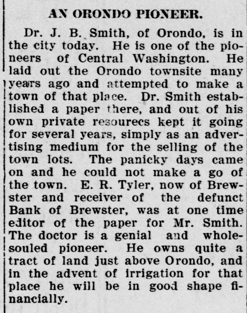 # AN ORONDO PIONEER. Dr. J. B. Smith, of Orondo, is in the city today. He is one of the pioneers of Central Washington. He laid out the Orondo townsite many years ago and attempted to make a town of that place. Dr. Smith established a paper there, and out of his own private resourecs kept it going for several years, simply as an advertising medium for the selling of the town lots. The panicky days came on and he could not make a go of the town. E. R. Tyler, now of Brewster and receiver of the defunct Bank of Brewster, was at one time editor of the paper for Mr. Smith. The doctor is a genial and whole-souled pioneer. He owns quite a tract of land just above Orondo, and in the advent of irrigation for that place he will be in good shape financially.