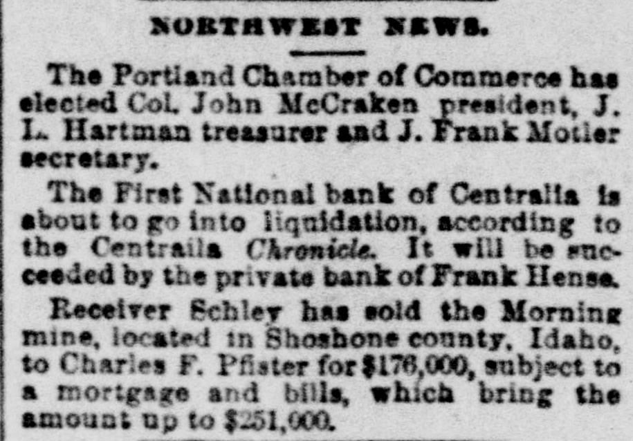 NORTHWEST NEWS. The Portland Chamber of Commerce has elected Col. John McCraken president, J. L Hartman treasurer and J. Frank Motler secretary. The First National bank of Centralia is about to go into liquidation, according to the Centrails Chronicle. It will be succeeded by the private bank of Frank Hense. Receiver Schley has sold the Morning mine, located in Shoshone county, Idaho, to Charles F. Pfister for $176,000, subject to a mortgage and bills, which bring the amount up to $251,000.