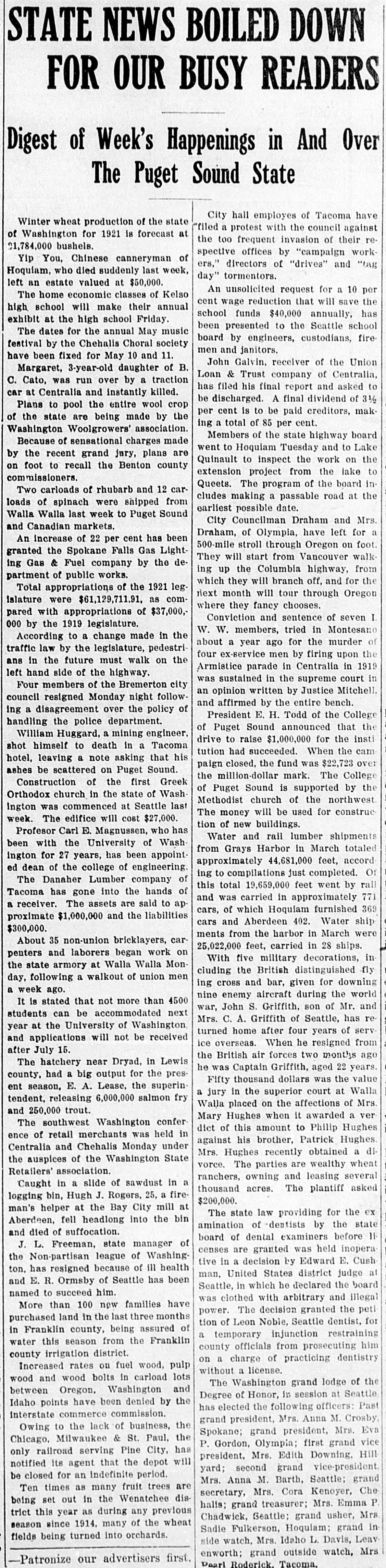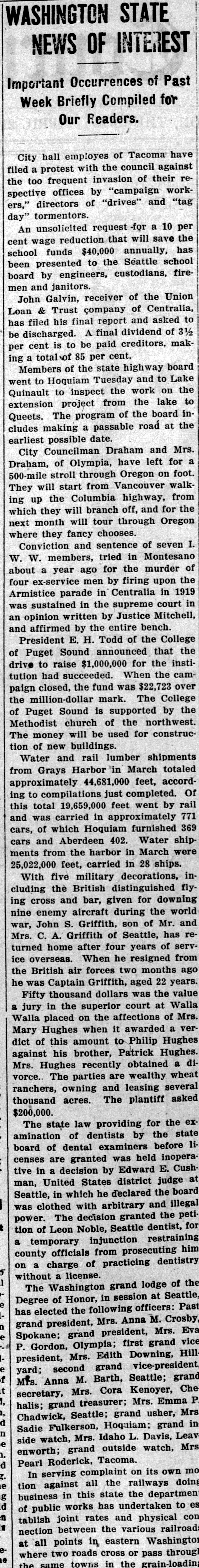 WASHINGTON STATE NEWS OF INTEREST Important Occurrences of Past Week Briefly Compiled for Our Readers. City hall employes of Tacoma have filed a protest with the council against the too frequent invasion of their work- respective offices by "campaign "tag ers," directors of "drives" and day" tormentors. An unsolicited request -for a 10 per wage reduction that will save has the school cent funds $40,000 annually, been presented to the Seattle school fireboard by engineers, custodians, men and janitors. John Galvin, receiver of the Union Loan & Trust company of Centralia, to has filed his final report and asked be discharged. A final dividend of mak 3 1/2 per cent is to be paid creditors, ing a total of 85 per cent. Members of the state highway board went to Hoquiam Tuesday and to Lake the Quinault to inspect the work on to extension project from the lake Queets. The program of the board includes making a passable road at the earliest possible date. City Councilman Draham and Mrs. a of Olympia, stroll through on foot. 500-mile Draham, have Oregon left for They will start from Vancouver walk ing up the Columbia highway, from which they will branch off, and for the next month will tour through Oregon where they fancy chooses. Conviction and sentence of seven I. W. W. members, tried in Montesano about a year ago for the murder of four ex-service men by firing upon the Armistice parade in Centralia in 1919 was sustained in the supreme court in an opinion written by Justice Mitchell, and affirmed by the entire bench. President E. H. Todd of the College of Puget Sound announced that the drive to raise $1,000,000 for the institution had succeeded. When the campaign closed, the fund was $22,723 over the million-dollar mark. The College of Puget Sound is supported by the Methodist church of the northwest. The money will be used for construction of new buildings. Water and rail lumber shipments from Grays Harbor in March totaled approximately 44,681,000 feet, accordOf ing to compilations just completed. this total 19,659,000 feet went by rail and was carried in approximately 771 cars, of which Hoquiam furnished 369 cars and Aberdeen 402. Water shipments from the harbor in March were 25,022,000 feet, carried in 28 ships. With five military decorations, in cluding the British distinguished fly ing cross and bar, given for downing nine enemy aircraft during the world John S. Griffith, son of Mr. and A. Griffith of re war, Mrs. C. Seattle, of has turned home after four years servWhen he from air forces two ago ice the overseas. British resigned months he was Captain Griffith, aged 22 years. Fifty thousand dollars was the value a jury in the superior court at Walla Walla placed on the affections of Mrs. Mary Hughes when it awarded a verdict of this amount to Philip Hughes his brother, recently a against Mrs. Hughes Patrick obtained Hughes di vorce. The parties are wealthy wheat owning and several acres. The ranchers, thousand leasing plantiff asked $200,000. The state law providing for the ex amination of dentists by the state li board of dental examiners before censes are granted was held inoperative in a decision by Edward E. Cush man, United States district judge at Seattle, in which he declared the board was clothed with arbitrary and illegal power. The decision granted the peti tion of Leon Noble, Seattle dentist, for a temporary injunction restraining county officials from prosecuting him on a charge of practicing dentistry without a license. I The Washington grand lodge of the e Degree of Honor, in session at Seattle has elected the following officers: Past grand president, Mrs. Anna M. Crosby , Spokane; grand president, Mrs. Eva P. Gordon, Olympia; first grand vice president, Mrs. Edith Downing, Hill second grand vice-president f M. Barth, t yard; Mfs. Anna Seattle; Kenoyer, grand Che Mrs. Cora I, treasurer; Mrs. , Seattle; grand secretary, halis; Chadwick, grand usher, Emma Mrs P. d Sadie Fulkerson, Hoquiam; grand in n Mrs. Idaho L. e grand enworth; side watch, outside Davis, watch, Leav Mrs . Pearl Roderick, Tacoma. d In serving complaint on its own mo g e tion against all the railways doing in this state the department g d works has to a joint rates and con business tablish of public undertaken physical between the various all in eastern nection at points Washington railroads through where two roads cross or pass e the same towns in the grain-loading