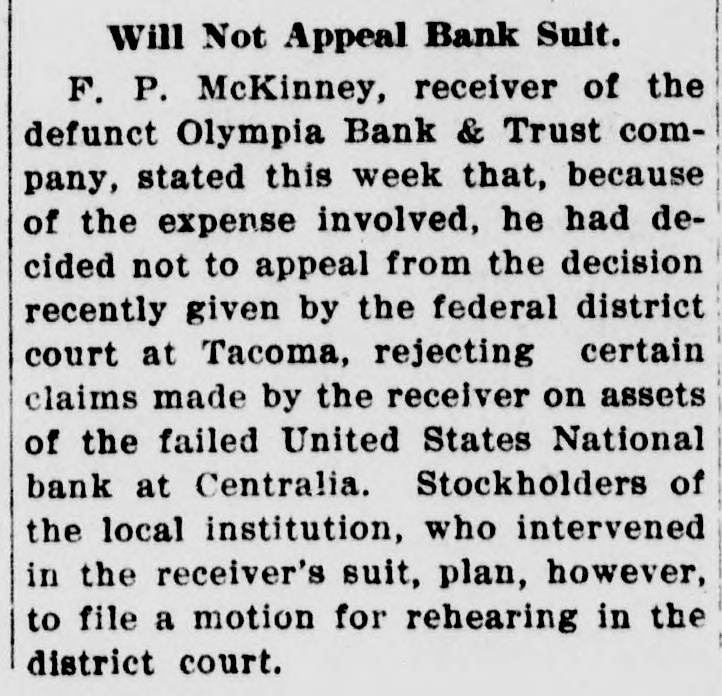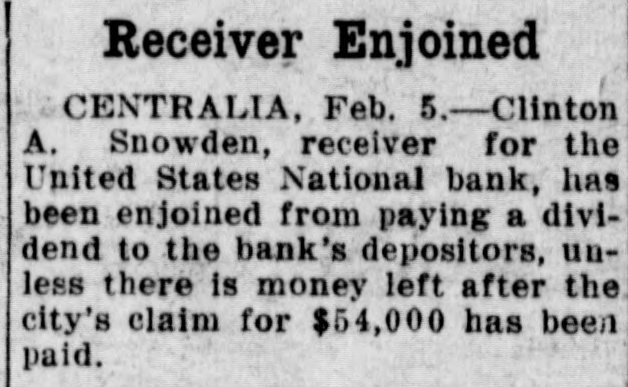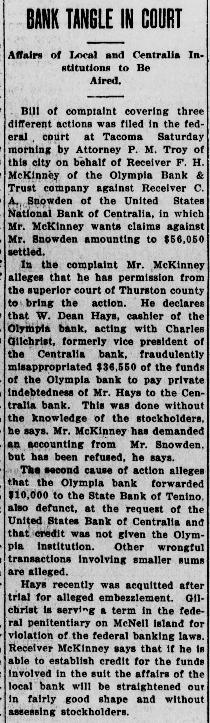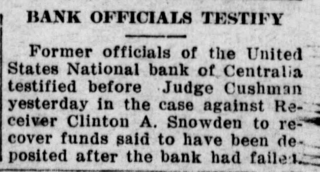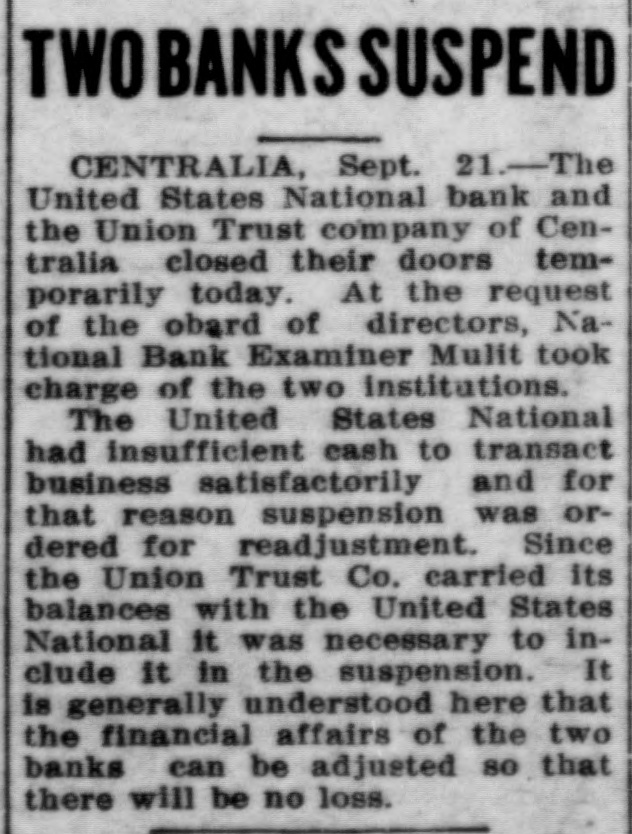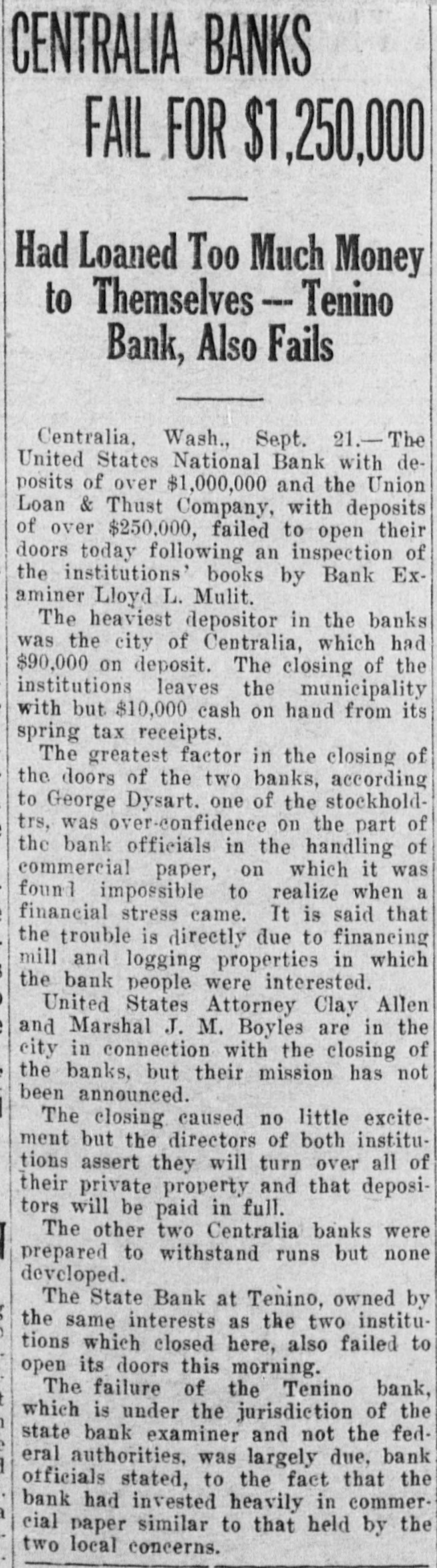 CENTRALIA BANKS FAIL FOR $1,250,000 Had Loaned Too Much Money to Themselves --- Tenino Bank, Also Fails Centralia, Wash., Sept. 21.-The United States National Bank with deposits of over $1,000,000 and the Union Loan & Thust Company, with deposits of over $250,000, failed to open their doors today following an inspection of the institutions' books by Bank Examiner Lloyd L. Mulit. The heaviest depositor in the banks was the city of Centralia, which had $90,000 on deposit. The closing of the institutions leaves the municipality with but $10,000 cash on hand from its spring tax receipts. The greatest factor in the closing of the doors of the two banks, according to George Dysart. one of the stockholdtrs, was over-confidence on the part of the bank officials in the handling of commercial paper, on which it was found impossible to realize when a financial stress came. It is said that the trouble is directly due to financing mill and logging properties in which the bank people were interested. United States Attorney Clay Allen and Marshal J. M. Boyles are in the city in connection with the closing of the banks, but their mission has not been announced. The closing caused no little excitement but the directors of both institutions assert they will turn over all of their private property and that depositors will be paid in full. The other two Centralia banks were prepared to withstand runs but none developed. The State Bank at Tenino, owned by the same interests as the two institutions which closed here, also failed to open its doors this morning. The failure of the Tenino bank, which is under the jurisdiction of the state bank examiner and not the federal authorities, was largely due, bank officials stated, to the fact that the bank had invested heavily in commercial paper similar to that held by the two local concerns.