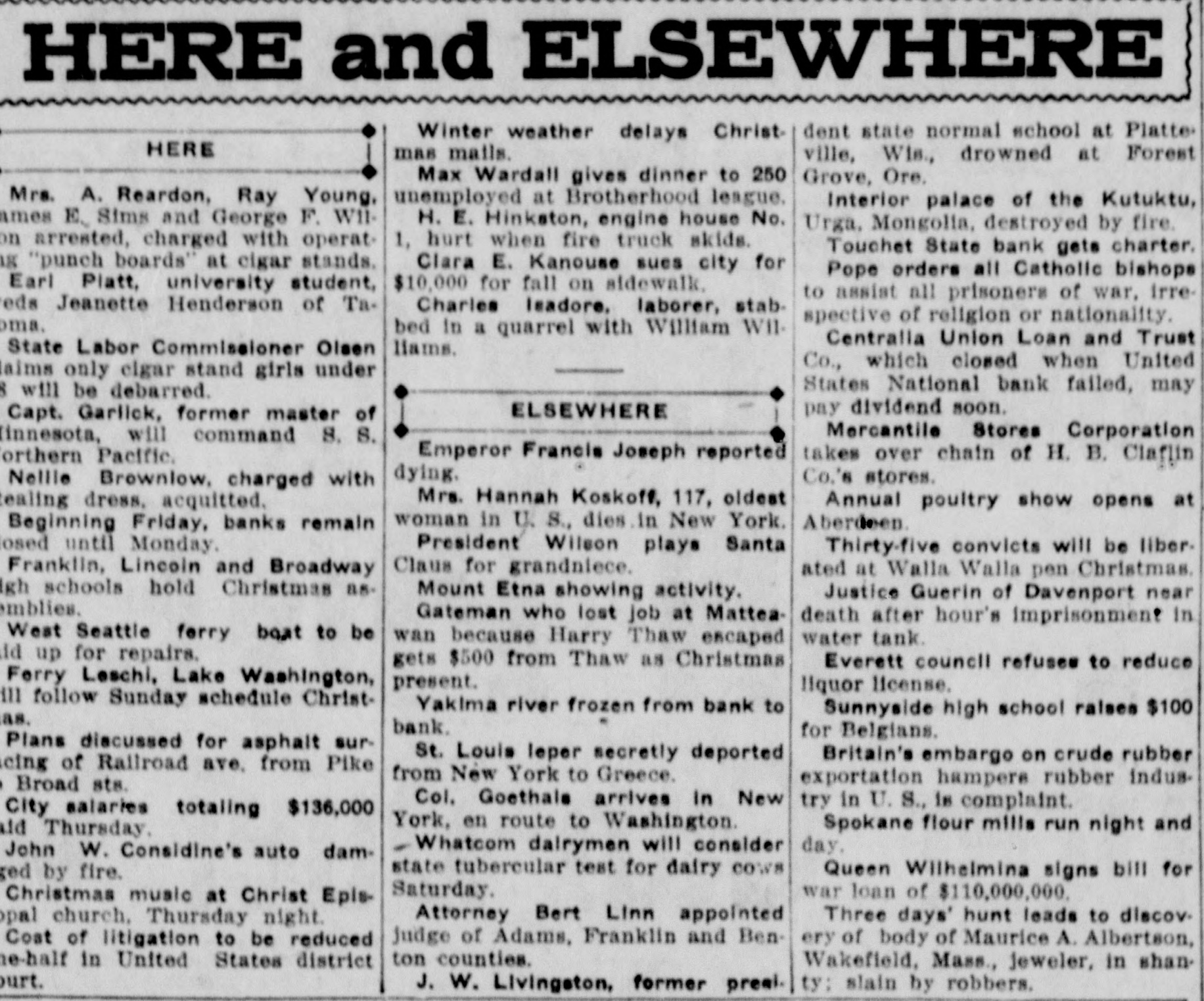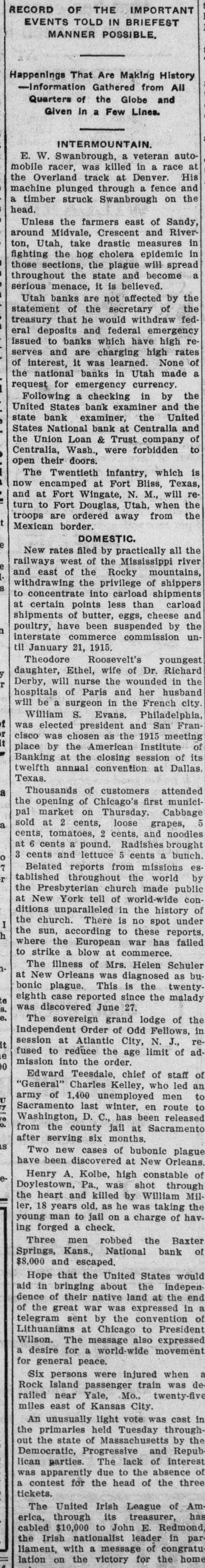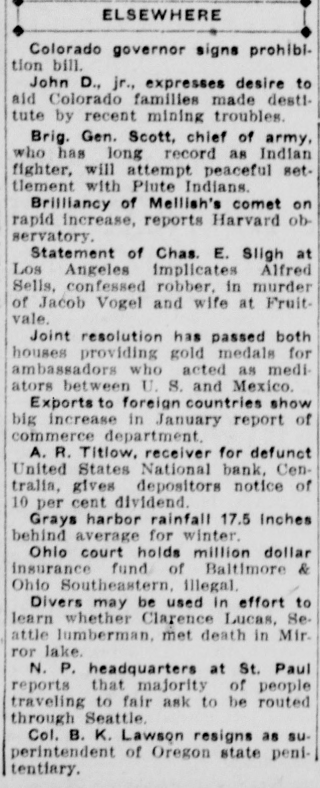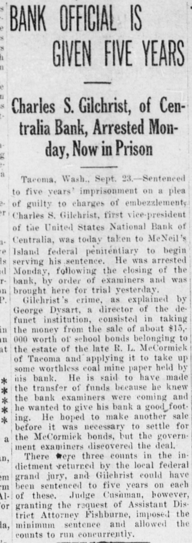 CENTRALIA BANKS FAIL FOR $1,250,000 Had Loaned Too Much Money to Themselves --- Tenino Bank, Also Fails Centralia, Wash., Sept. 21.-The United States National Bank with deposits of over $1,000,000 and the Union Loan & Thust Company, with deposits of over $250,000, failed to open their doors today following an inspection of the institutions' books by Bank Examiner Lloyd L. Mulit. The heaviest depositor in the banks was the city of Centralia, which had $90,000 on deposit. The closing of the institutions leaves the municipality with but $10,000 cash on hand from its spring tax receipts. The greatest factor in the closing of the doors of the two banks, according to George Dysart. one of the stockholdtrs, was over-confidence on the part of the bank officials in the handling of commercial paper, on which it was found impossible to realize when a financial stress came. It is said that the trouble is directly due to financing mill and logging properties in which the bank people were interested. United States Attorney Clay Allen and Marshal J. M. Boyles are in the city in connection with the closing of the banks, but their mission has not been announced. The closing caused no little excitement but the directors of both institutions assert they will turn over all of their private property and that depositors will be paid in full. The other two Centralia banks were prepared to withstand runs but none developed. The State Bank at Tenino, owned by the same interests as the two institutions which closed here, also failed to open its doors this morning. The failure of the Tenino bank, which is under the jurisdiction of the state bank examiner and not the federal authorities, was largely due, bank officials stated, to the fact that the bank had invested heavily in commercial paper similar to that held by the two local concerns.