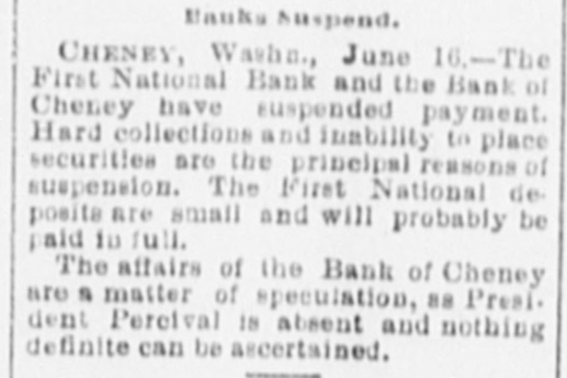 More Prosperity in Washington. Cheney, Wn., June 16.-The First National bank and the Bank of Cheney have suspended payment. Hard collections and inability to place securities are the principal reasons for the suspension. The First National deposits are small and will probably be paid in full. The affairs of the Bank of Cheney are a matter of speculation, as President Percival is absent and nothing definite can be ascertained.