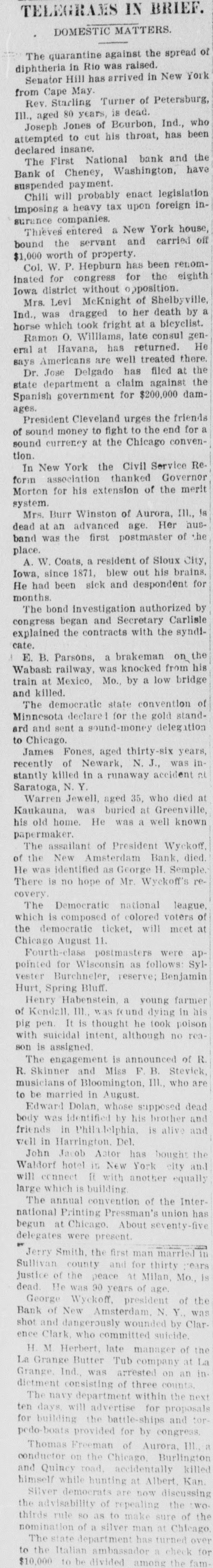 attempted to cut his throat, has been declared insane. The First National bank and the Bank of Cheney, Washington, have suspended payment. Chili will probably enact legislation imposing a heavy tax upon foreign insurance companies. Thieves entered a New York house, bound the servant and carried off $1,000 worth of property. Col. W. P. Hepburn has been renominated for congress for the eighth Iowa district without opposition. Mrs. Levi McKnight of Shelbyville, Ind., was dragged to her death by a horse which took fright at a bicyclist. Ramon O. Williams, late consul general at Havana, has returned. He says Americans are well treated there. Dr. Jose Delgado has filed at the state department a claim against the Spanish government for $200,000 damages. President Cleveland urges the friends of sound money to fight to the end for a sound currency at the Chicago convention. In New York the Civil Service Reform association thanked Governor Morton for his extension of the merit system. Mrs. Burr Winston of Aurora, III., is dead at an advanced age. Her husband was the first postmaster of the place. A. W. Coats, a resident of Sloux City, Iowa, since 1871, blew out his brains. He had been sick and despondent for months. The bond investigation authorized by congress began and Secretary Carlisle explained the contracts with the syndicate. I E. B. Parsons, a brakeman on_ the Wabash railway, was knocked from his train at Mexico, Mo., by a low bridge and killed. The democratic state convention of Minnesota declared for the gold standard and sent a sound-money delegation to Chicago. James Fones, aged thirty-six years, recently of Newark, N. J., was instantly killed in a runaway accident nt Saratoga, N. Y. Warren Jewell, aged 35, who died at Kaukauna, was buried at Greenville, his old home. He was a well known papermaker. The assailant of President Wyckoff, of the New Amsterdam Bank, died. He was identified as George H. Semple. There is no hope of Mr. Wyckoff's recovery. The Democratic national league, which is composed of colored voters of the democratic ticket, will meet at Chicago August 11. Fourth-class postmasters were appointed for Wisconsin as follows: Sylvester Burchneler, reserve; Benjamin Hurt, Spring Bluff. Henry Habenstein, a young farmer of Kendall, III., was found dying in his pig pen. It is thought he took poison with suicidal intent, although no reason is assigned. The engagement is announced of R. R. Skinner and Miss F. B. Stevick, musicians of Bloomington, III., who are to be married in August. Edward Dolan, whose supposed dead body was identified by his brother and friends in Philadelphia, is alive and well in Harrington. Del. John Jacob Actor has bought the Waldorf hotel in New York city and will connect it with another equally large which is building. The annual convention of the International Printing Pressman's union has begun at Chicago. About seventy-five delegates were present. Jerry Smith, the first man married in Sullivan county and for thirty years justice of the peace at Milan, Mo., is dead. He was 90 years of age, George Wyckoff, president of the Bank of New Amsterdam, N. Y., was shot and dangerously wounded by Clarence Clark, who committed suicide. H. M Herbert, late manager of the La Grange Butter Tub company at La Grange, Ind., was arrested on an in. dictment consisting of three counts. The navy department within the next ten days. will advertise for proposals for building the battle-ships and torpedo-boats provided for by congress. Thomas Freeman of Aurora, III. a conductor on the Chicago, Burlington