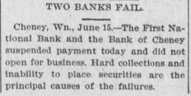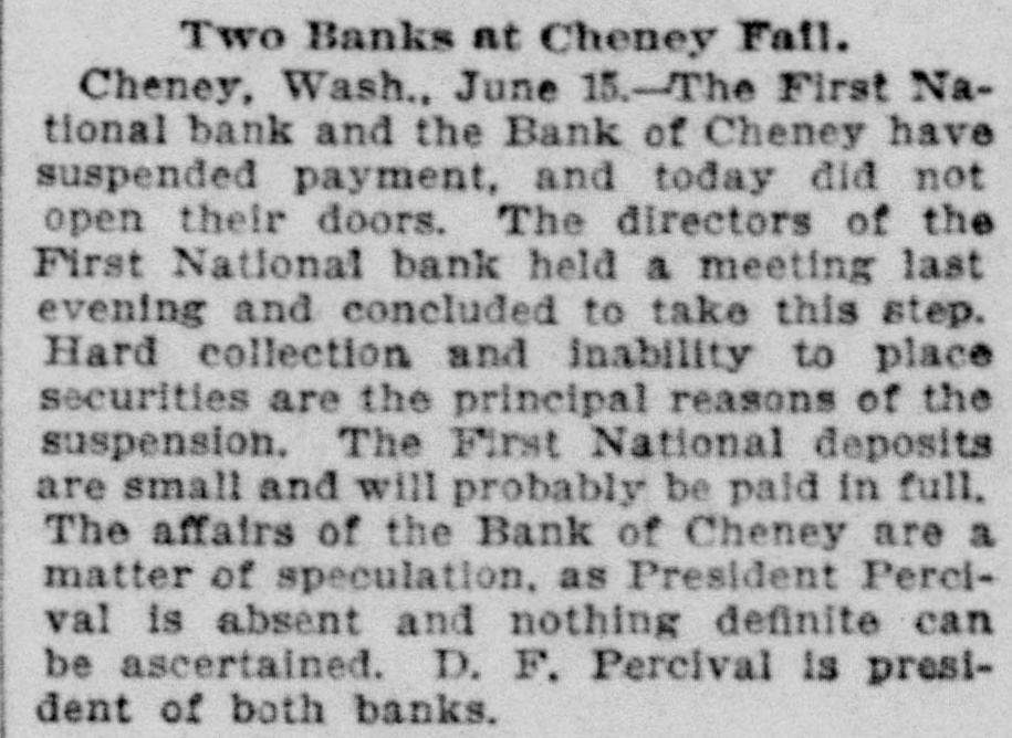 Two Banks at Cheney Fail. Cheney, Wash., June 15.-The First National bank and the Bank of Cheney have suspended payment, and today did not open their doors. The directors of the First National bank held a meeting last evening and concluded to take this step. Hard collection and inability to place securities are the principal reasons of the suspension. The First National deposits are small and will probably be paid in full. The affairs of the Bank of Cheney are a matter of speculation, as President Percival is absent and nothing definite can be ascertained. D. F. Percival is president of both banks.