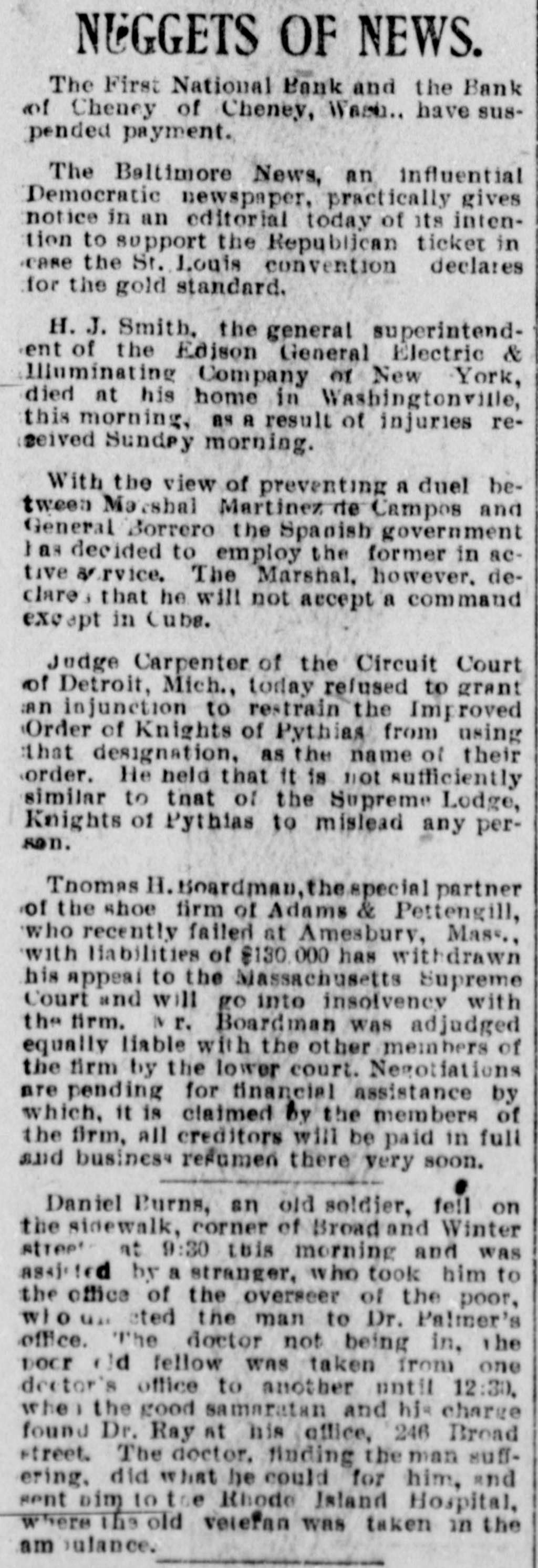NUGGETS OF NEWS. The First National Bank and the Bank of Cheney of Cheney, Wash.. have suspended payment. The Beltimore News, an influential Democratic newspaper, practically gives notice in an editorial today of its intention to support the Republican ticket in case the St. Louis convention declares for the gold standard. H. J. Smith, the general superintendent of the Edison General Electric & Illuminating Company of New York, died at his home in Washingtonville, this morning, as A result of injuries rereived Sunday morning. With the view of preventing a duel between Marshal Martinez de Campos and General Borrero the Spanish government has decided to employ the former in active arvice. The Marshal, however. declare, that he will not accept a command except in Cubs. Judge Carpenter of the Circuit Court of Detroit, Mich., today refused to grant :An injunction to restrain the Improved Order of Knights of Pythias from using that designation, as the name of their order. He held that it is not sufficiently similar to that of the Supreme Lodge, Knights of Pythias to mislead any person. Thomas H. Boardman, the special partner of the shoe firm of Adams & Pettengill, who recently failed at Amesbury, Mass., with liabilities of $130.000 has withdrawn his appeal to the Massachusetts Supreme Court and will go into insolvency with the firm. Mr. Boardman was adjudged equally liable with the other meinhers of the firm by the lower court. Negotiations are pending for financial assistance by which, it is claimed by the members of the firm, all creditors will be paid in full and business resumen there very soon. Daniel Burns, an old soldier, fell on the sidewalk, corner of Broad and Winter street at 9:30 this morning and was assisted by a stranger, who took him to the office of the overseer of the poor, wio un sted the man to Dr. Palmer's office. The doctor not being in, the Door dd fellow was taken from one dector's office to another until 12:30, when the good samaratan and his charge found Dr. Ray at his office, 246 Broad street. The doctor, finding the man suffering, did what he could for him, and sent Dim to toe Rhode Island Hospital, where the old velefan was taken in the am vulance.