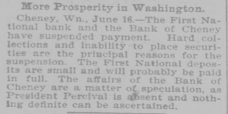 More Prosperity in Washington. Cheney, Wn., June 16.-The First National bank and the Bank of Cheney have suspended payment. Hard collections and inability to place securities are the principal reasons for the suspension. The First National deposits are small and will probably be paid in full. The affairs of the Bank of Cheney are a matter of speculation, as President Percival is absent and nothing definite can be ascertained.